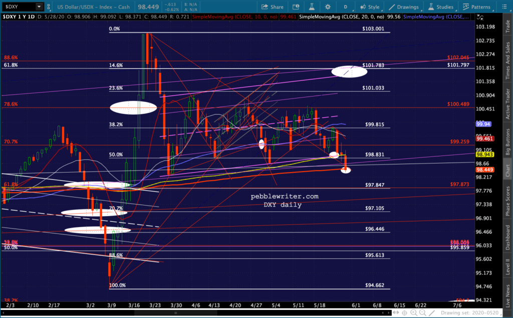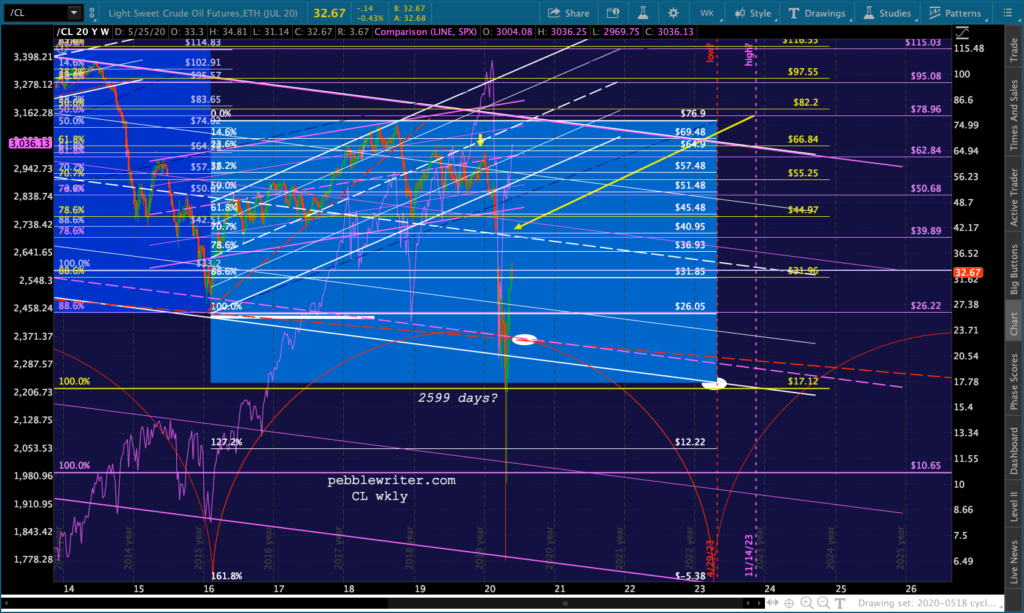 Note that a reversal to 3047 would backtest SPX’s 2.618, the SMA5 200, and that little red TL on ES. In other words, it would leave things very unsettled.