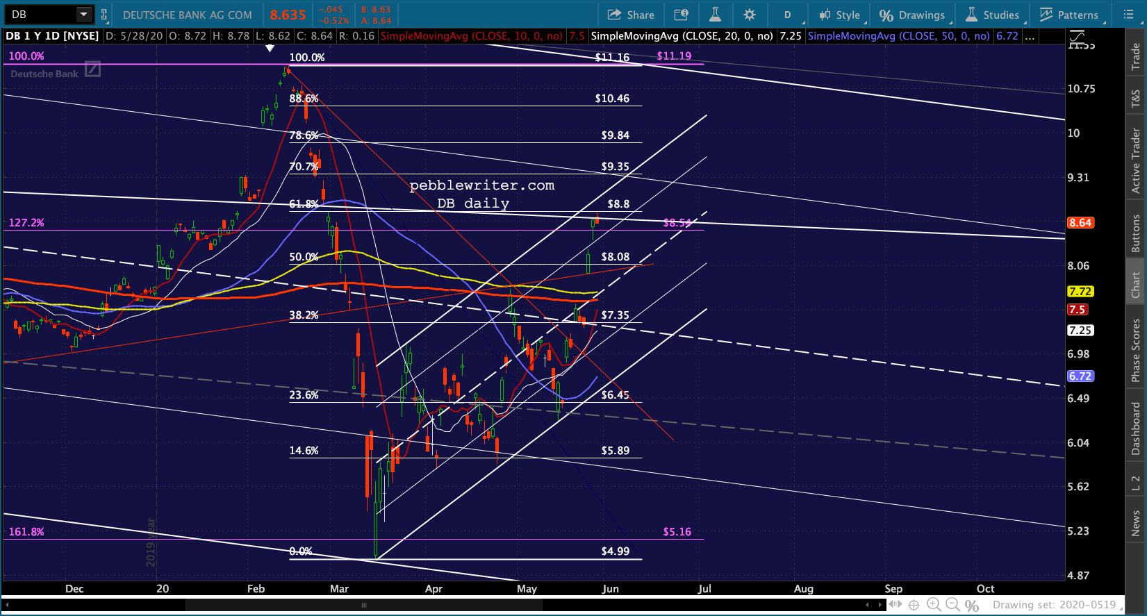 BTW, DB came within 2 cents of its .618 this morning, reaching 8.78 and backtesting a broken channel. This is a nice short with easy stops with an initial target of the SMA200 at 7.62 and additional targets at 7.35 and 7.19.