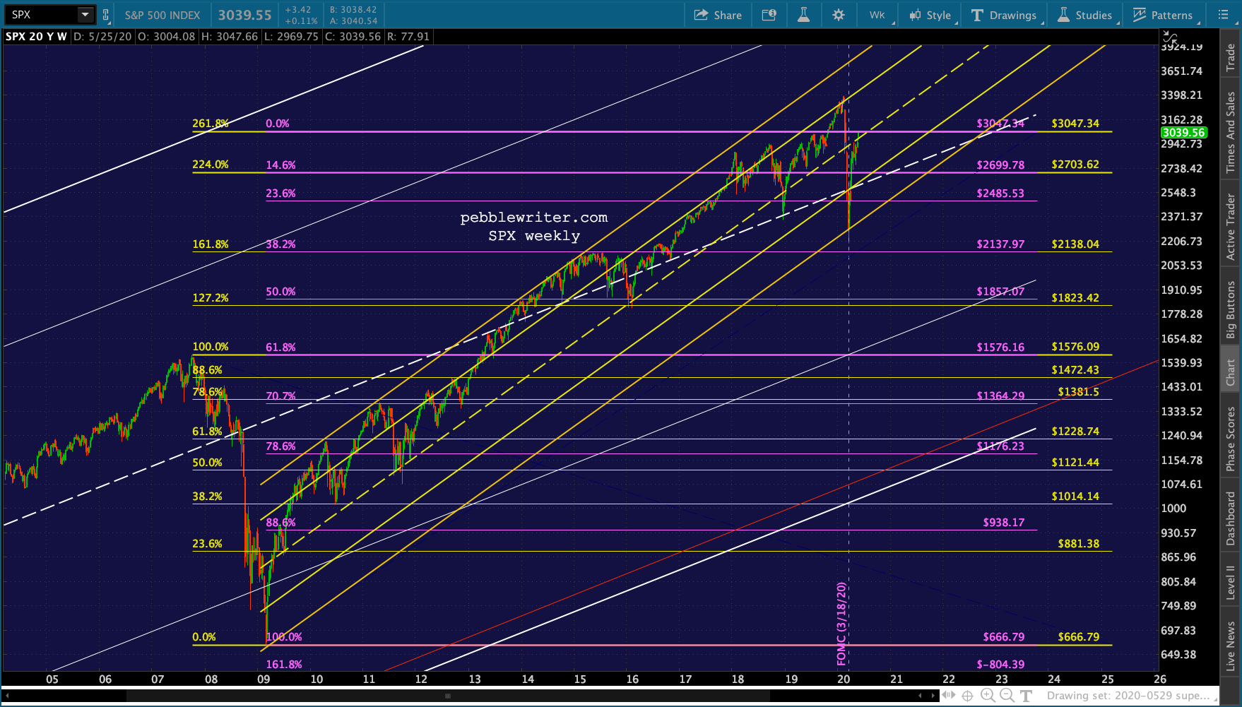 The 2.618 is one of the last Fib levels of resistance that should matter. I thought it would come into play last October, as a reversal at the yellow 2.618 at 3047.34 would have placed the resulting purple .618 right at the 2007 highs.