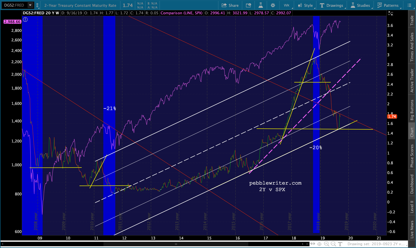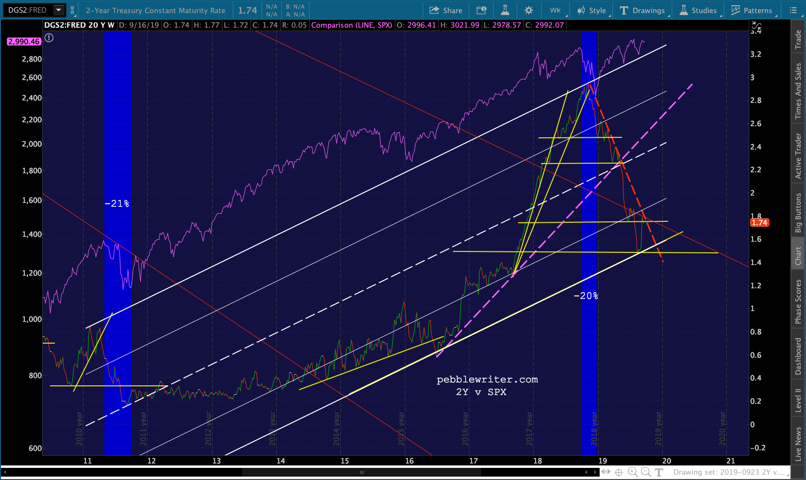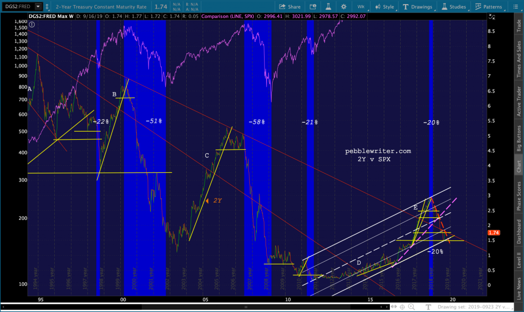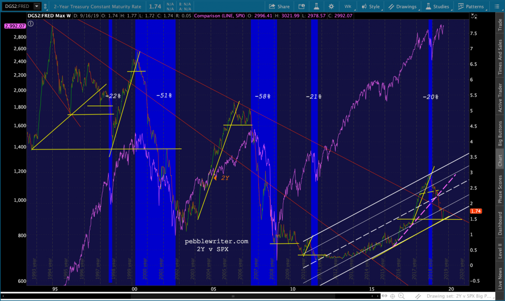 The dashed purple TL is analogous to the rising yellow TLs. A break — which occurred when the 2Y dropped through the white channel midline and one of the yellow horizontal support lines — was bearish for stocks.