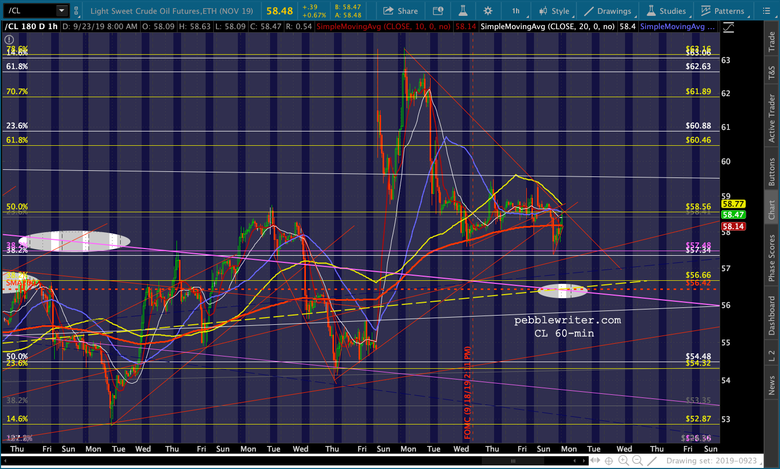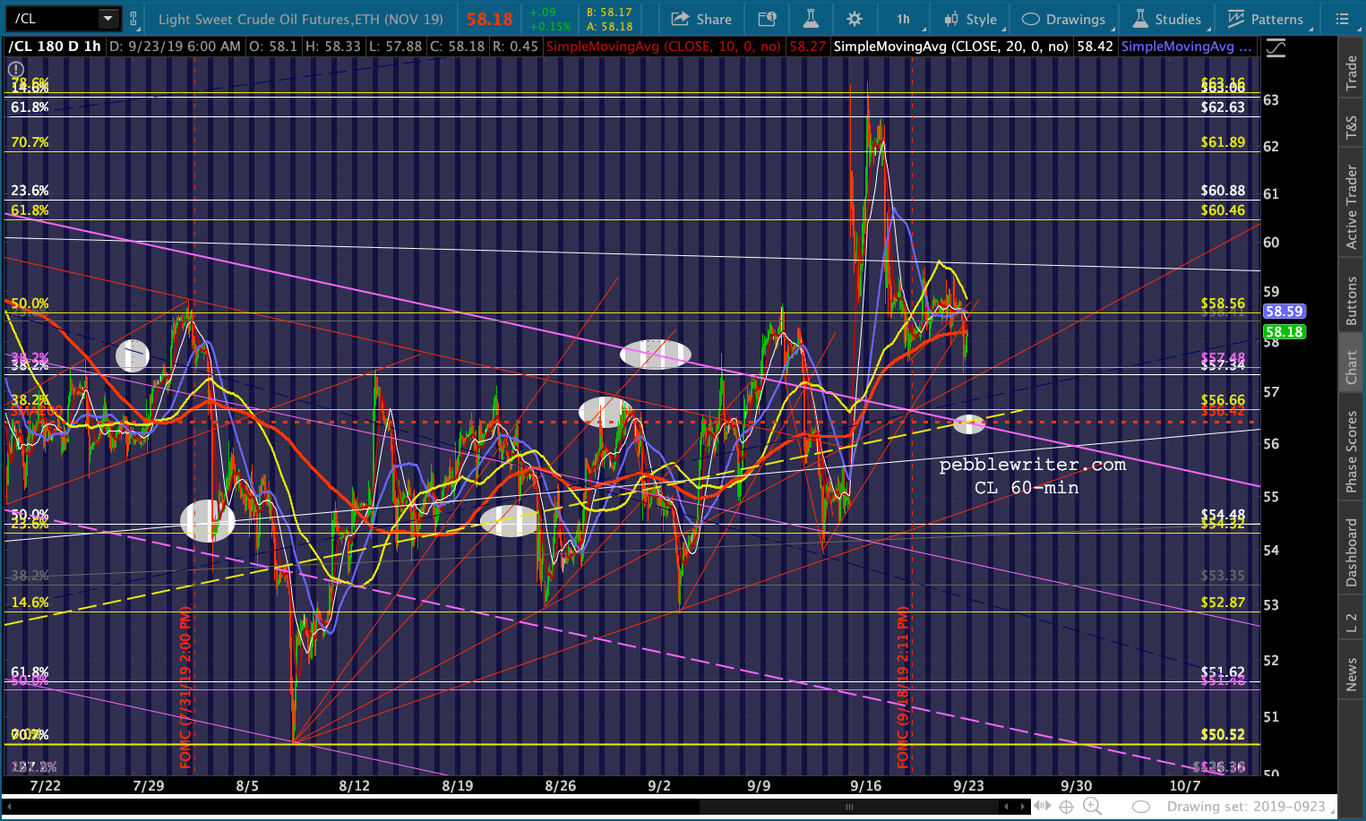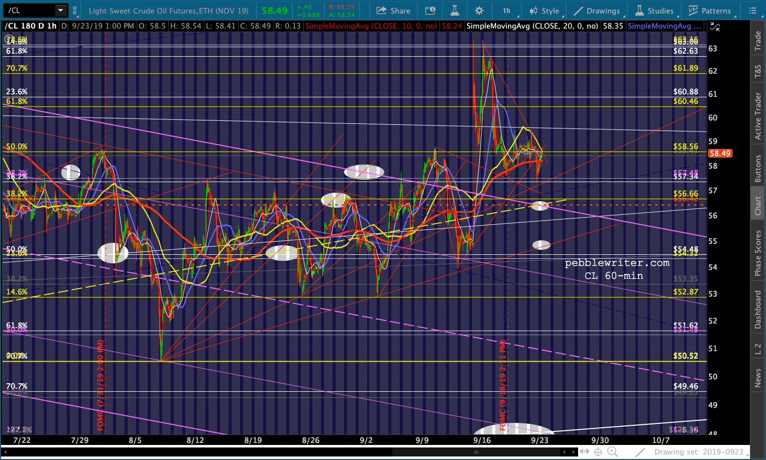 CL’s pop reversed sharply and has broken a little TL from Sep 12. It still looks likely to at least backtest its SMA200 and channel top.