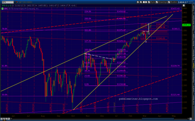 Also entering the picture above is one of the purple channel line drawn from the 1576 Oct 07 high. It’s placement is somewhat inexact, but note that it is precisely parallel to the trend line connecting the 2002 and 2009 lows, and all the other parallels which have been influential over the past 10 years. Today, it crosses in the vicinity of 1439.