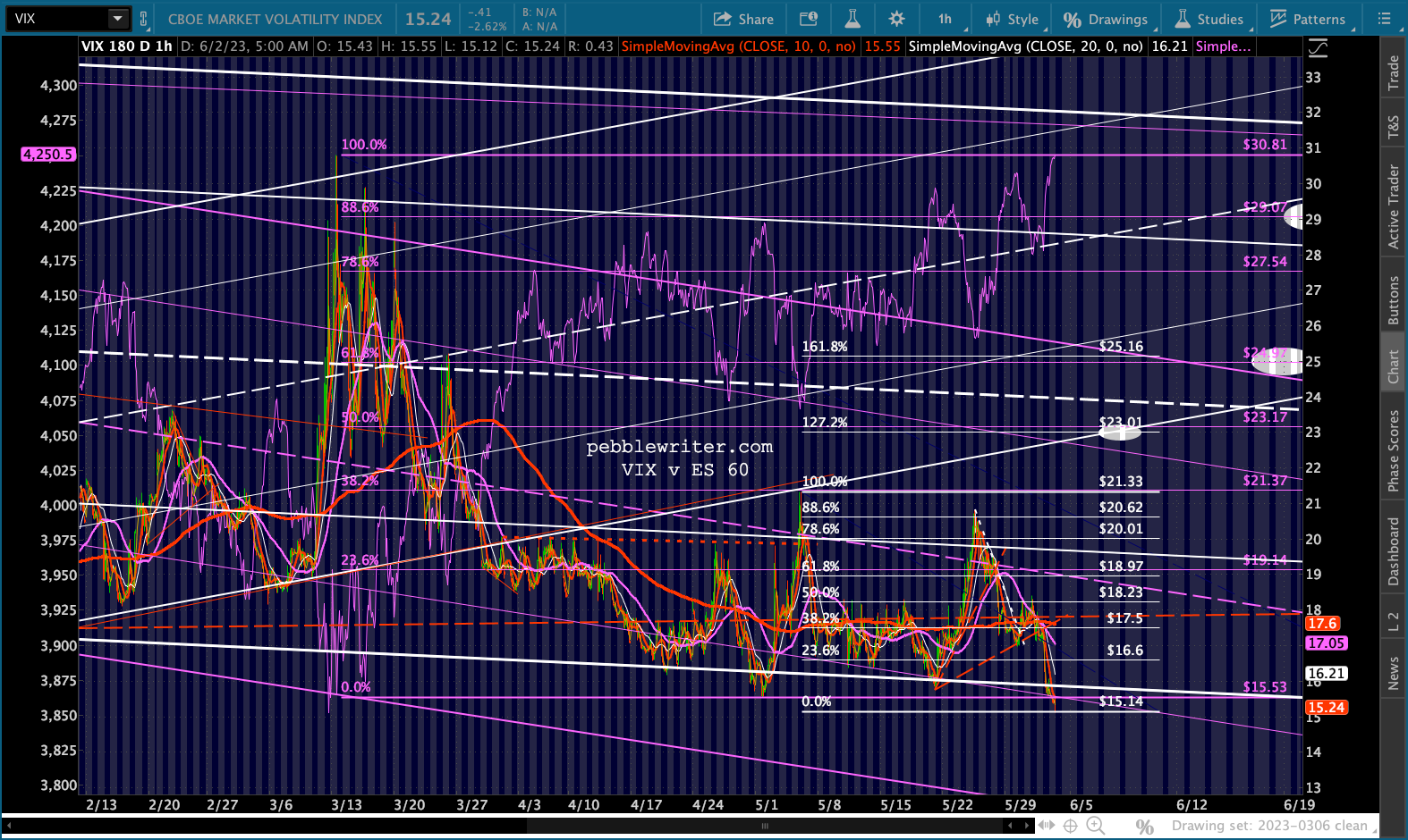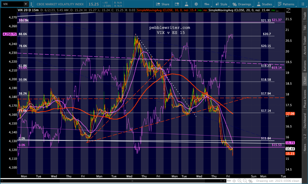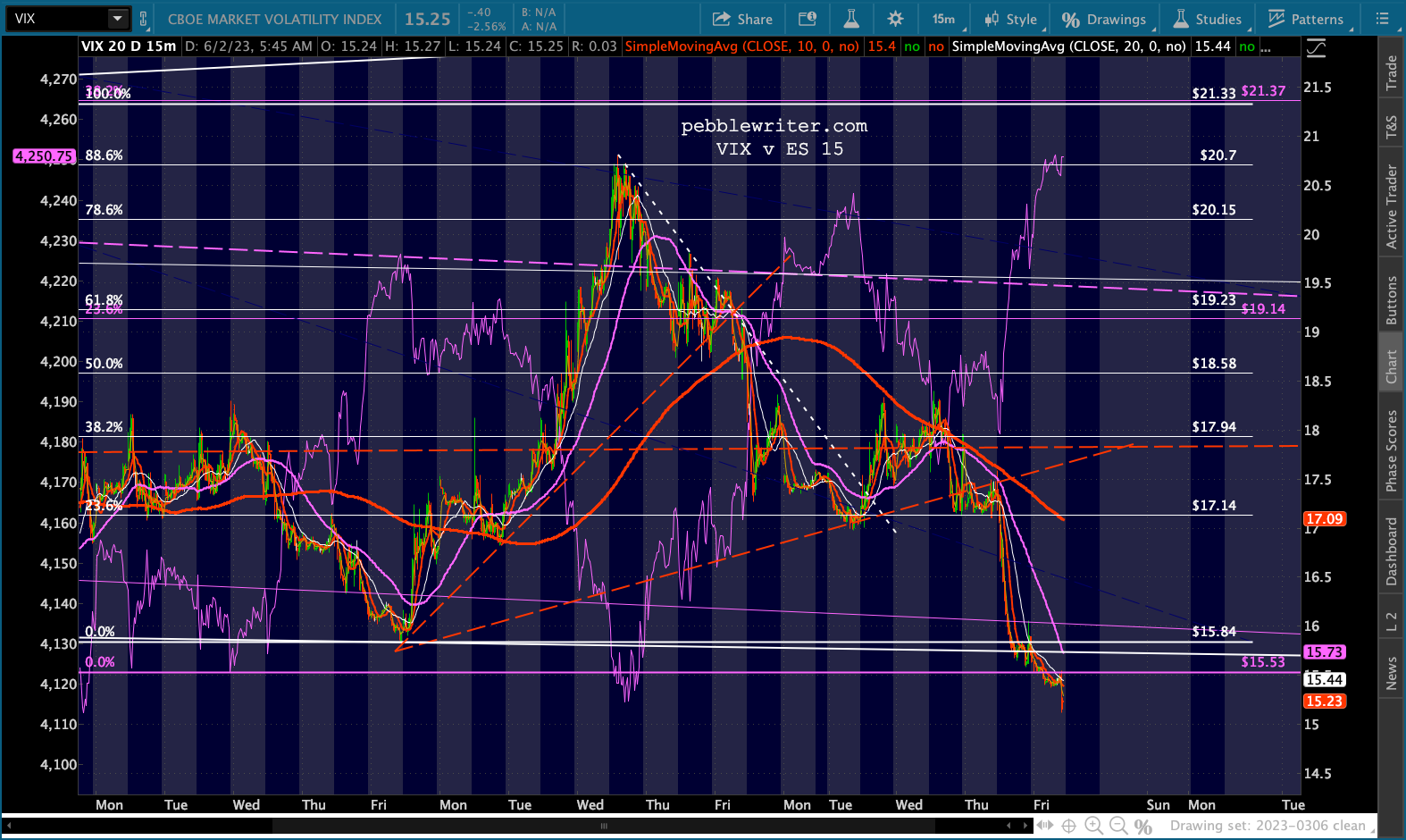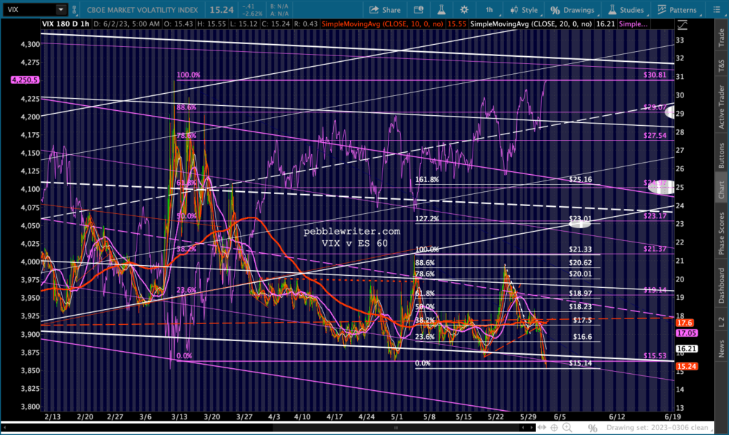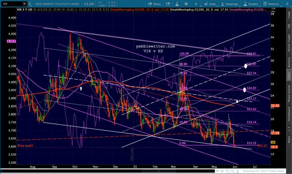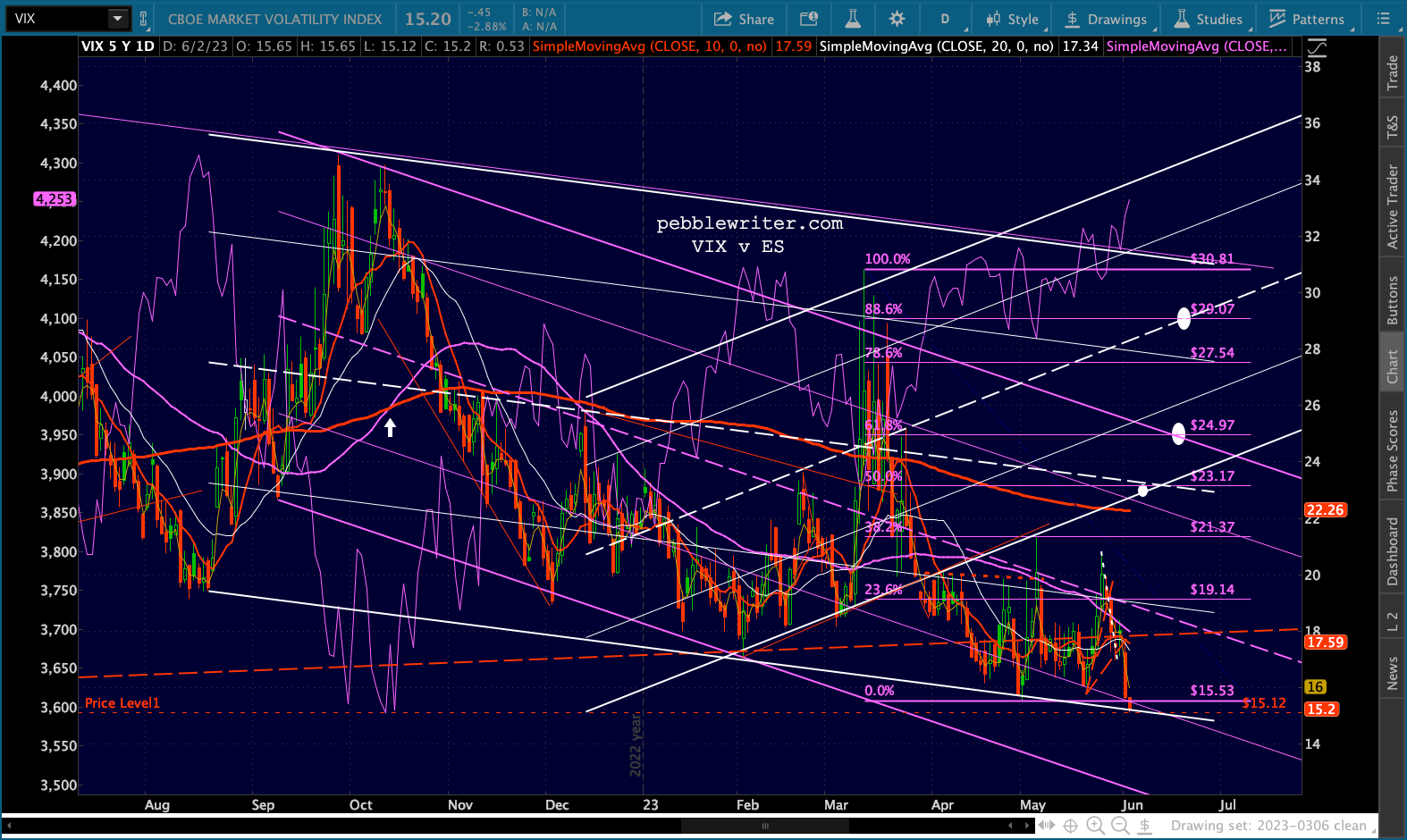 With the VIX-induced breakout above the green .886 retracements, we have to look at the white .618 target as the next most meaningful resistance. I’ve revised both SPX and ES to reflect this scenario.