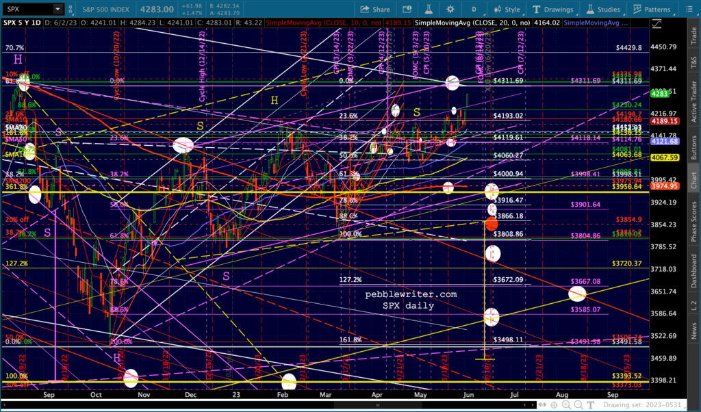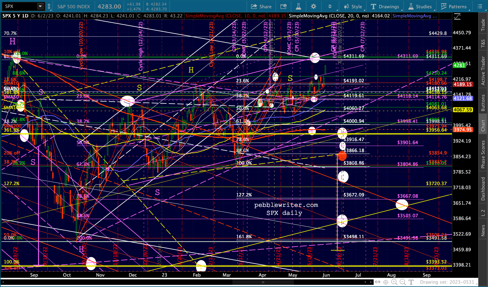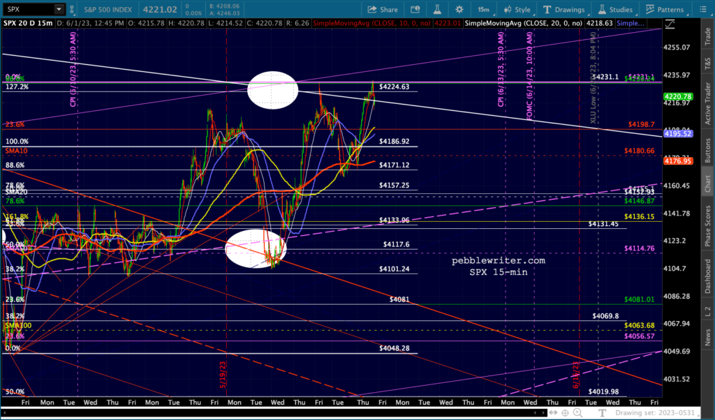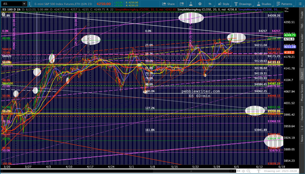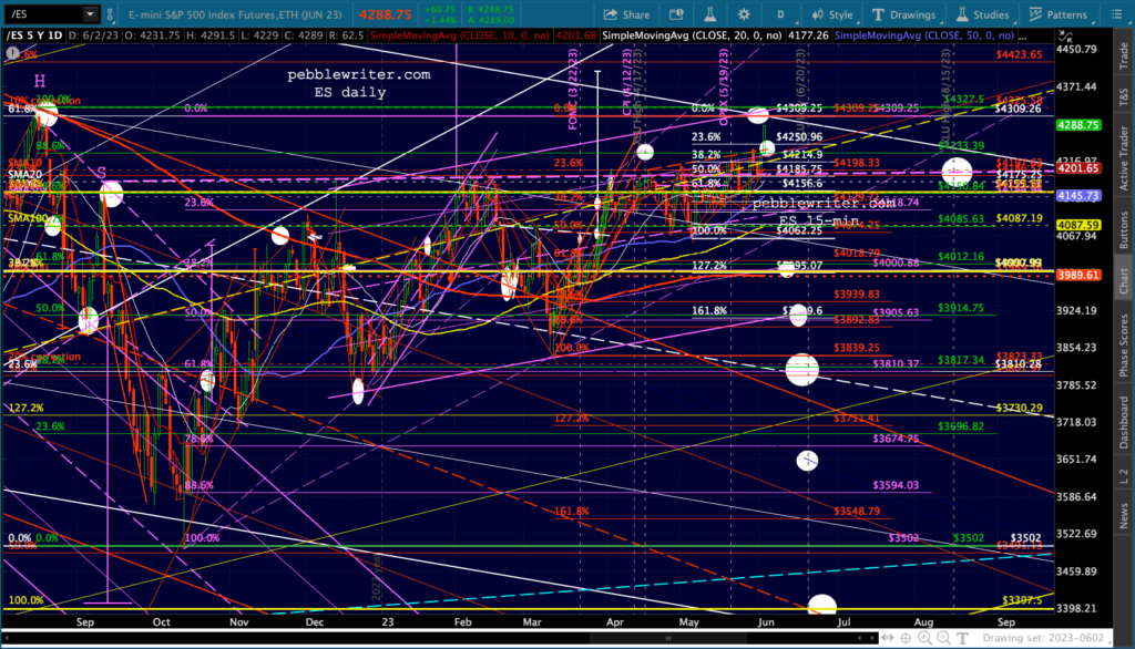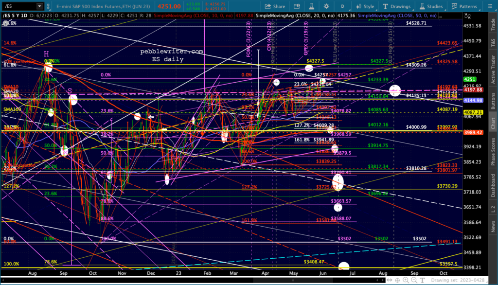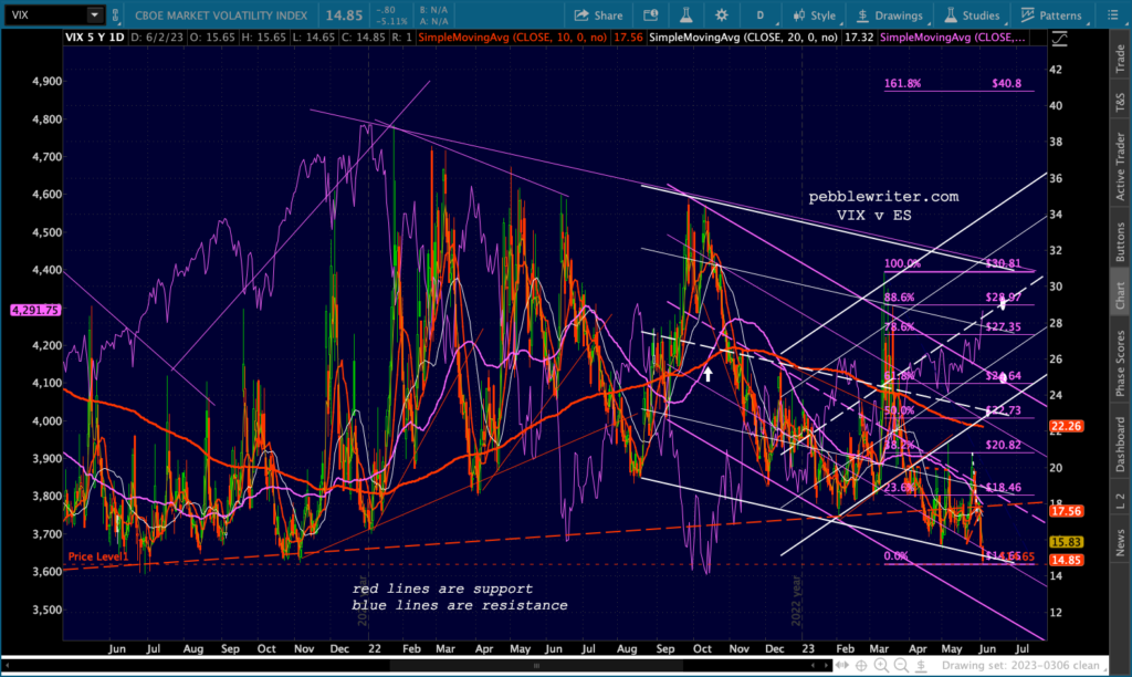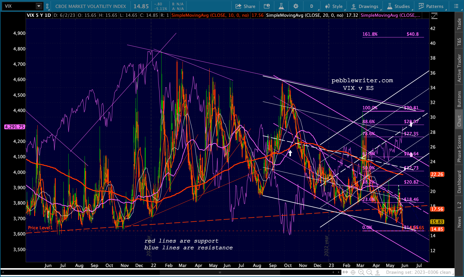 With the VIX-induced breakout above the green .886 retracements, we have to look at the white .618 target as the next most meaningful resistance. I’ve revised both SPX and ES to reflect this scenario.