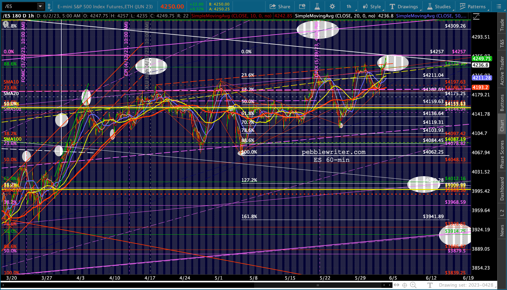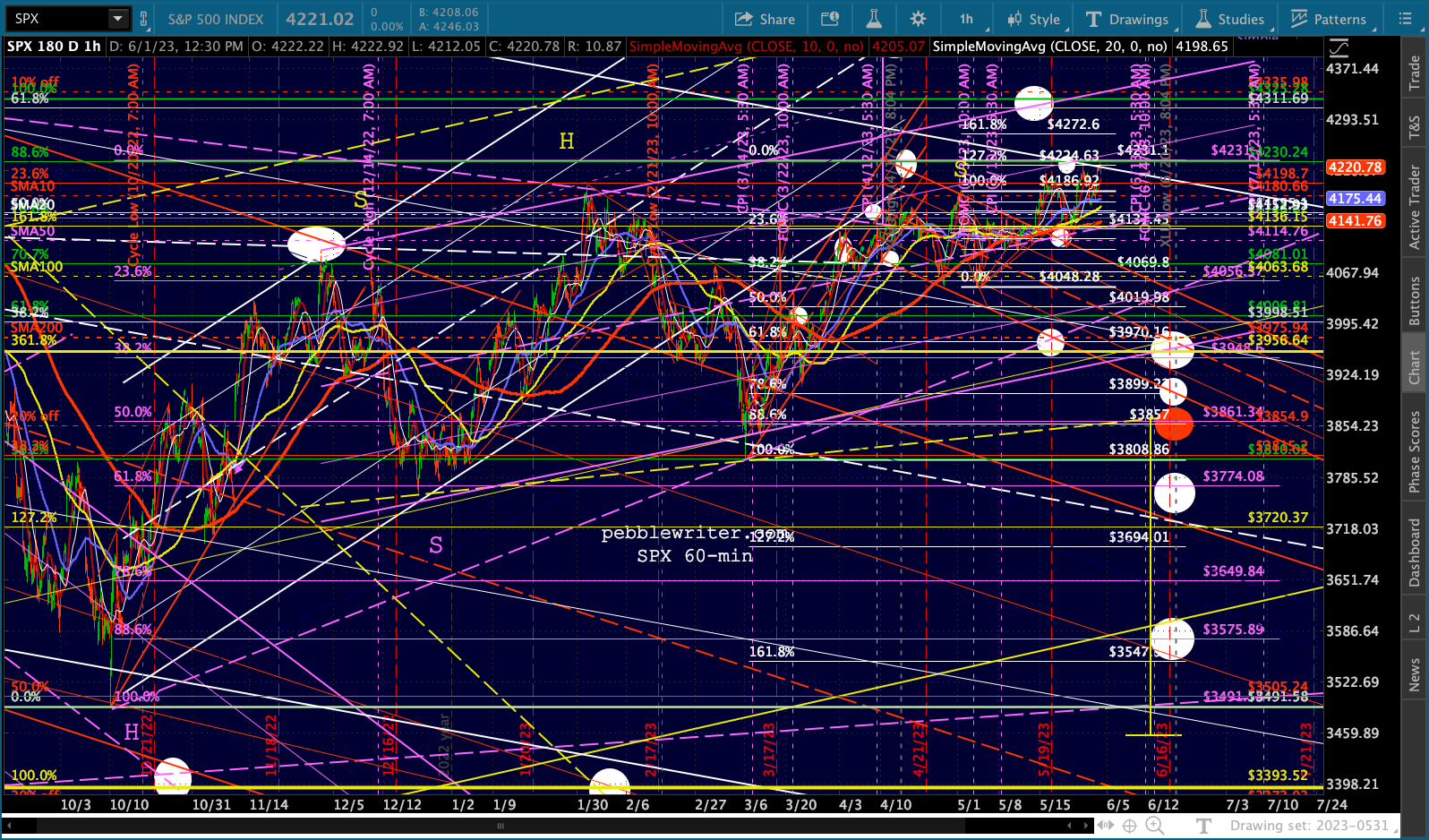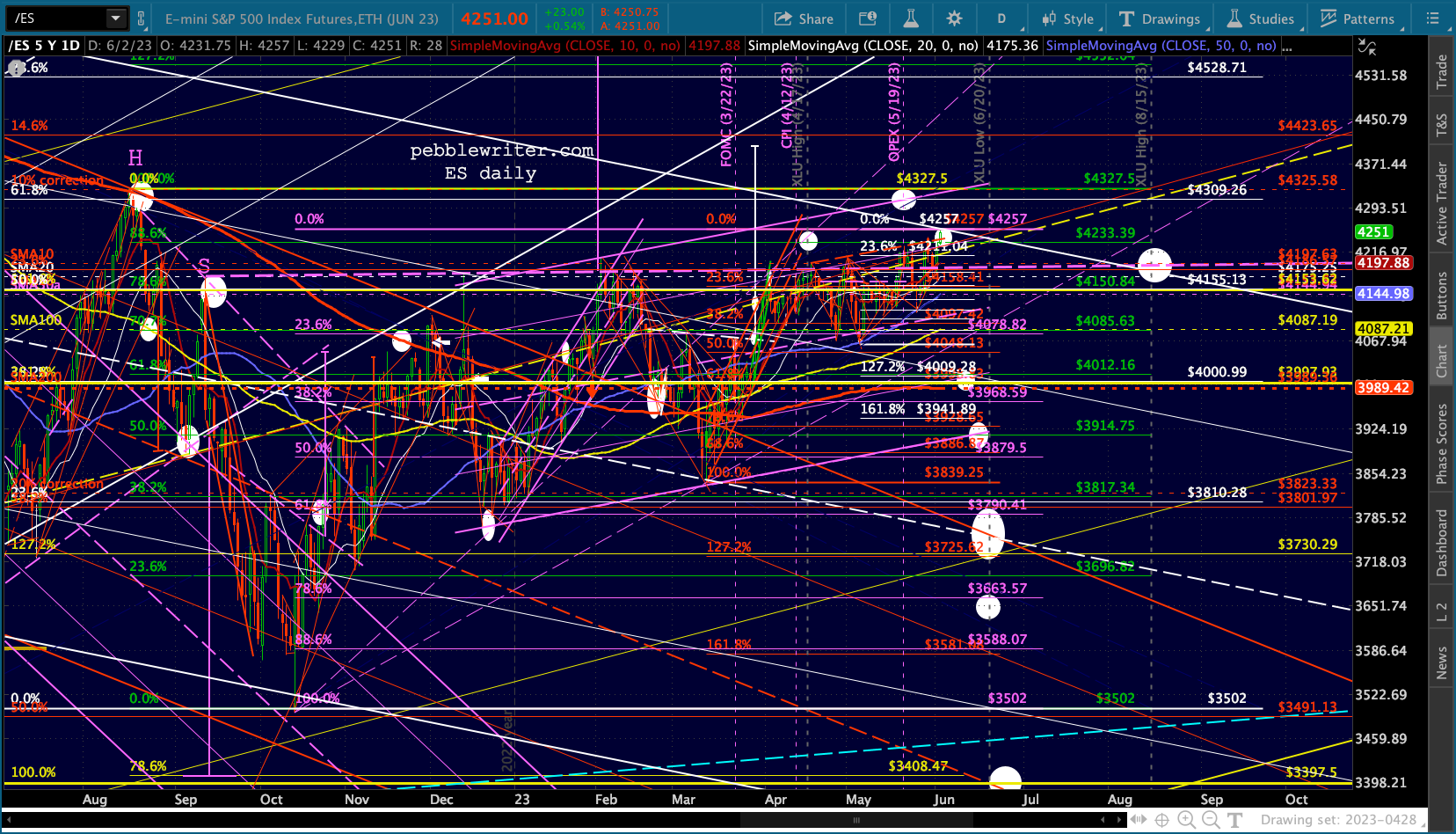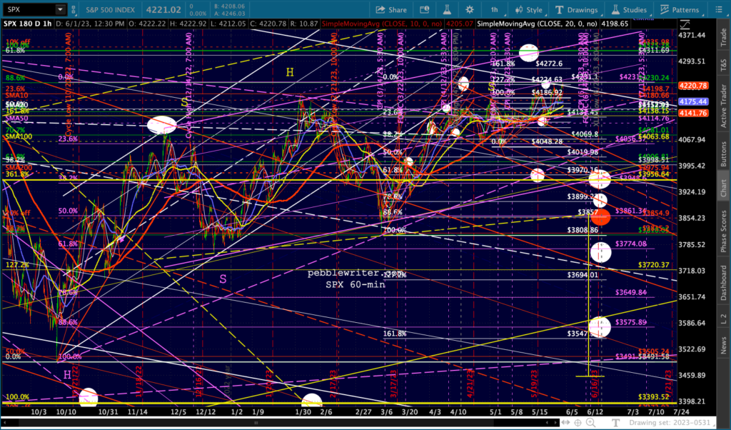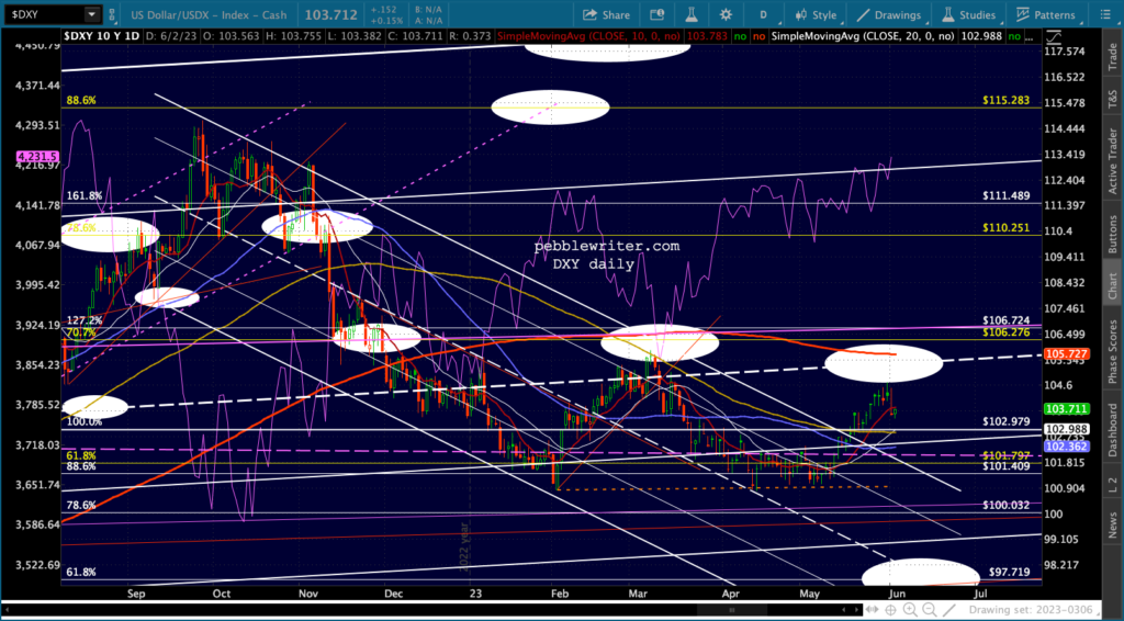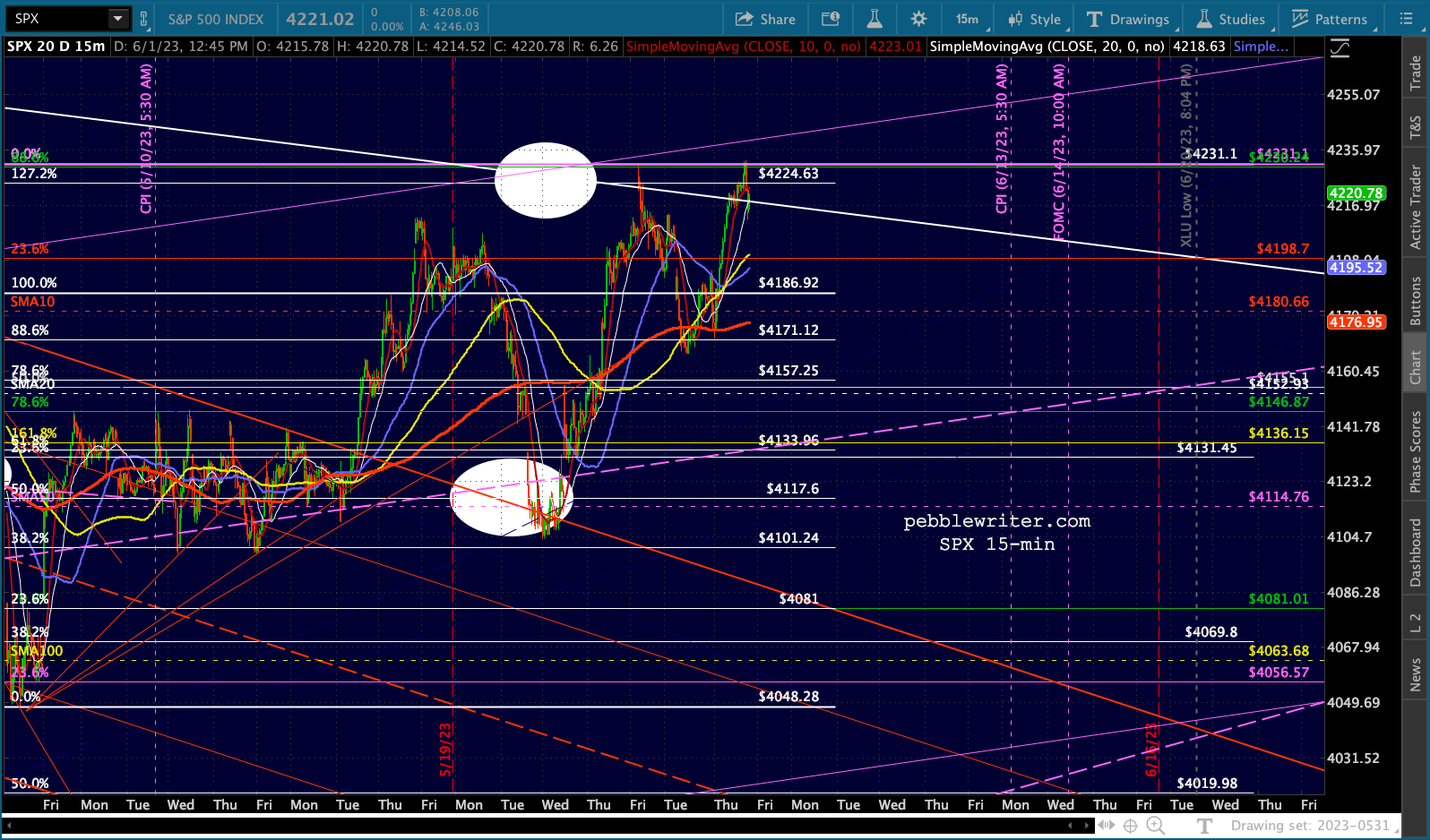 With the VIX-induced breakout above the green .886 retracements, we have to look at the white .618 target as the next most meaningful resistance. I’ve revised both SPX and ES to reflect this scenario.