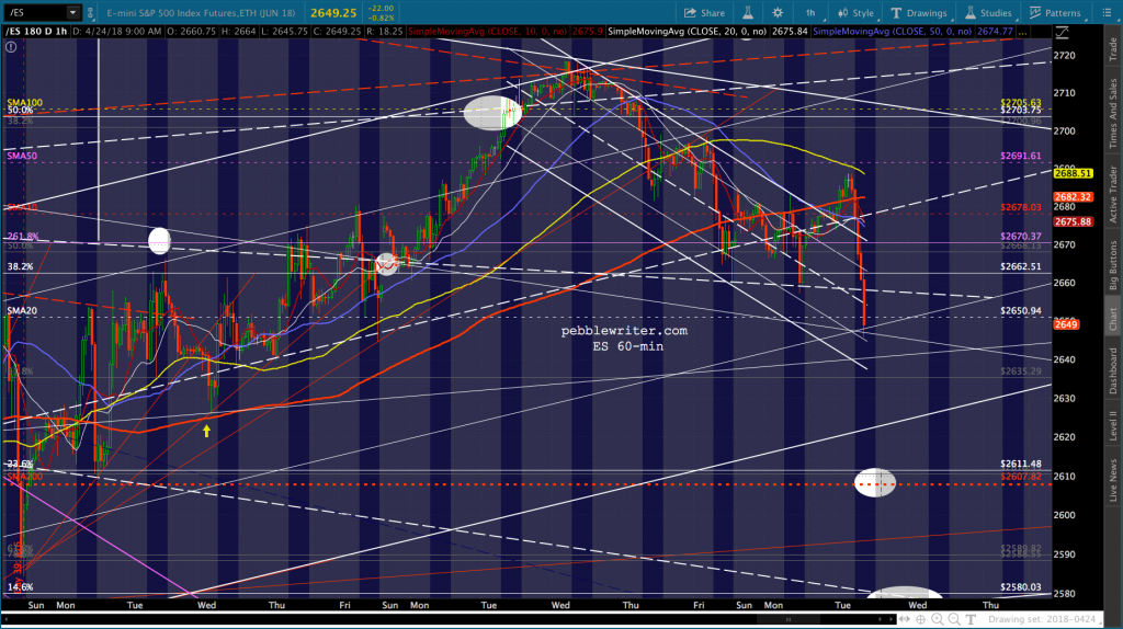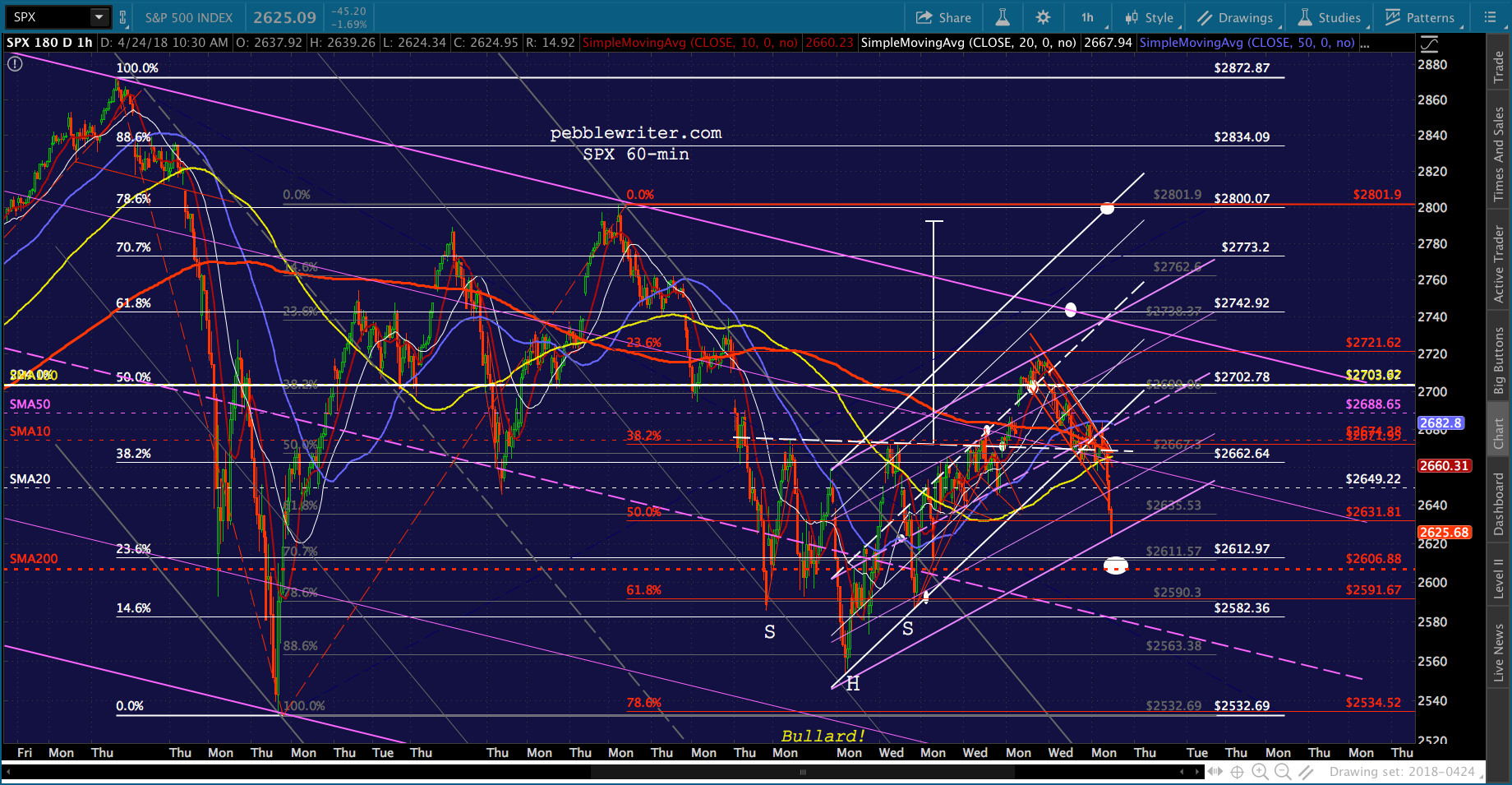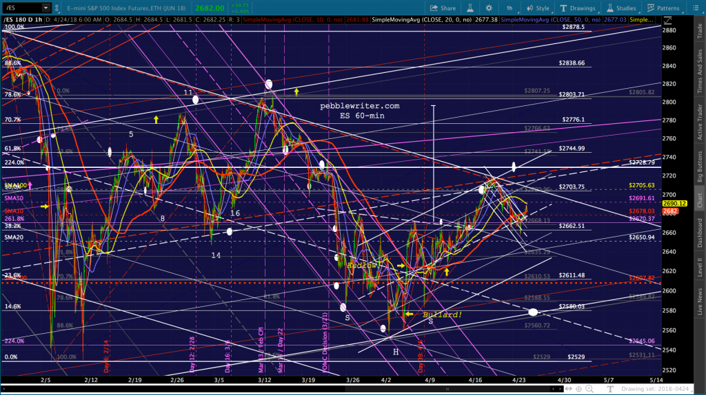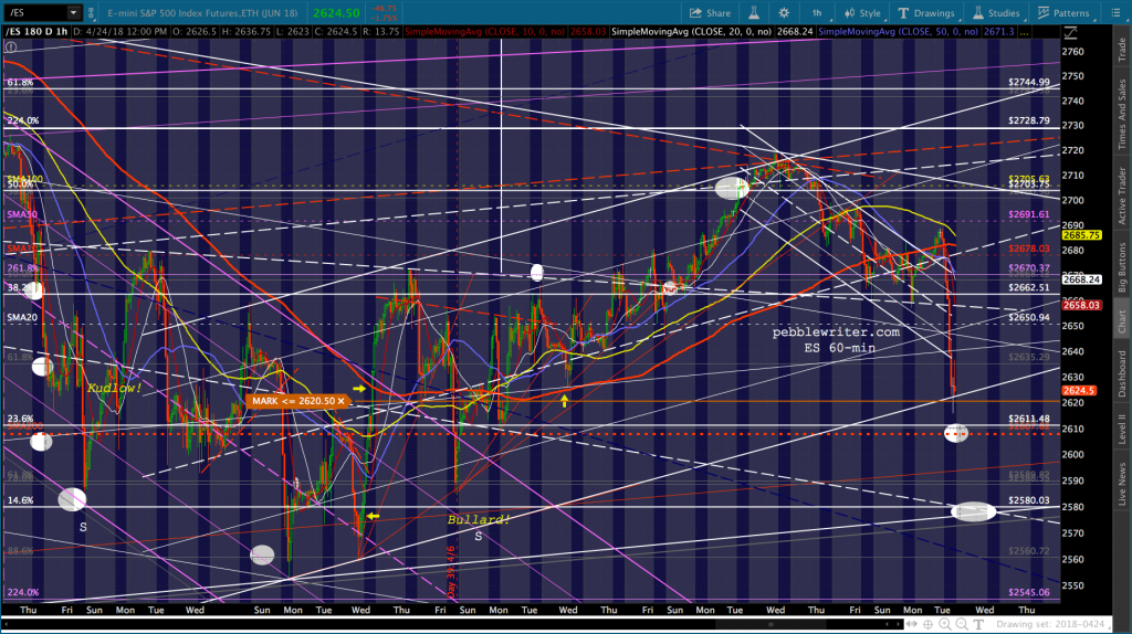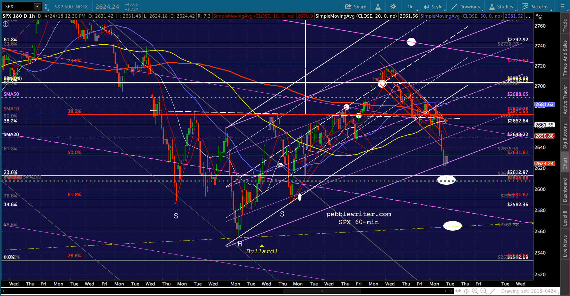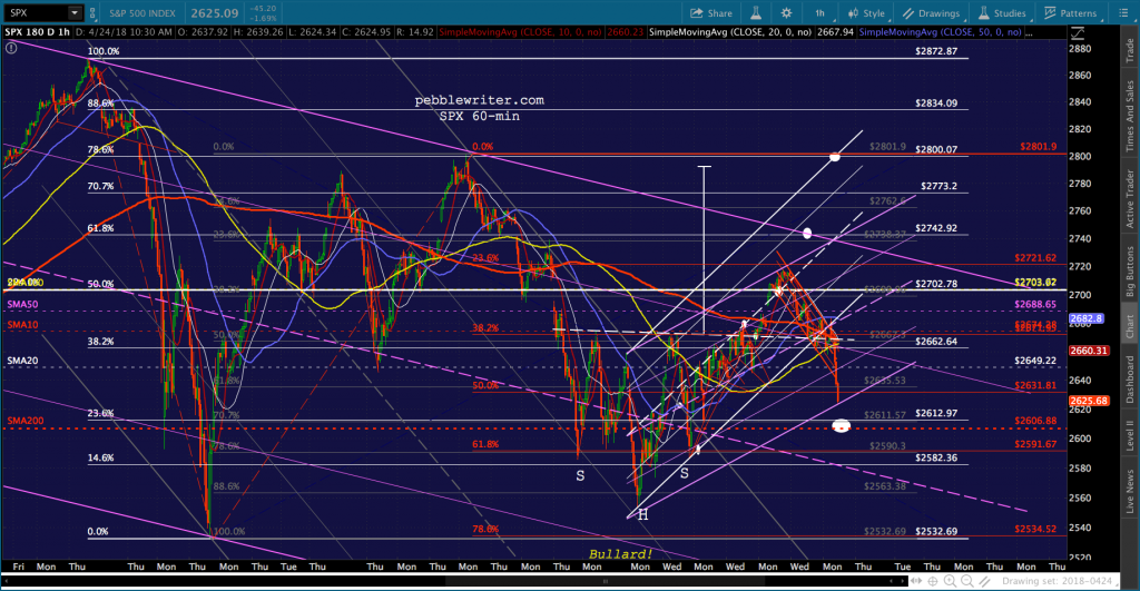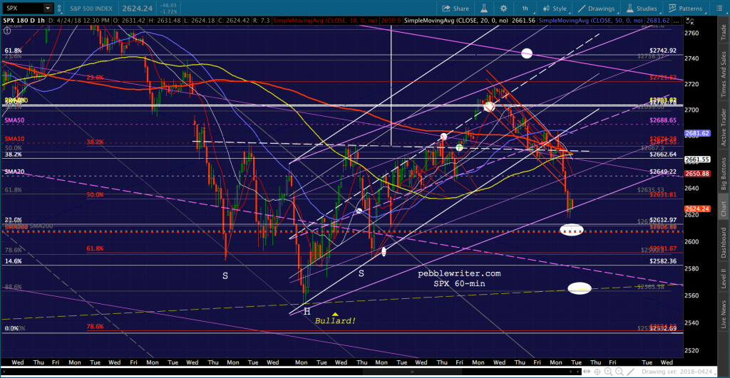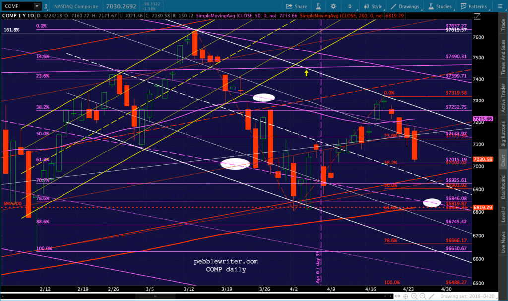 It’s unlikely that ES, SPX and DJI won’t tag their SMA200s at all. We could get a plunge through to the 2.4% target in sync with COMP, or we we could get the rest of it tomorrow. Personally, I prefer a close at or below the SMA200s, as it would be the toughest to decipher. But, the bulls will probably try to close above them.