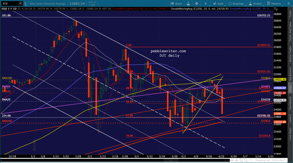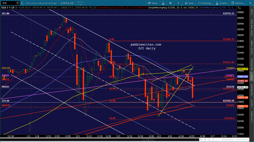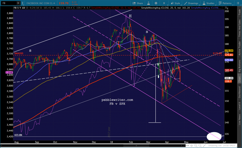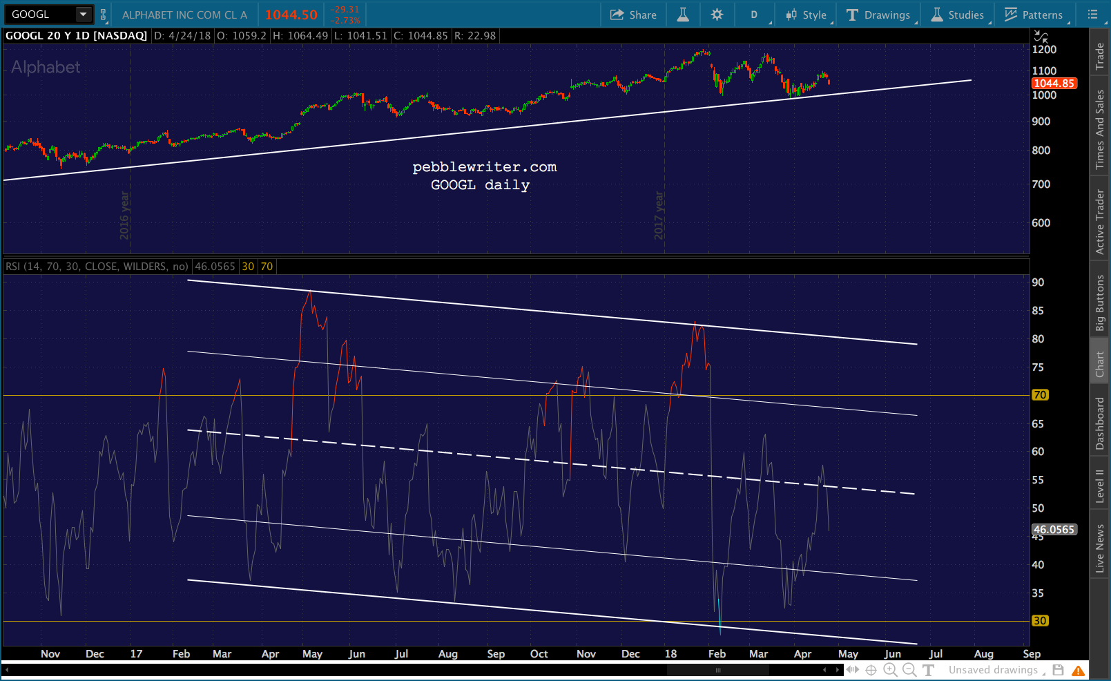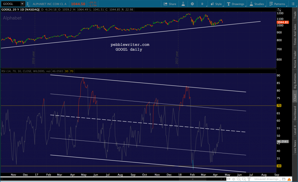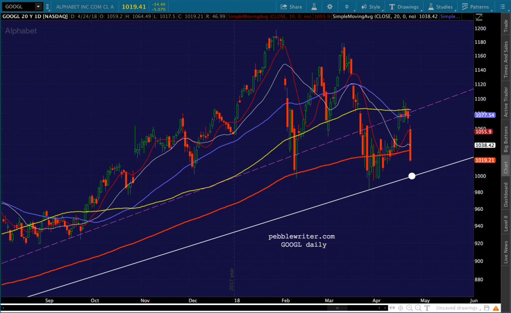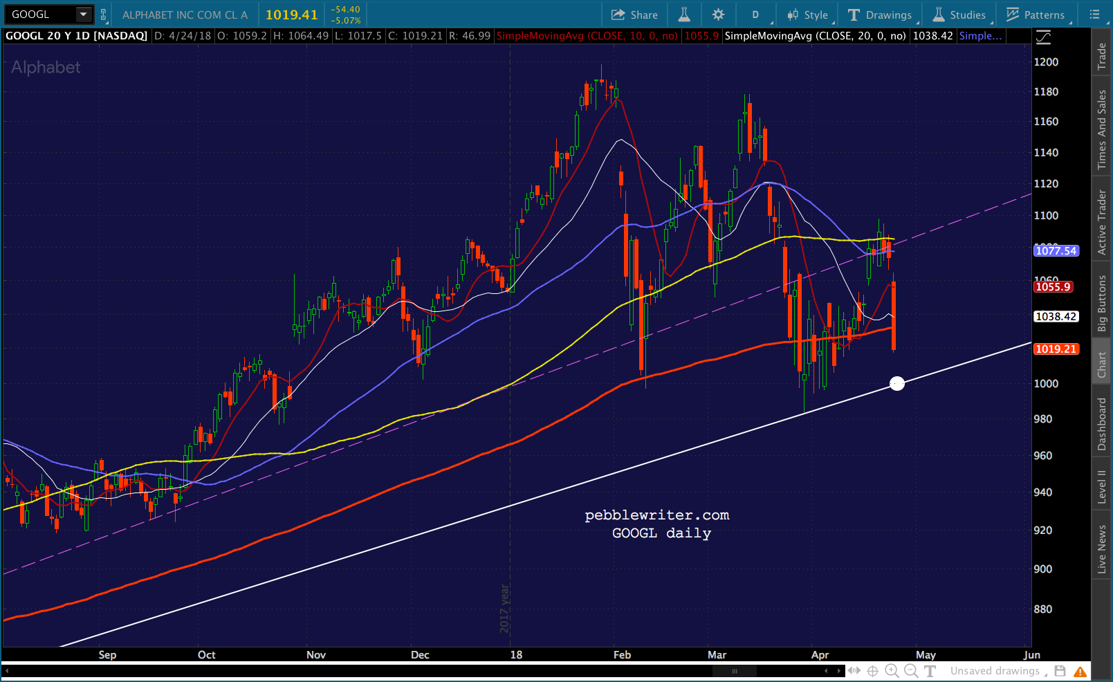 BTW, I mentioned in the FAANGS post yesterday that GOOGL didn’t show any particular problems from a charting standpoint. In taking a fresh look this morning, I see some issues with its RSI, MACD, and long term TLs. It seems likely to reach its SMA200 today, and has a very good chance of dropping through it to the longest-term TL at around 1000.