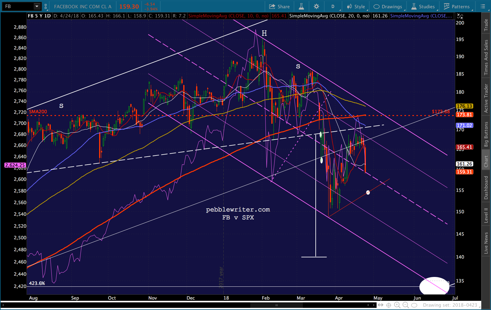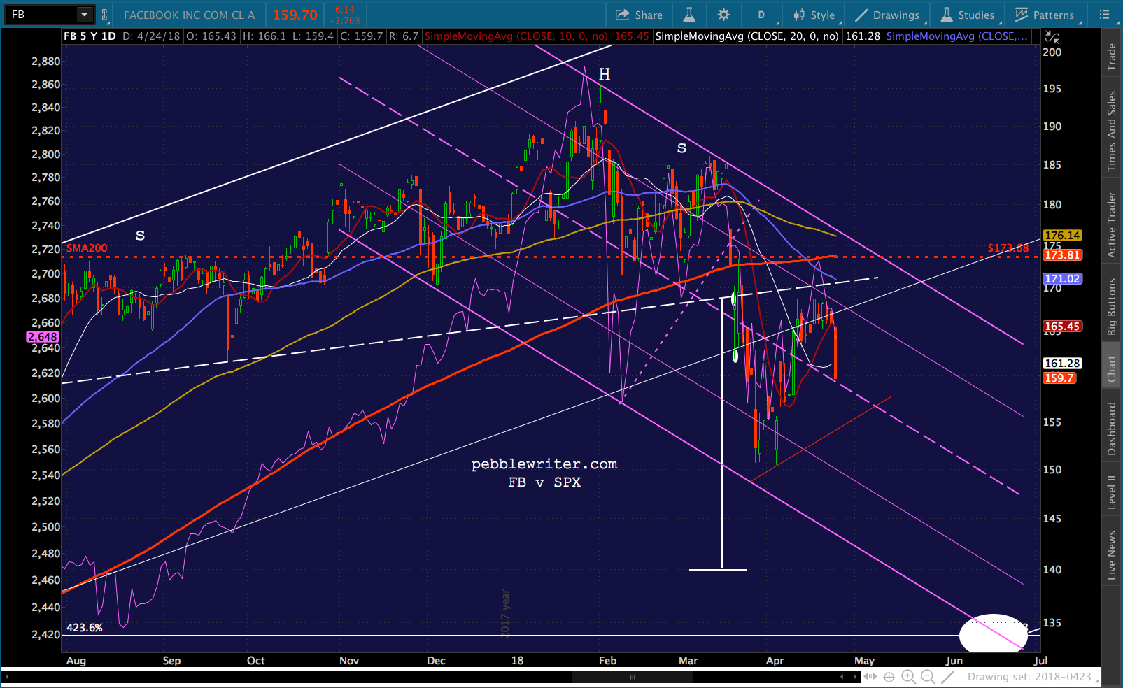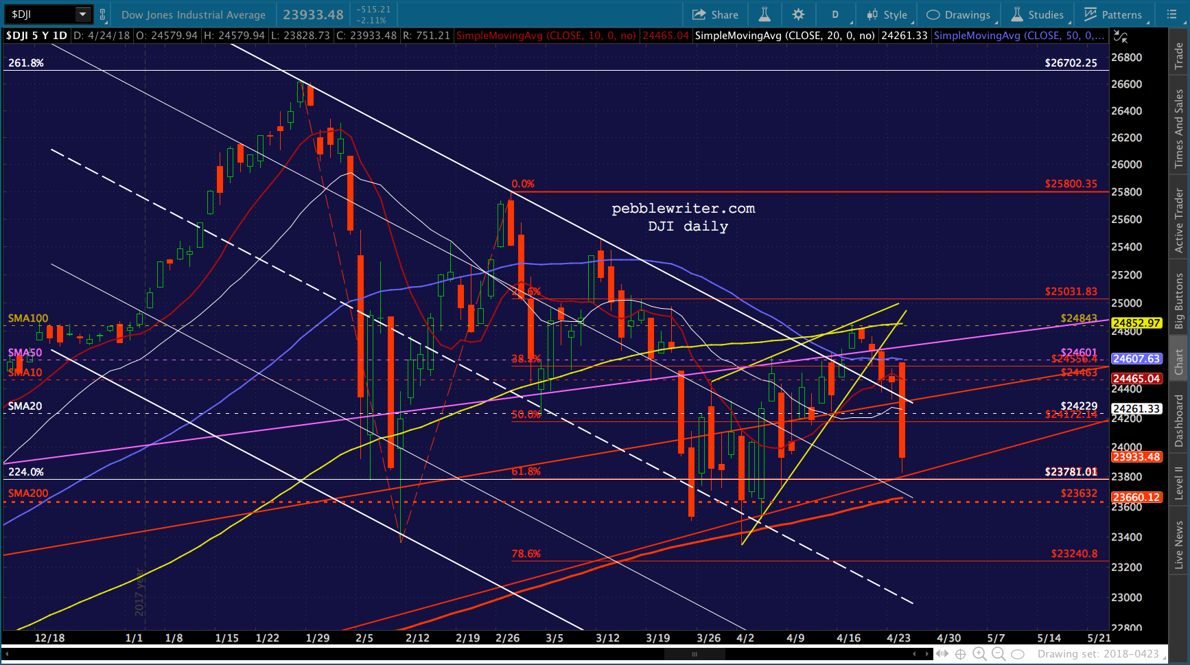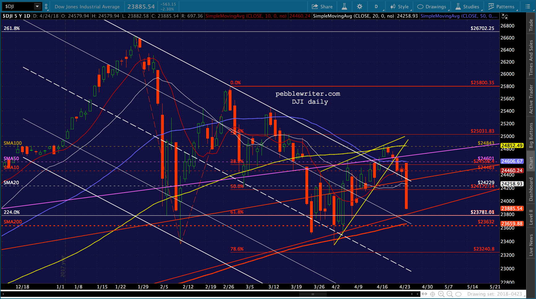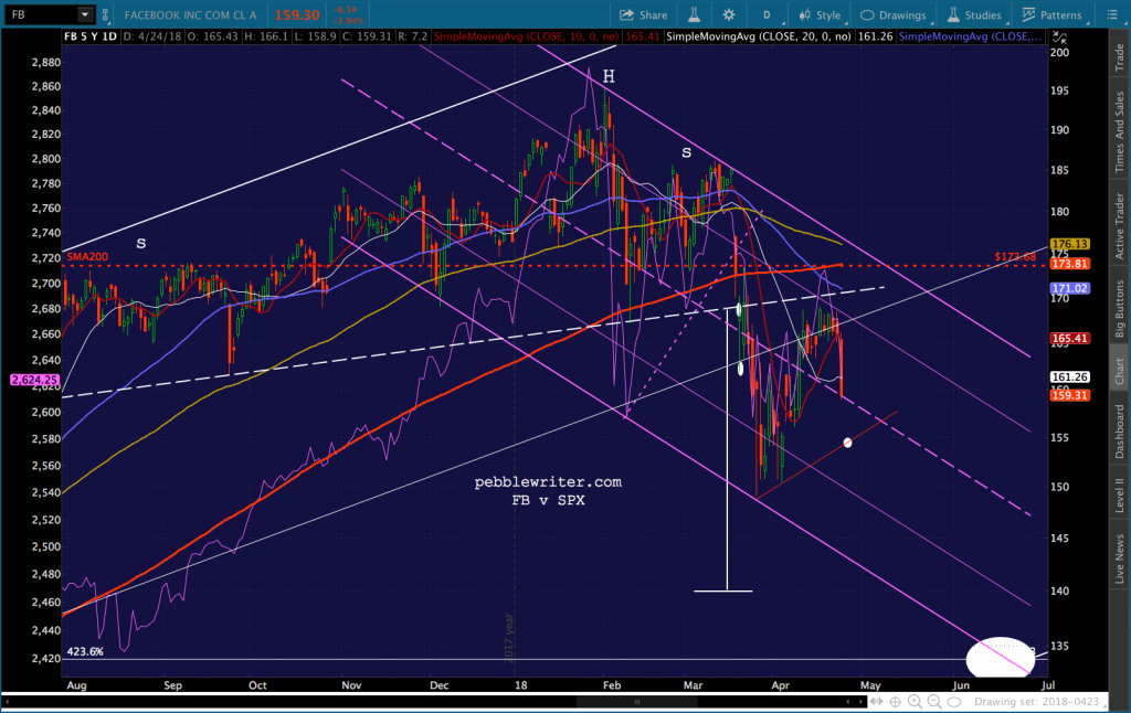 BTW, I mentioned in the FAANGS post yesterday that GOOGL didn’t show any particular problems from a charting standpoint. In taking a fresh look this morning, I see some issues with its RSI, MACD, and long term TLs. It seems likely to reach its SMA200 today, and has a very good chance of dropping through it to the longest-term TL at around 1000.