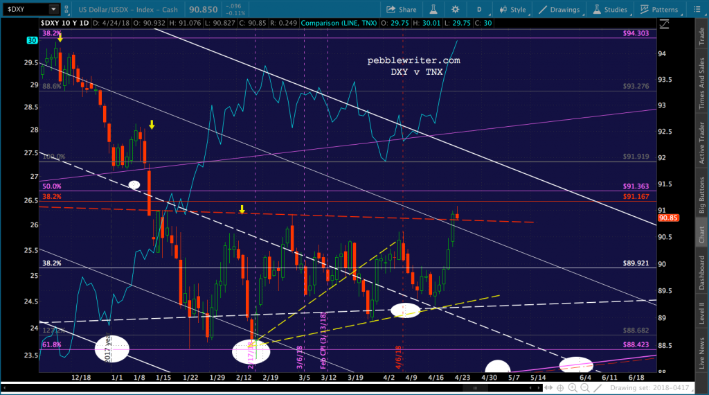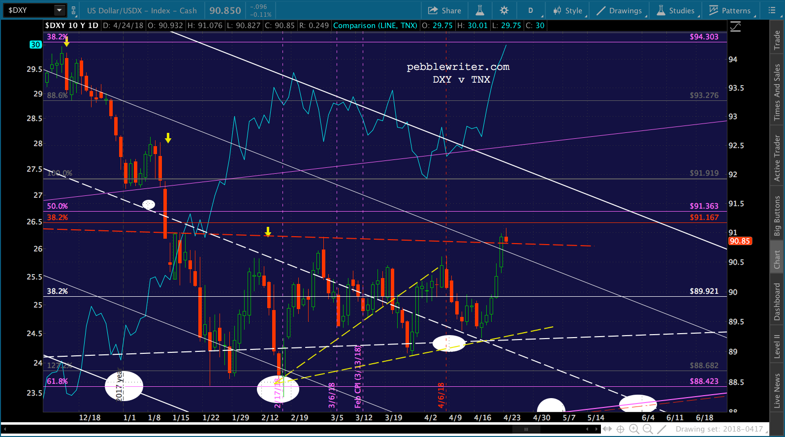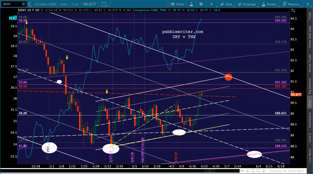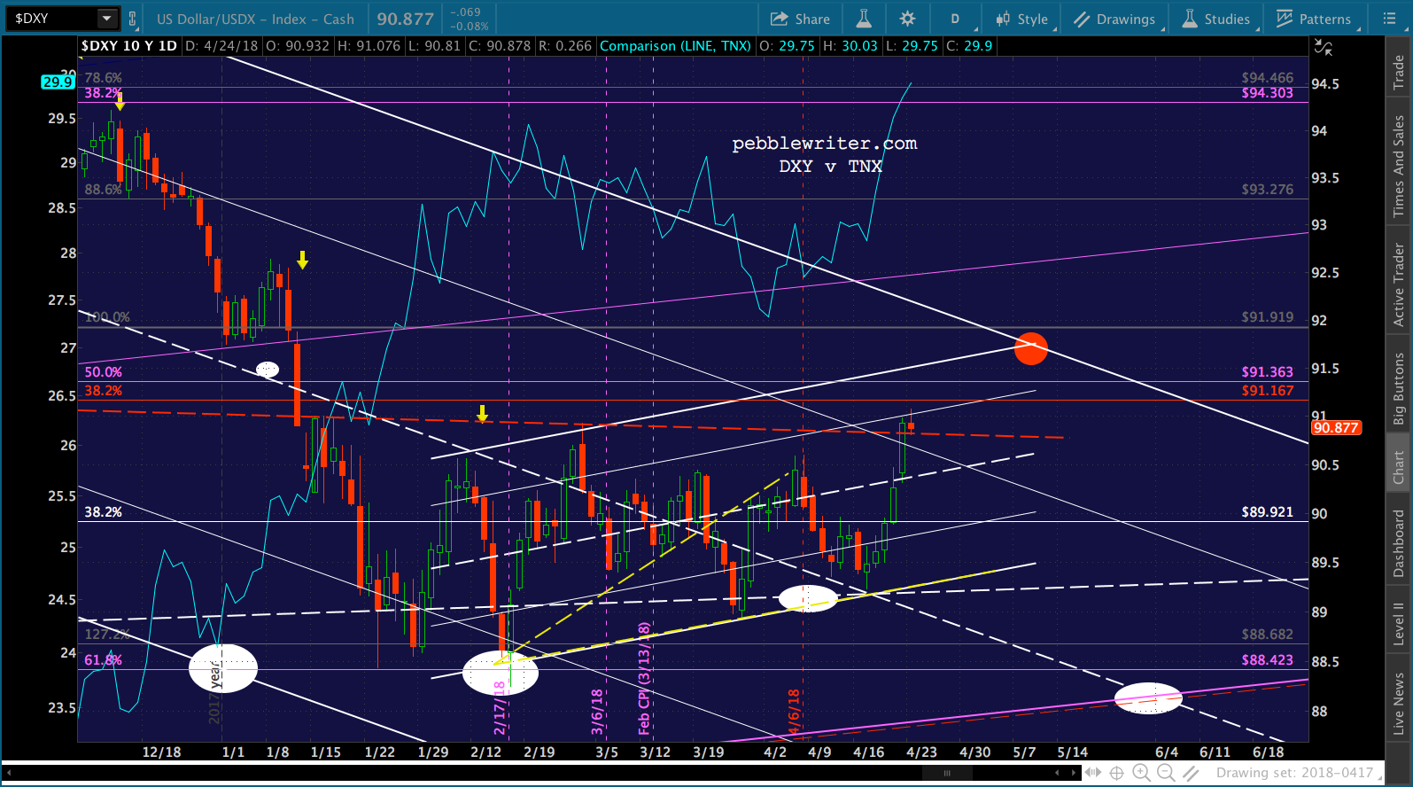 DXY is starting to take on the appearance of a rising channel which intersects with the top of the big, falling white channel at around 91.75 on May 14ish.