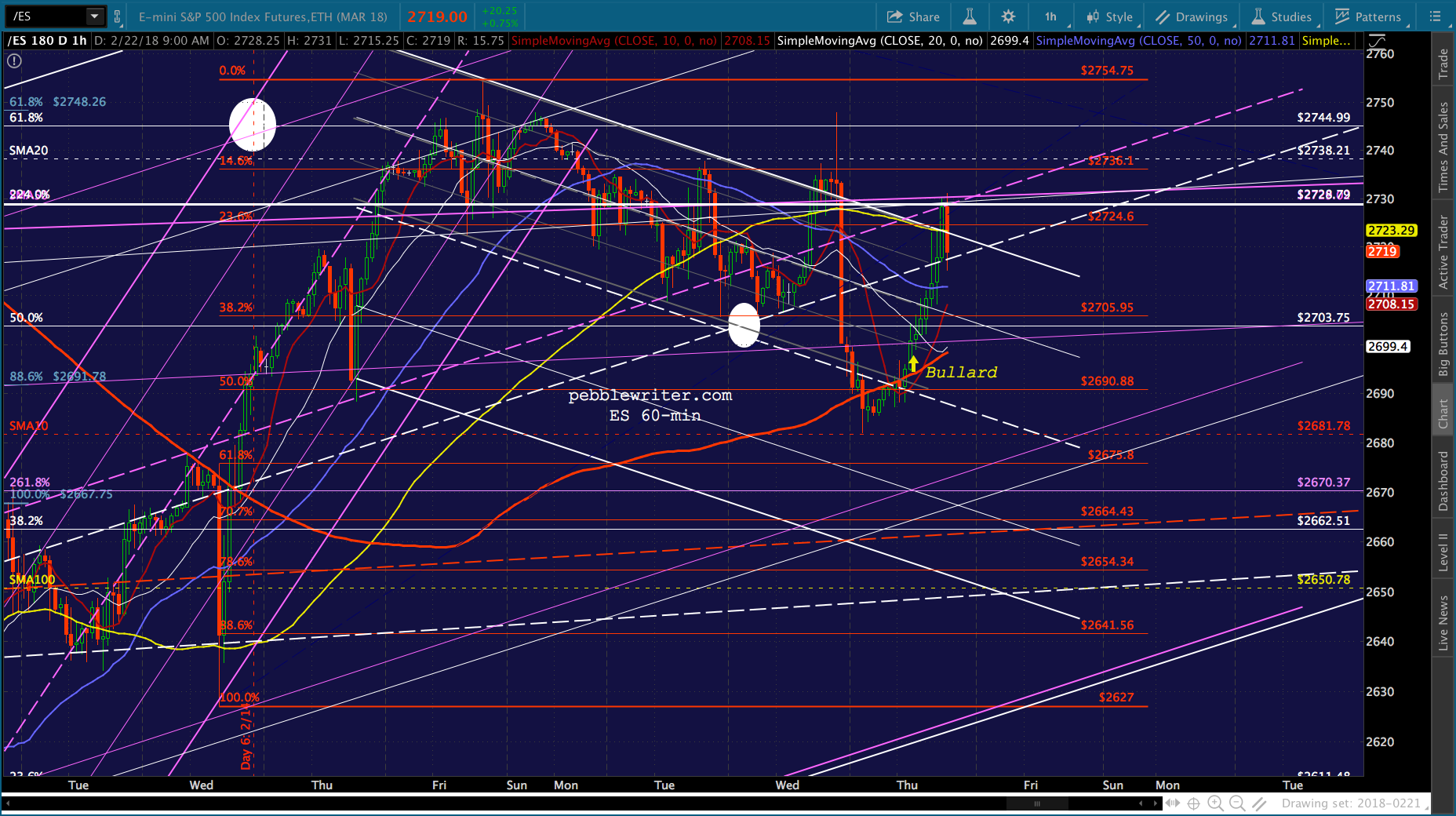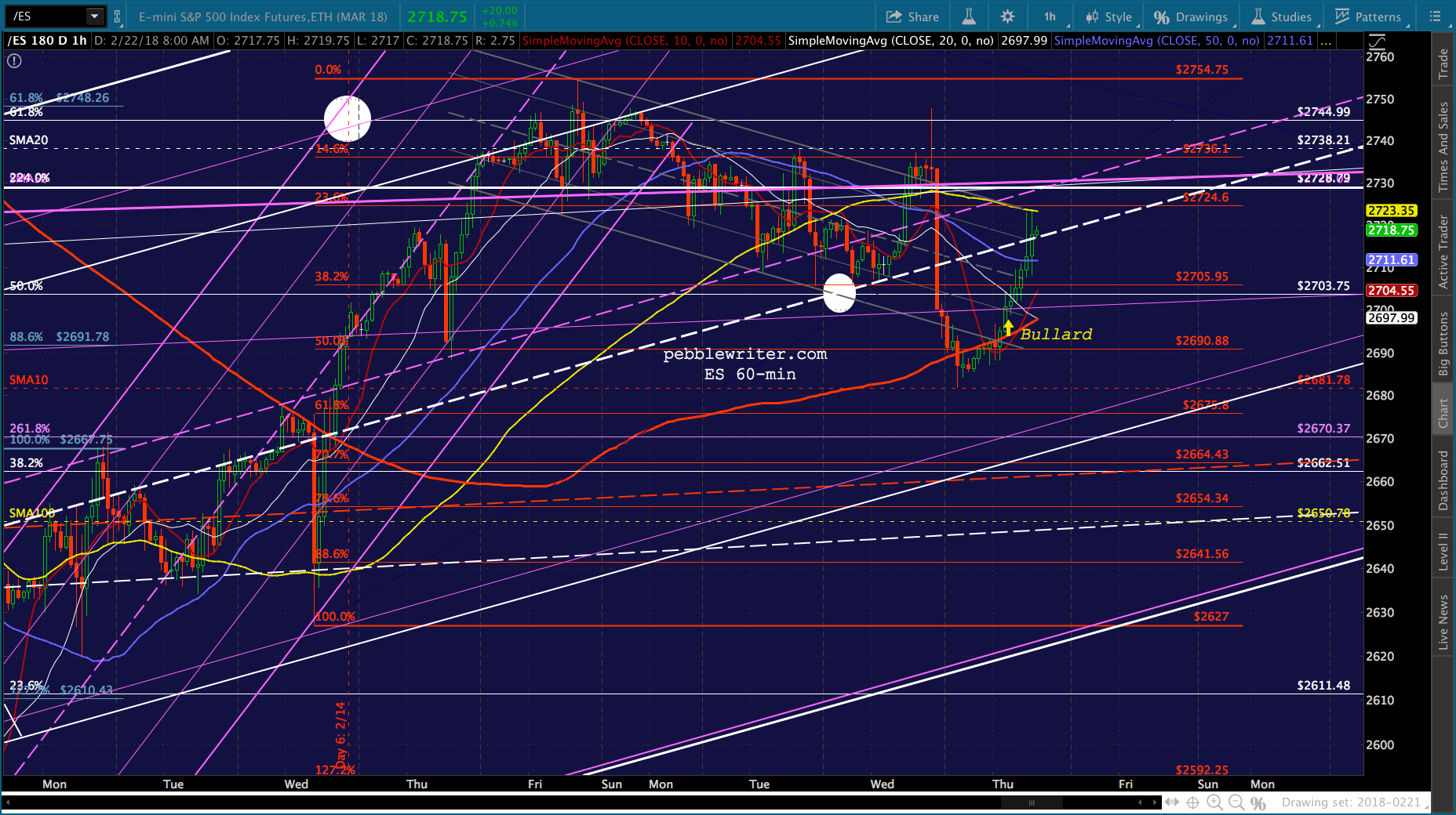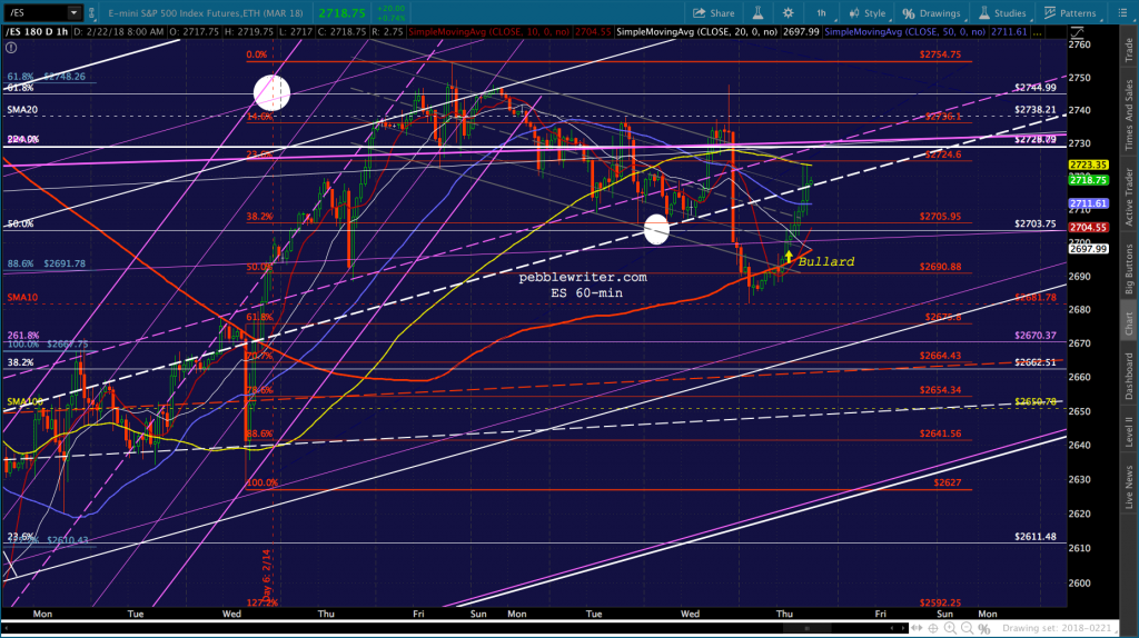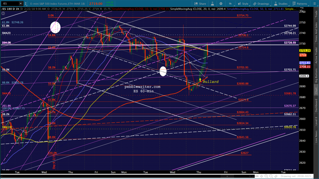 continued for members…ES is testing the top of the falling gray channel in place over the past 4 sessions. This also means a test of the rising white channel midline. A rise above 2724 should leave the bulls in the clear, with only ES’ 2.24 at 2728.79 to contend with.