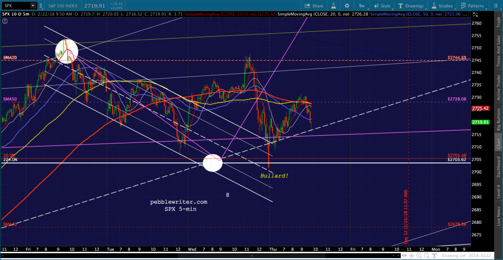 ES reversed off its 2.24 on the lack of (algo) leadership. So far, it is holding at the rising white channel midline, but it’s hard to imagine it shooting higher unless VIX gets into gear. Likewise for SPX, which just backtested its white midline at 2716. Watch out if it drops through it.