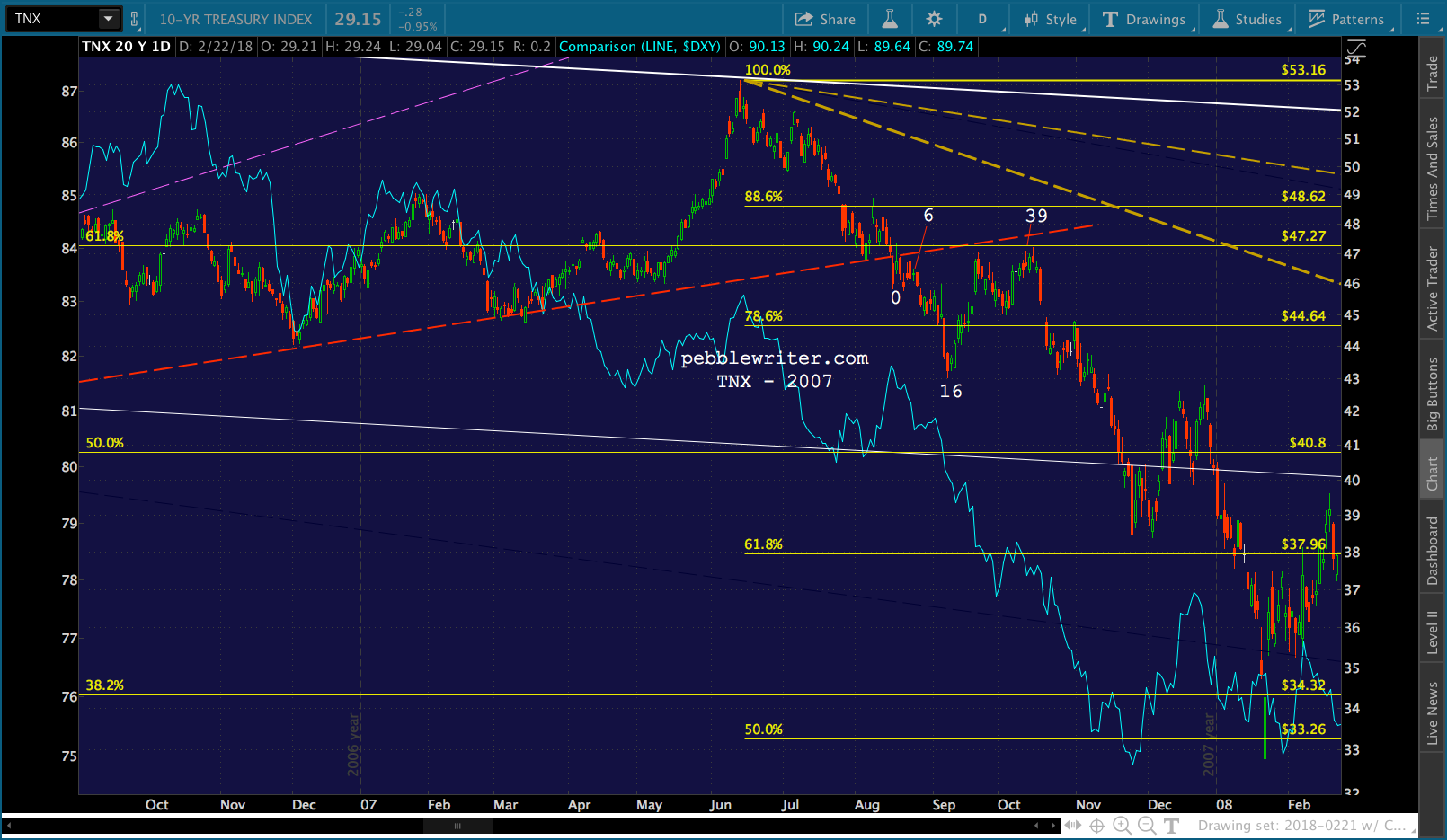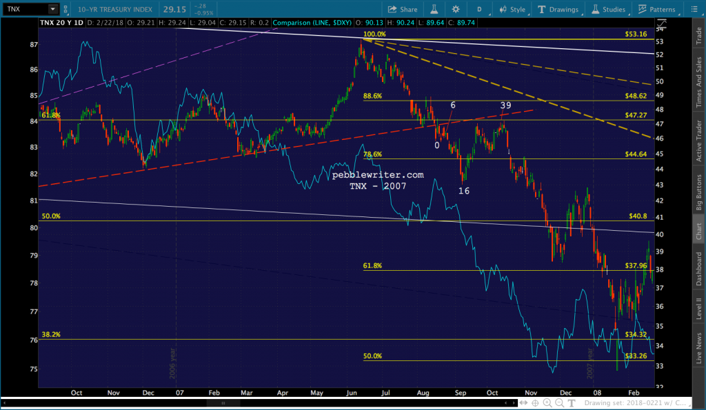 Interest rates were slumping in 2007 and 2014 because equity investors were getting nervous and putting equity money into treasuries instead. In 2007, TNX broke below trend because people were panicking. Today, we need interest rates to decline in order to keep people from panicking.