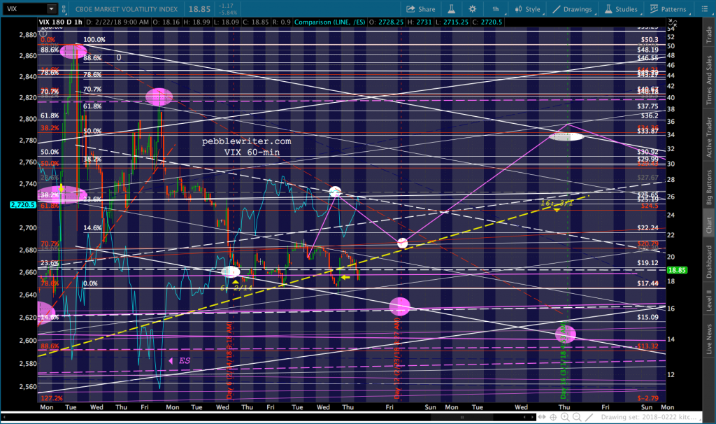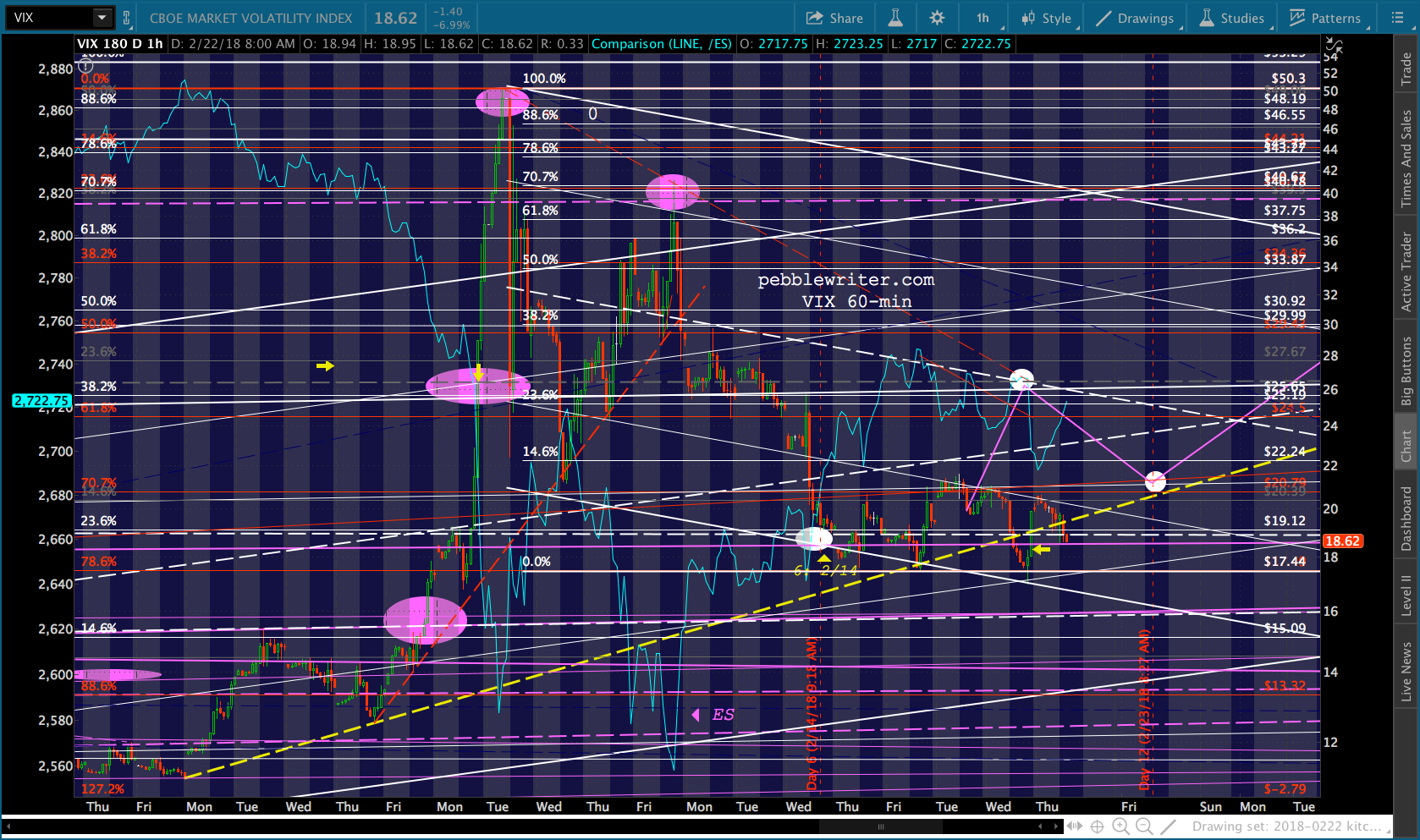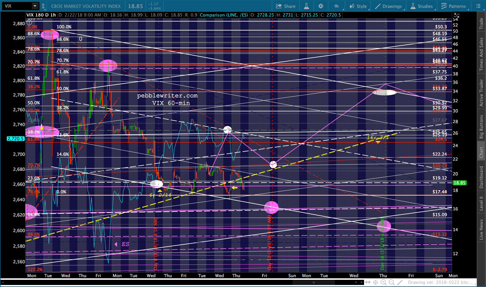 By expanding ES’ falling white channel, we can see a path to, say, the red .886 at 2641.56. If VIX were to pop up to 26, I think it’d be fairly likely to occur.