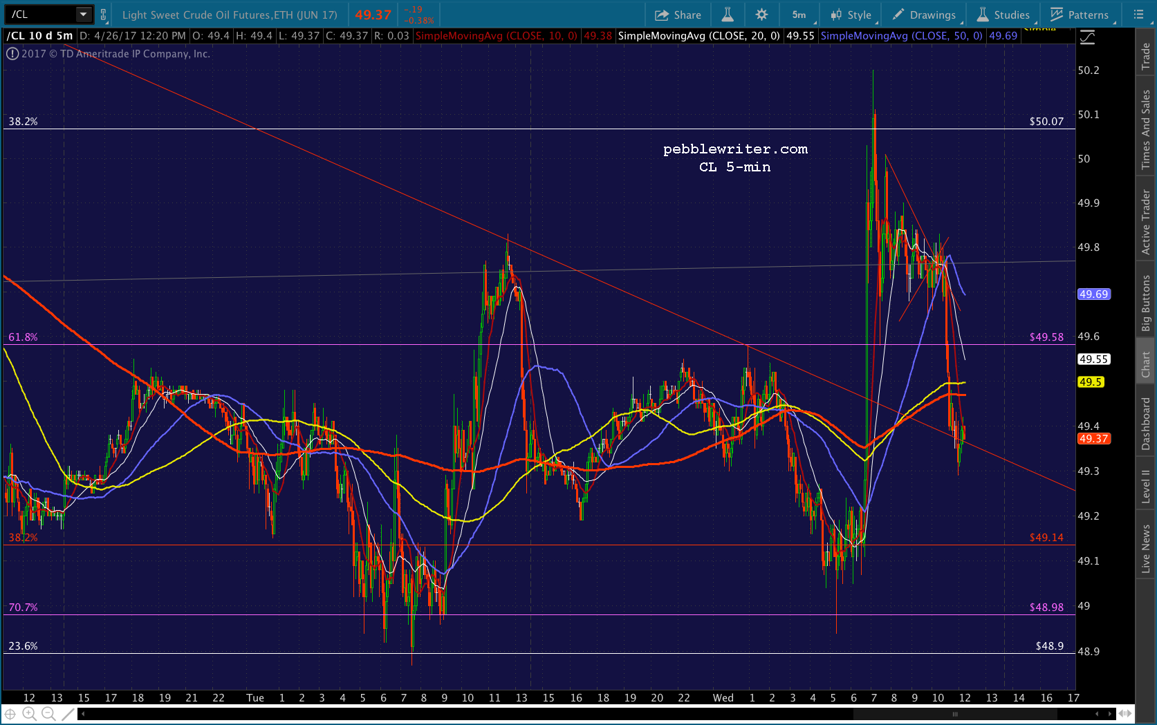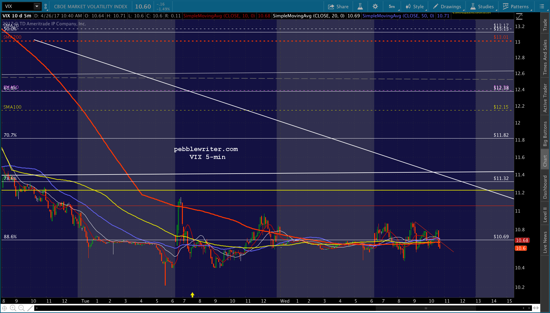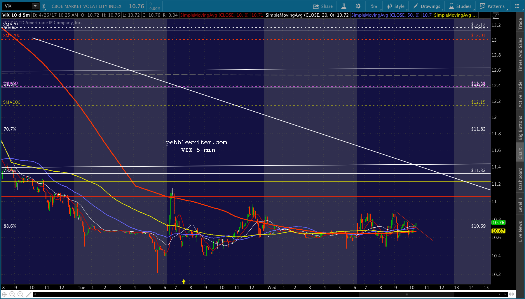 I think we’re going to get that push for ES’ .886. The safe play is to go to cash here, though swing traders might want to give it a little leeway. If you do duck out, there should be ample opportunities to reenter if the move later reverses. Note that the SMA5 200 is now only 2 points away from the .707. If that’s too sharp a move — which it might be at 13 points — then it might make a more attractive target at the .786 (the smaller white dot) around 2PM.