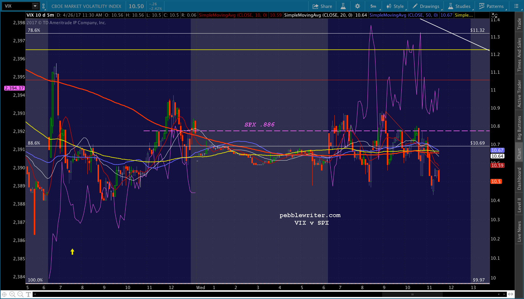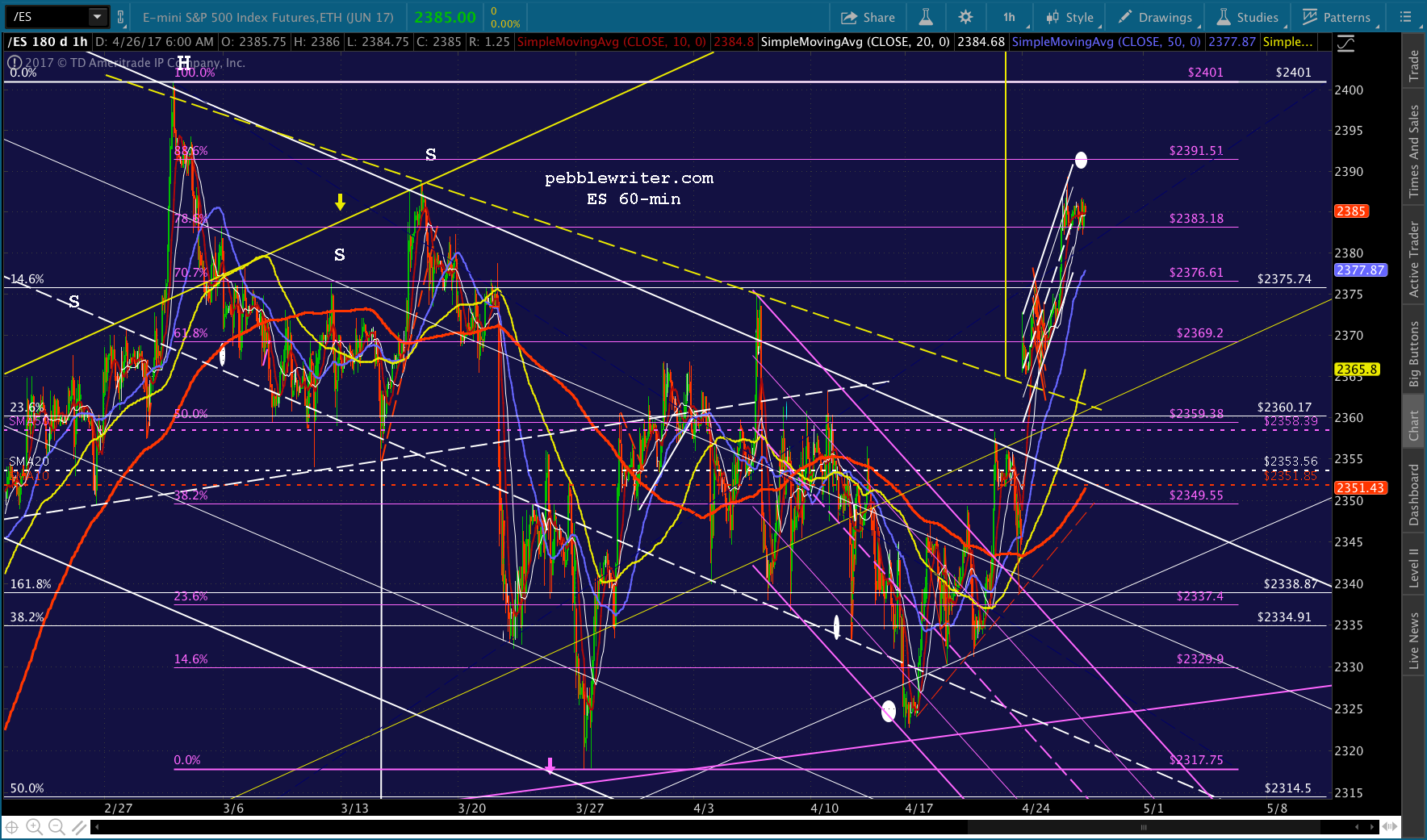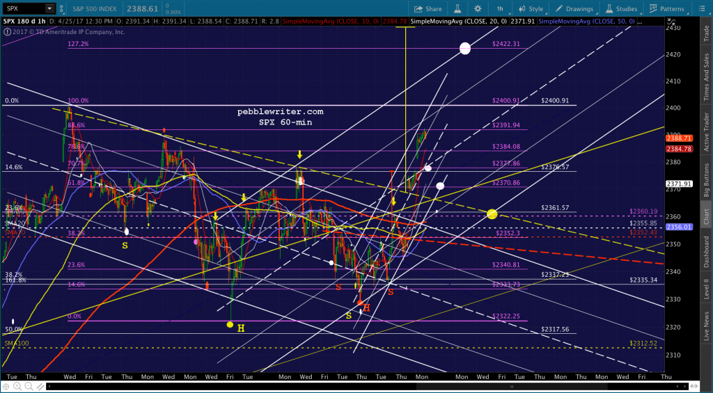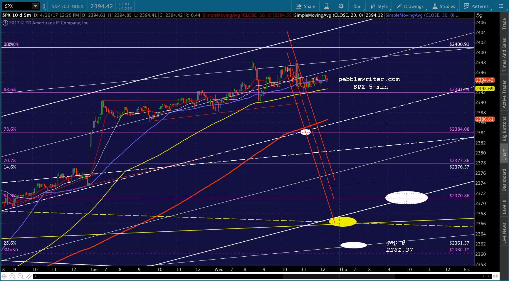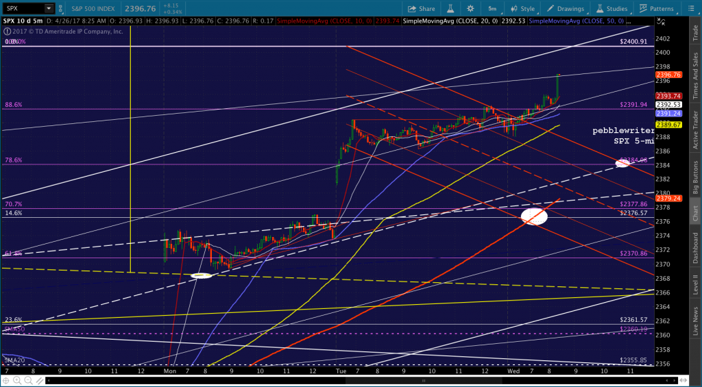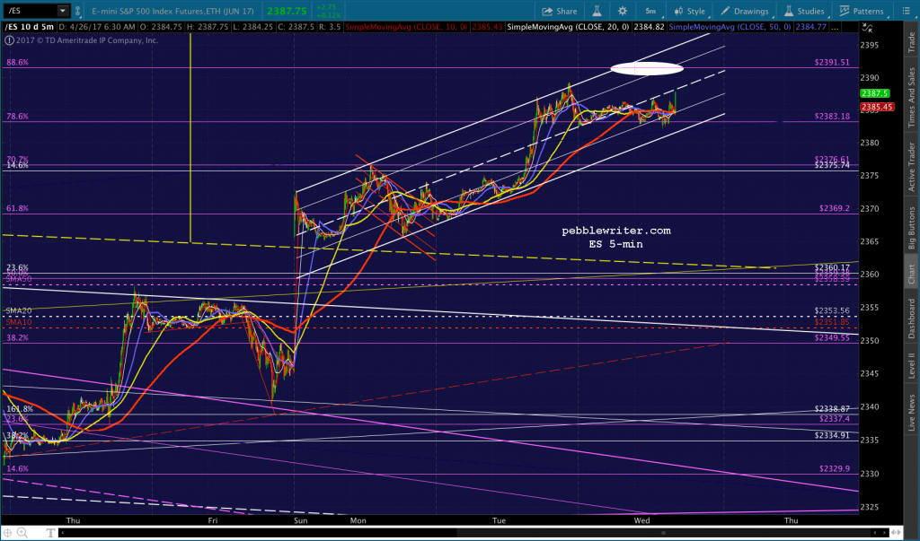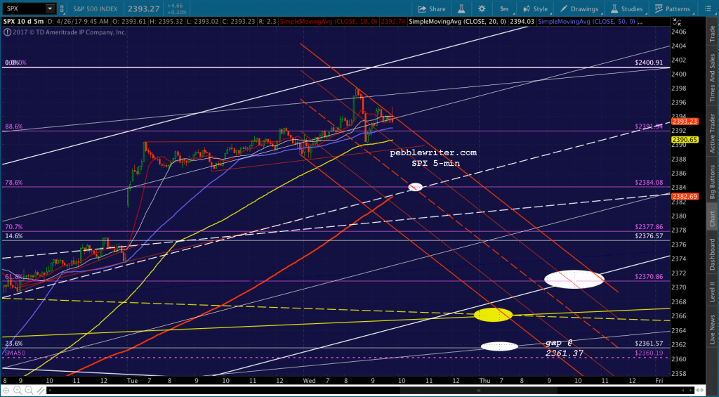 ES just dropped through its .886, so I’d take a chance on shorting here. If SPX can drop through its .886 as well, we should get a shot at 2384. The SMA5 200 looks like it will arrive there around 1:45 – 2PM. Two other levels of support to be aware of: ES’ SMA5 200 at 2385.25 and its white channel bottom currently at 2382.42.