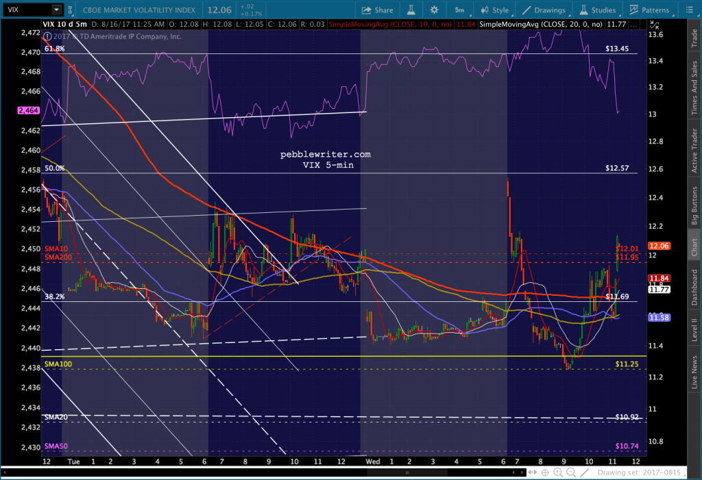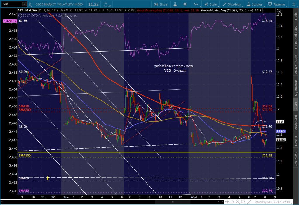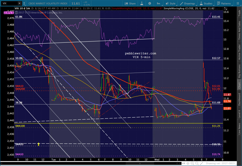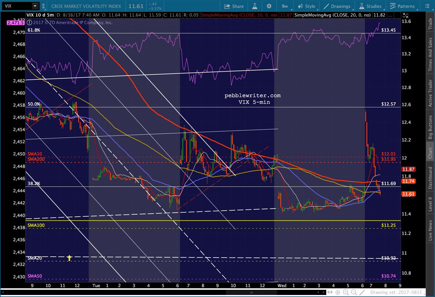 There’s the .618 tag, and VIX is rising slightly while CL falls. I’ll assume this is a slight overshoot and look for a reversal here — at least to the .500 but more likely to the SMA5 200 or .382.