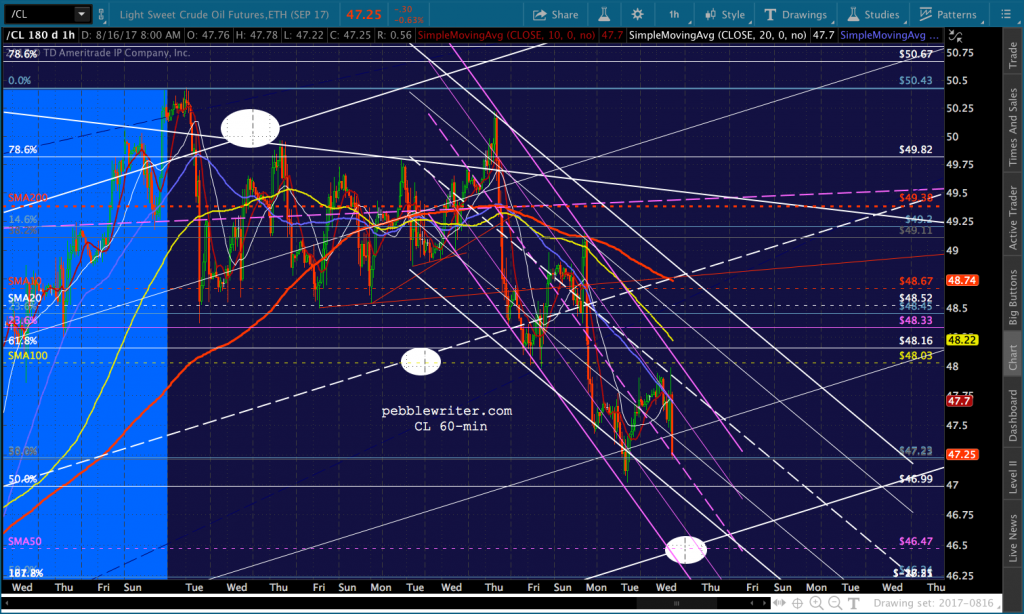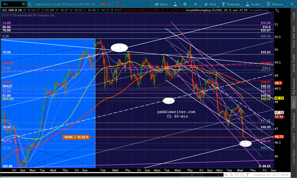 The big question is whether SPX can hold above the .618 even after CL drops all the way to our 46.47 target. We should find out shortly, but odds are it would require VIX to drop through 11.33.