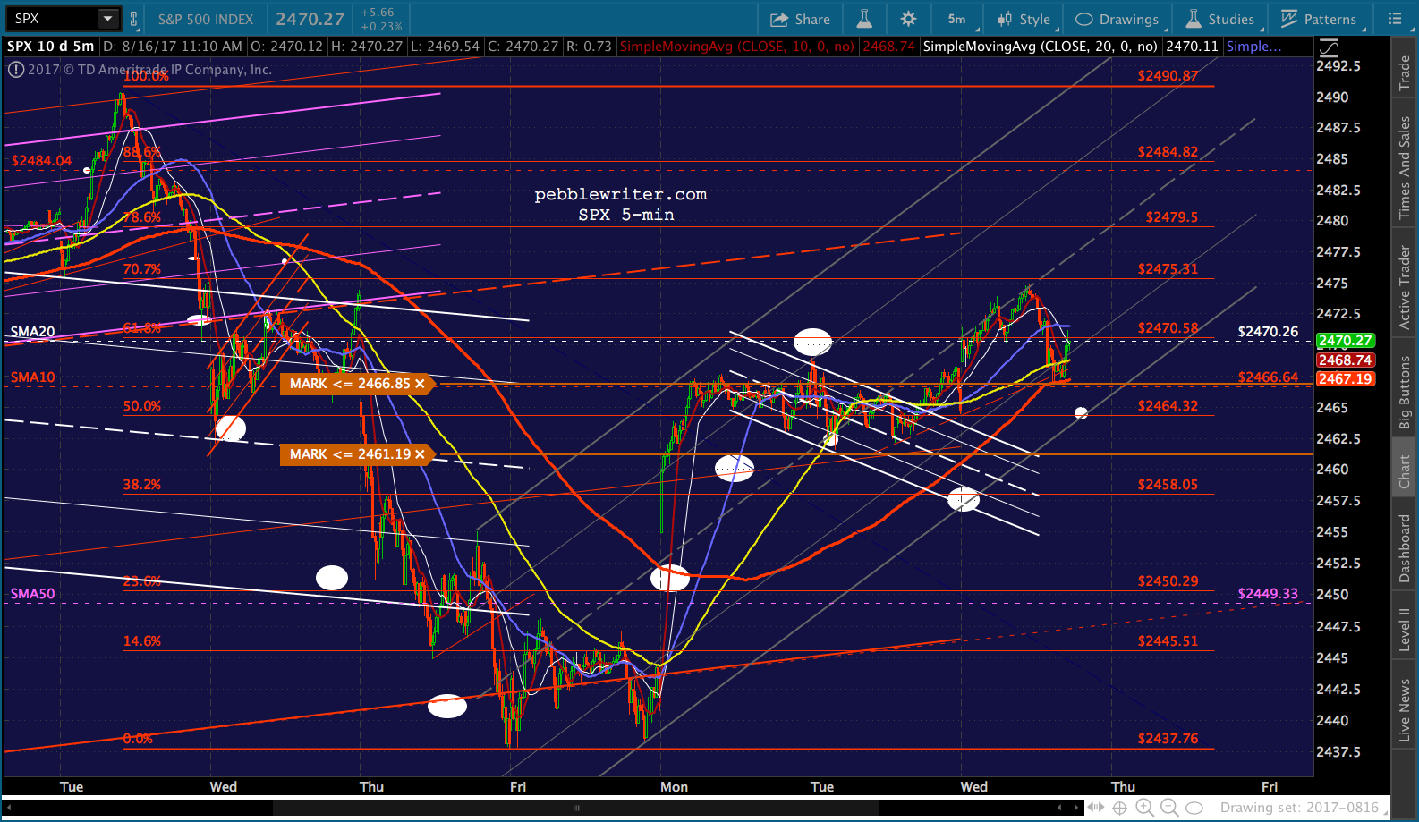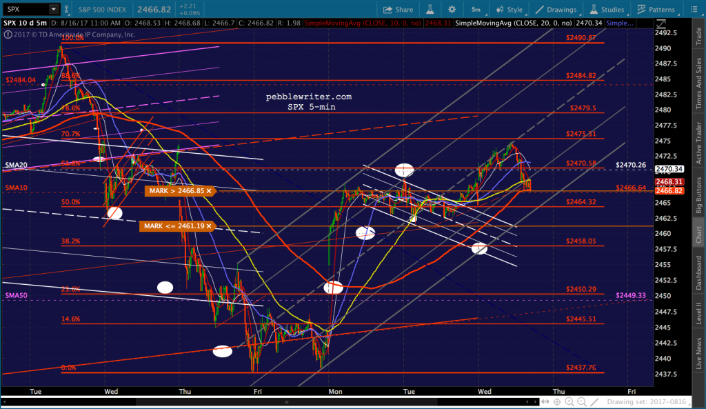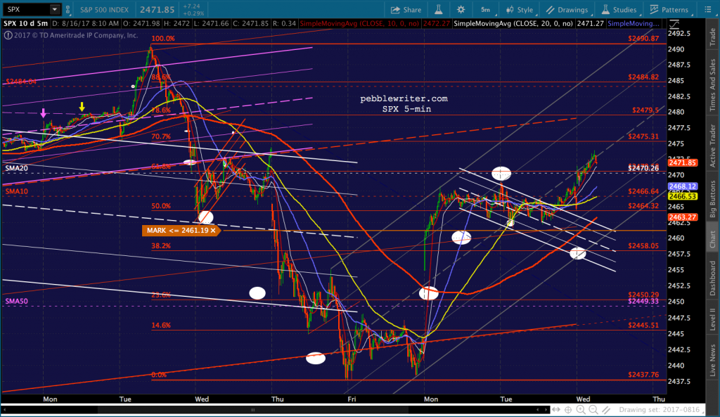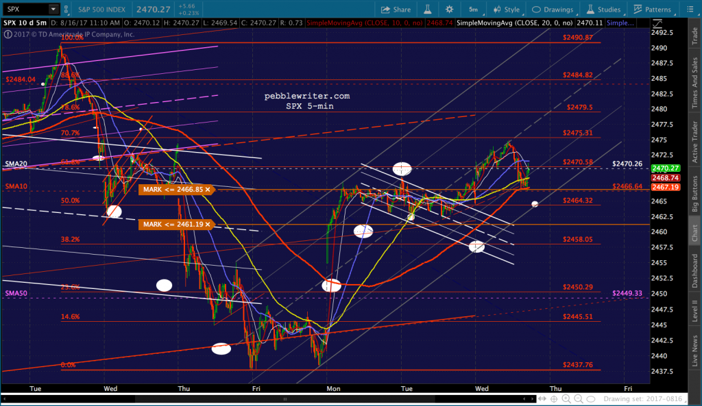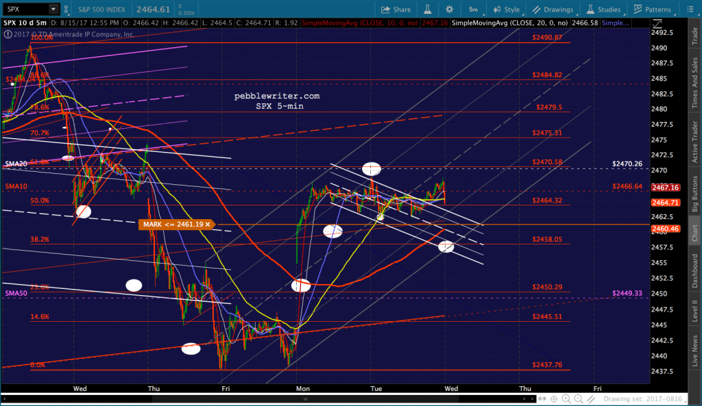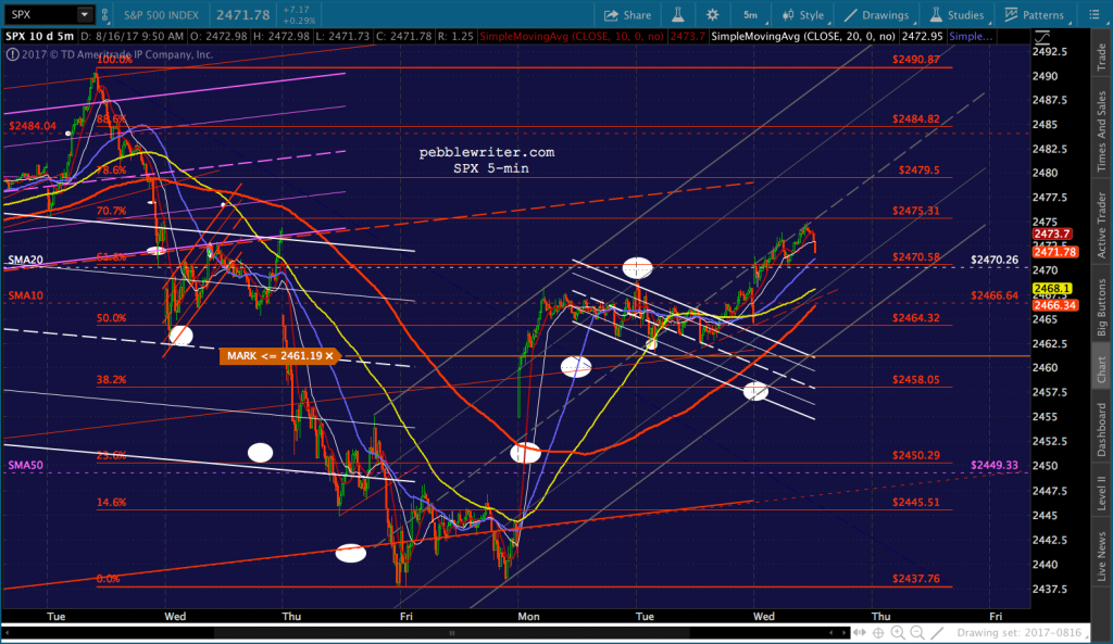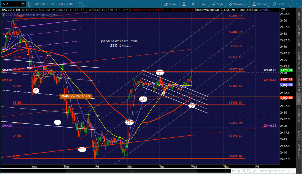 Amateur hour continues, here, as SPX has fleshed out the gray channel and tagged the .500, but CL still hasn’t reached 46.47. Should be safe shorting VIX and going long SPX, but CL should have a little further to go. Obviously, tight stops are in order — if the gray channel breaks down the next support isn’t until 2458, followed by 2450.