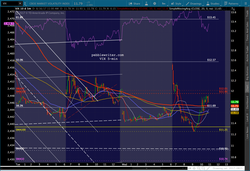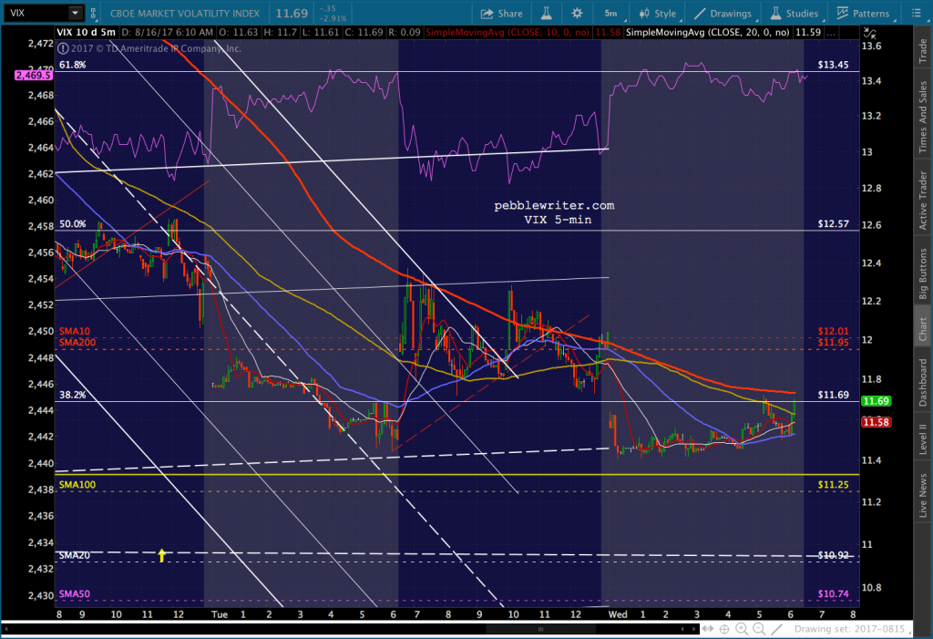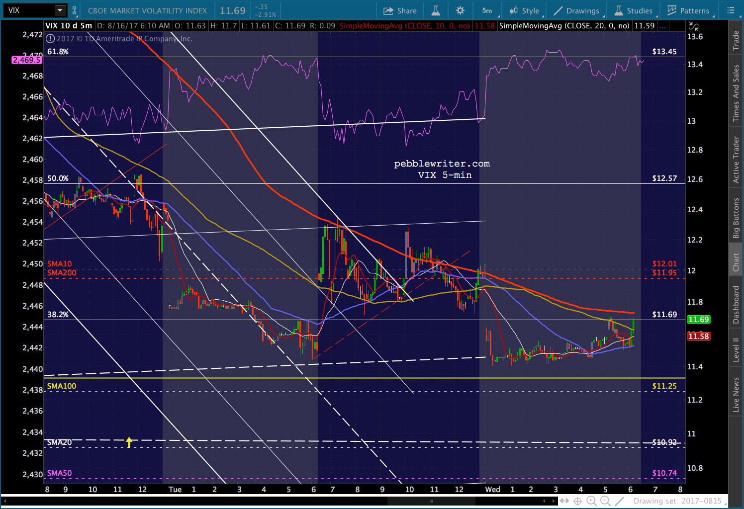 Looks like we’ll possibly get the SMA10 backtest as discussed above, probably when the SMA5 200 arrives at 2466.64. VIX has bounced at the SMA100 and back above the yellow channel line.