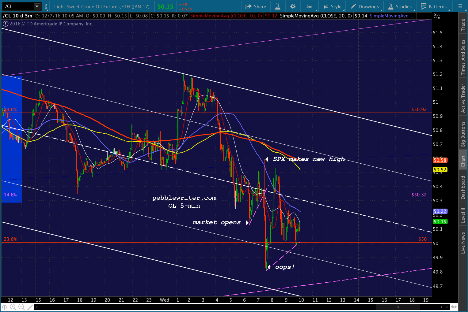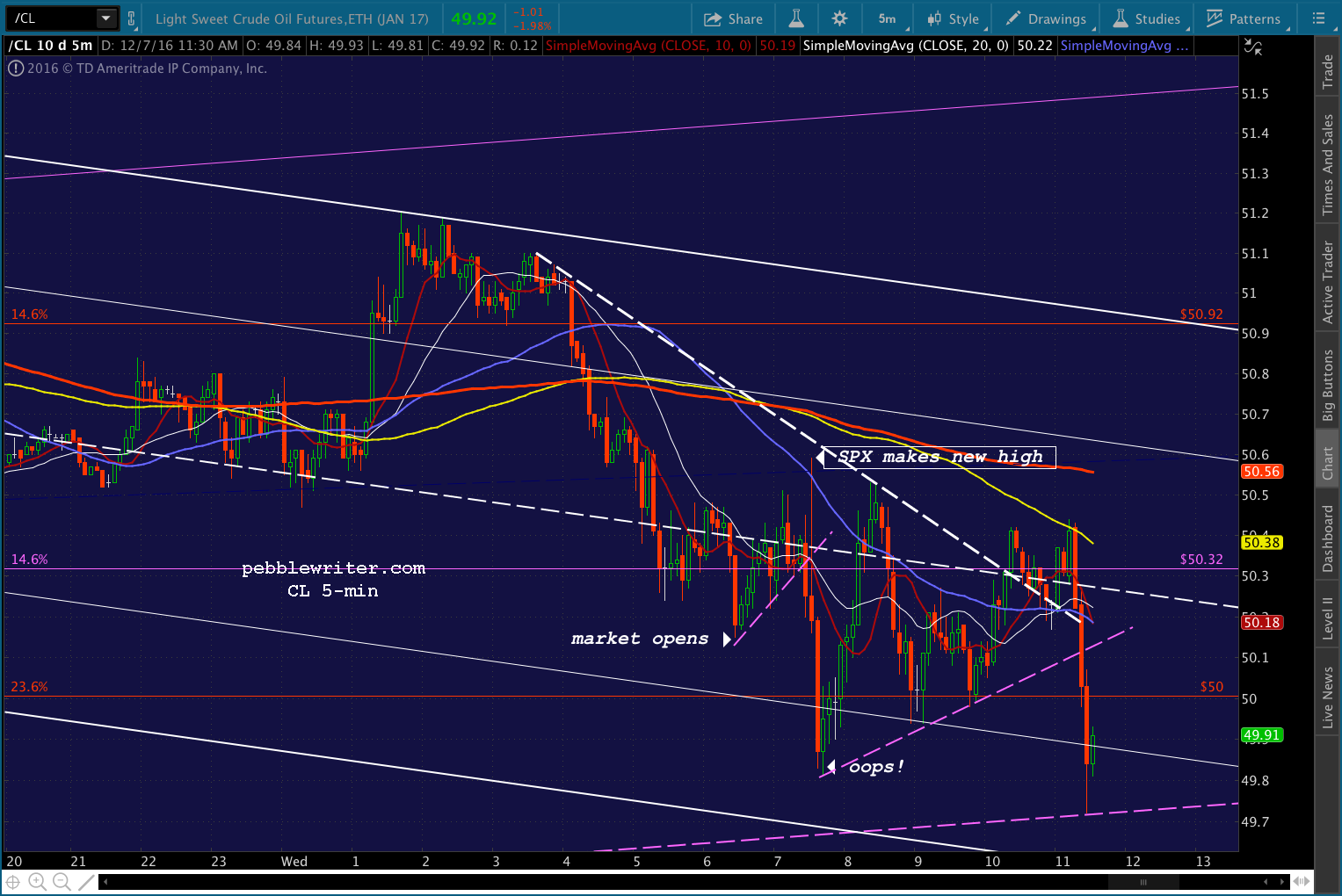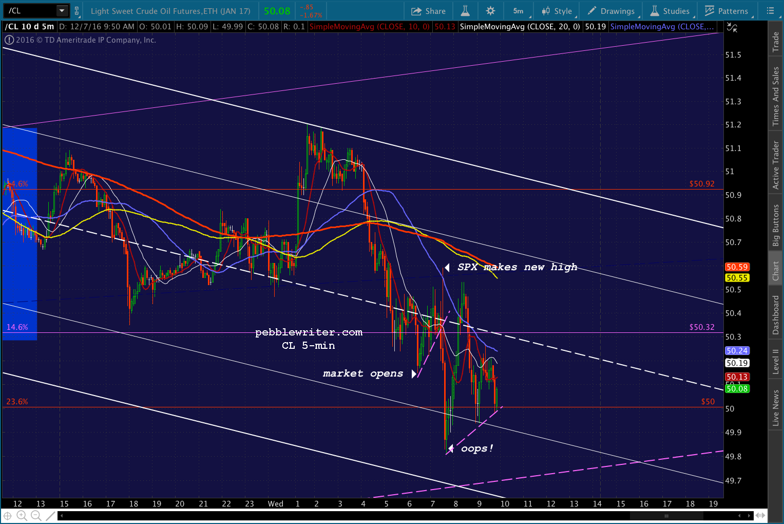 VIX is definitely making for the white channel top, now. For anyone who was stopped out earlier, this is likely a good spot from which to play the backtest. Note that CL is also breaking down.