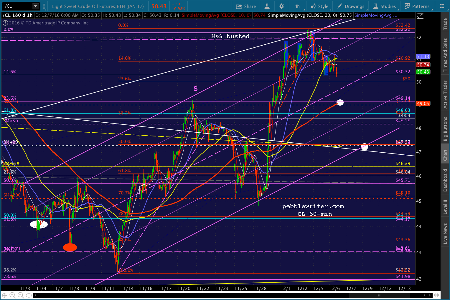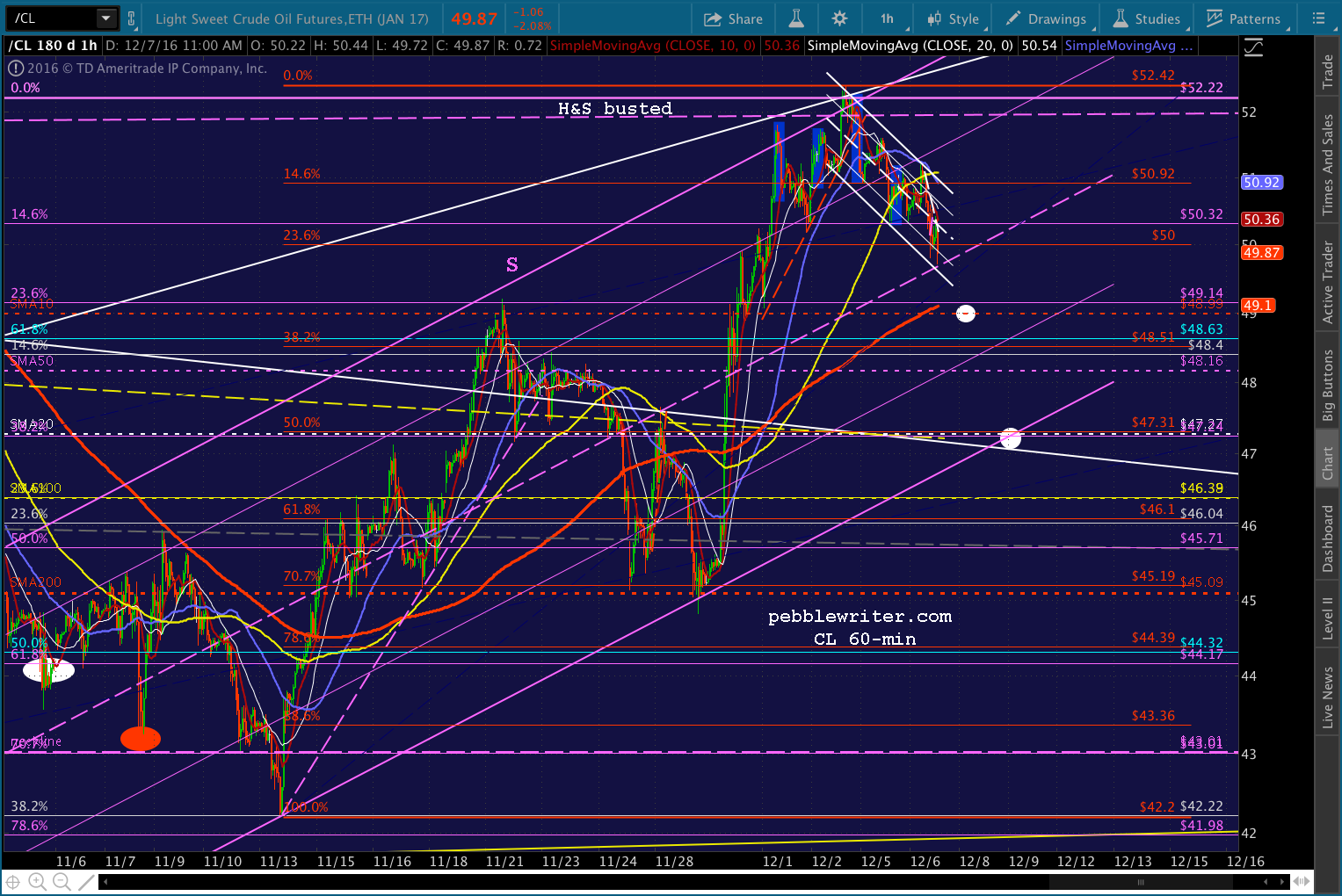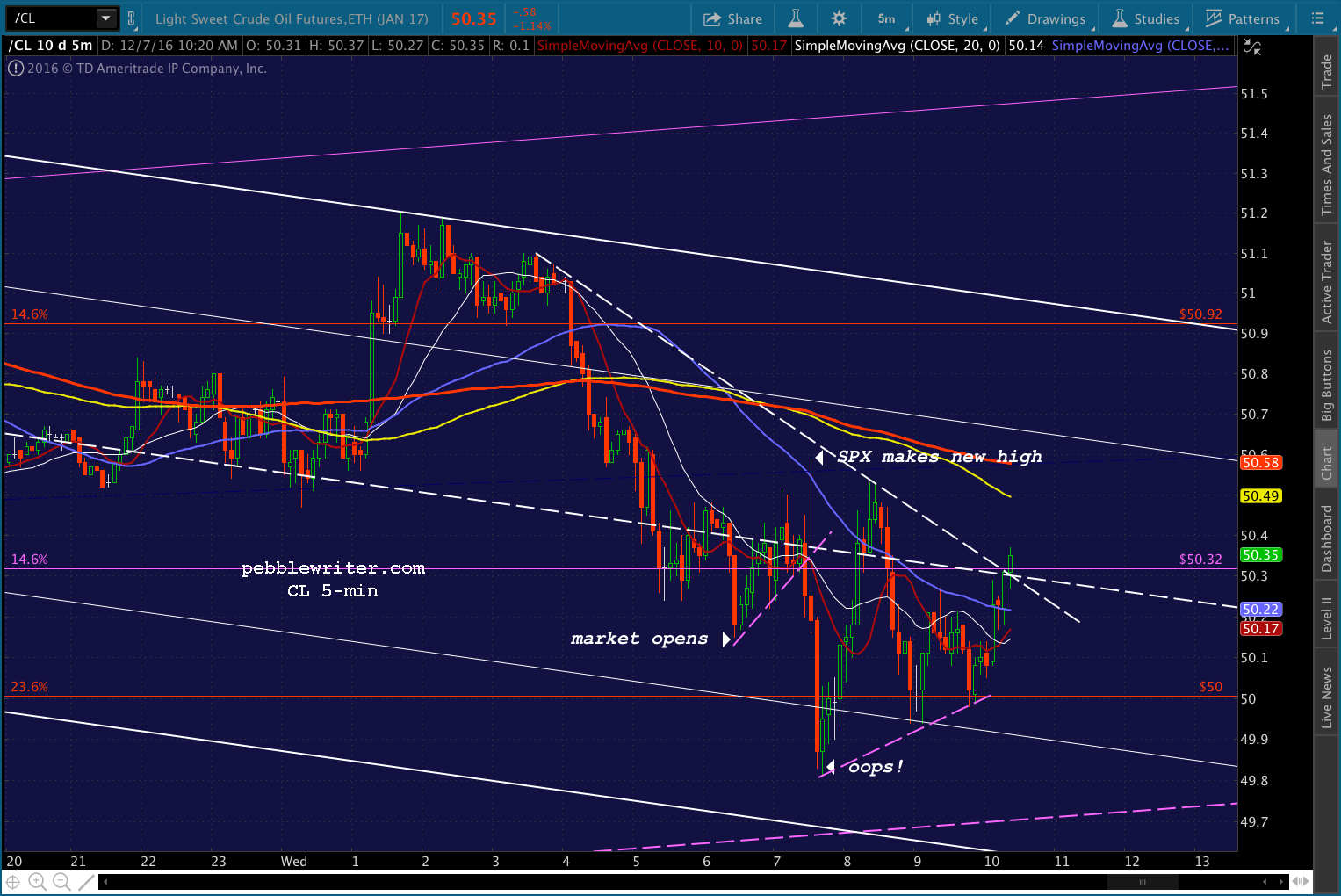 I misspoke a moment ago. ES 2224.17 is equivalent to SPX 2223.02 — the 1.272 extension of the drop from 2134 in May 2015 to 1810.10 in Feb 2016. Neither ES nor SPX put in much of a reversal at their .786s, so 1.272 doesn’t really stand out. But, under normal circumstances we’d at least see a reaction there. With CL accelerating here, we might be ditching the short any second.