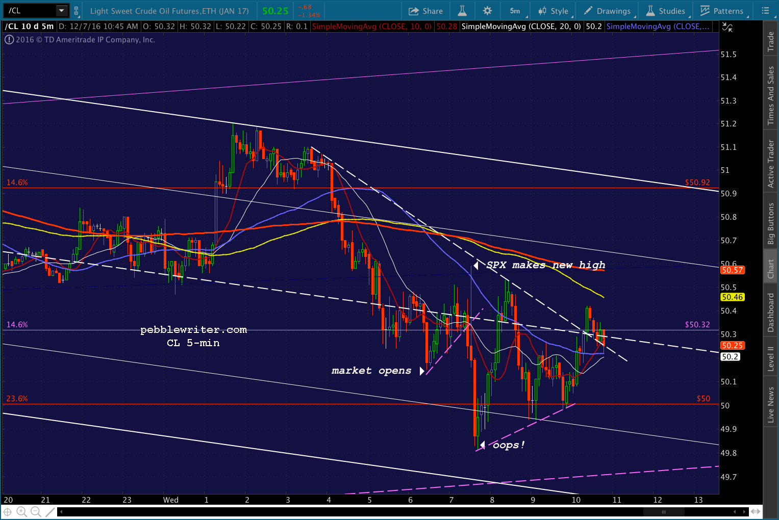 Interesting that CL finally judged it safe enough to complete its reaction to a rather suckish EIA report. If it drops through the purple channel midline, it would open up the downside for SPX. However, there’s an excellent chance it would wait until after the close when ES is easily propped up.