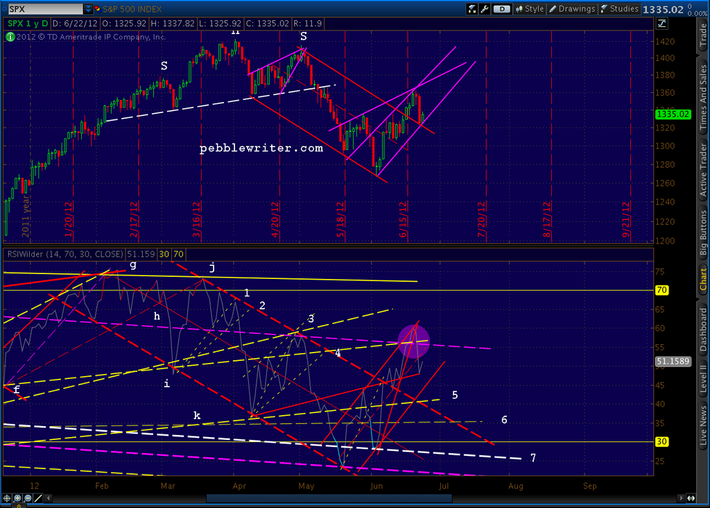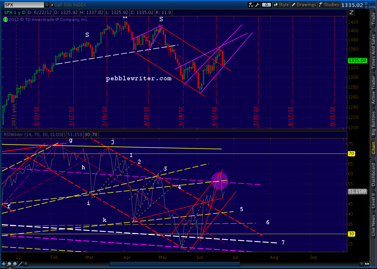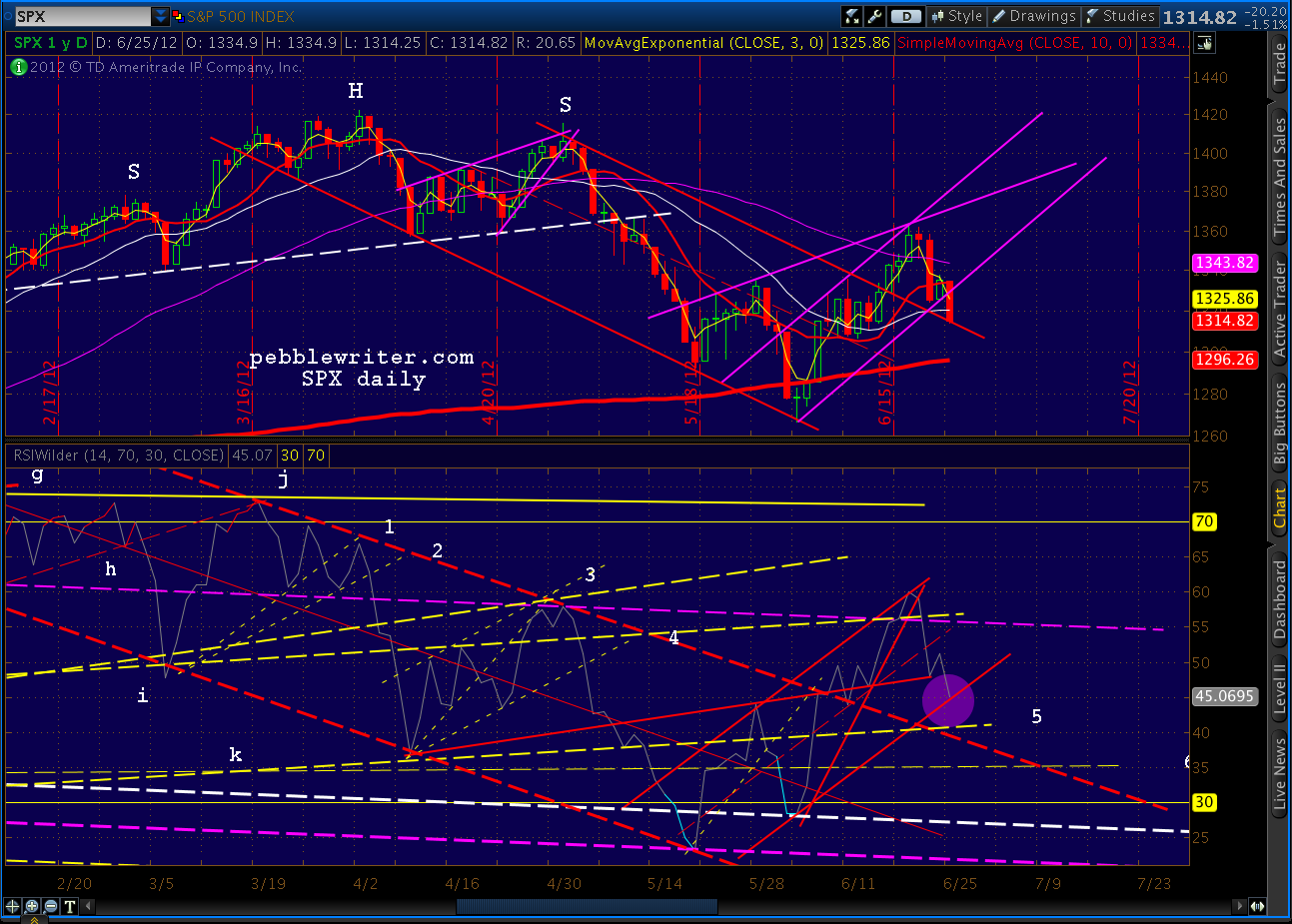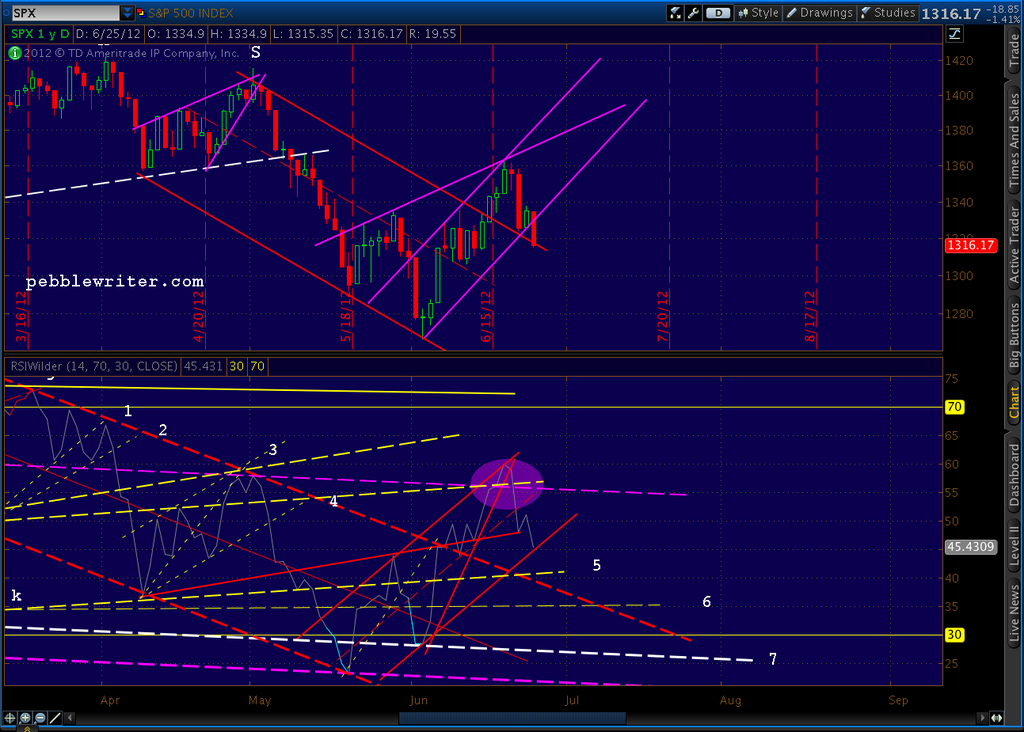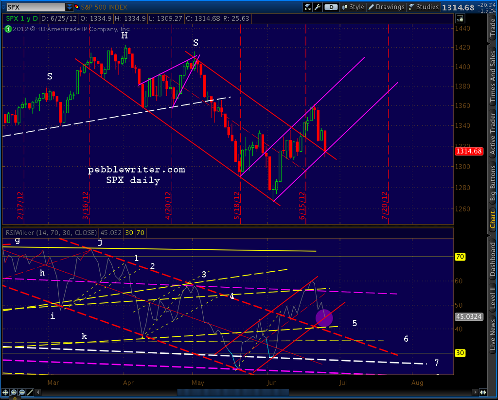 That was a clean break of the price channel, but RSI is still intact. I dumped my longs as discussed above, and will look to jump back in if prices firm back up at the lower RSI channel tag. This should also correspond with a back test on the last major channel down from 1415 to 1266.