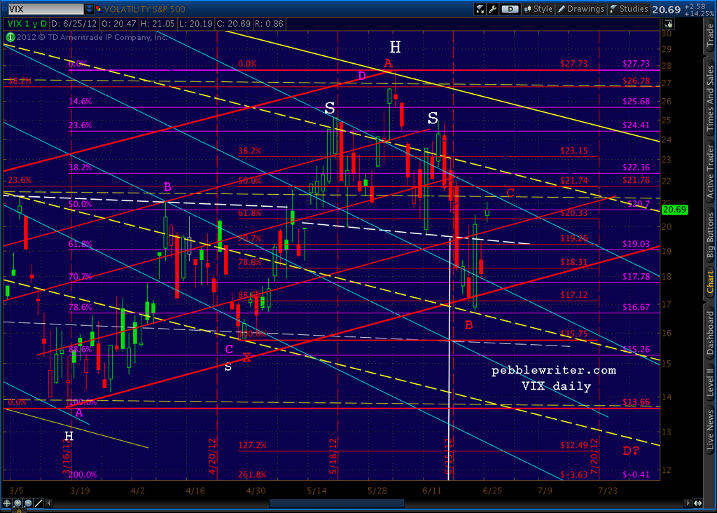 hey again, Michael – my naivete is getting the best of me. if the VIX achieved its point C a couple days ago, shouldn’t it now be heading to point D in a rapid fashion? my understanding is that the VIX point D would largely sink up with SPX’s point C. am i totally off base? (it wouldn’t be the first time by any means..) or are you simply saying the VIX is a little late to the party, ie, will decline rapidly soon enough – thus confirming your SPX point C being 1390-1400 hypothesis?