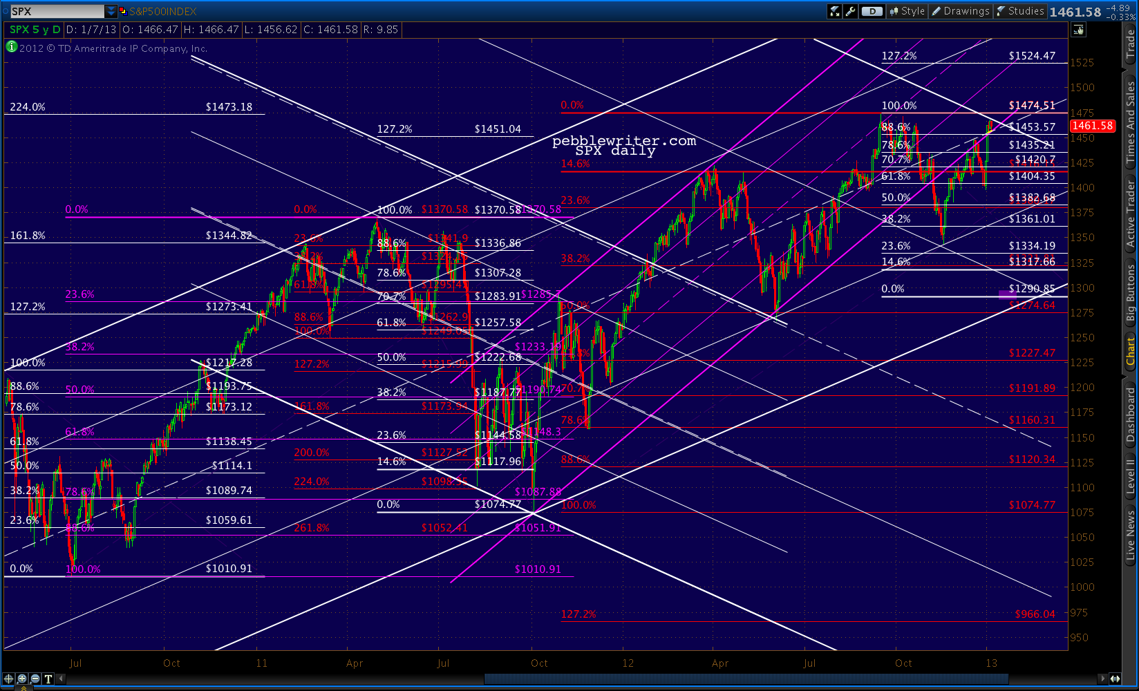 Note also that Friday’s high precisely tagged a fan line connecting the 2007 top to the Sep 1474 top. It makes for a nice channel top, too.