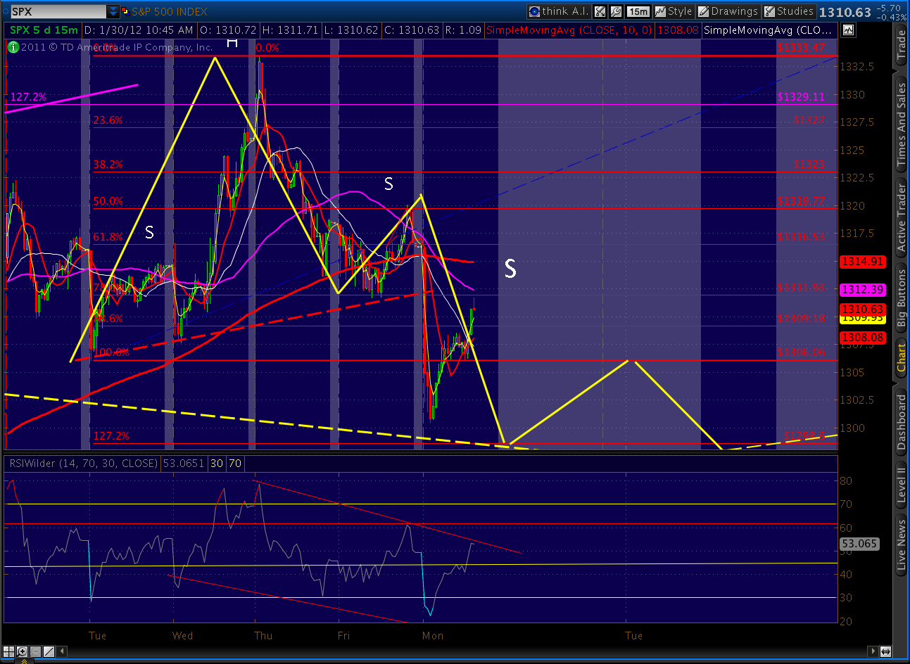 We just hit 1311.71 on what looks like an A-B-C corrective wave, very close to the 1312 back test target discussed at 9:40 below (which, upon closer inspection, should top out around 1313.8) We’ve also tagged the 15-min RSI TL, meaning we should turn back soon if this bounce is going to be limited to a back test.