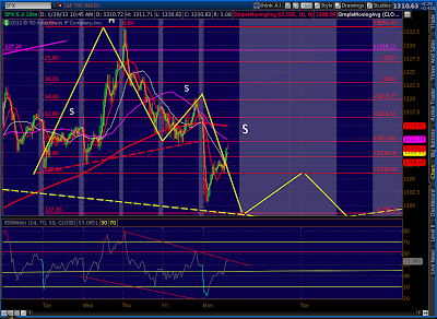 We need one slightly lower price move in order to complete the H&S; pattern we’re tracing out. And, the fact that Friday’s low came at .786 of the 1306 – 1333 move tells me we might be working on a Butterfly pattern. These typically complete at the 1.272 or 1.618 extension (1298 and 1289, respectively) — which is pretty cool as the H&S; pattern completes at 1288.