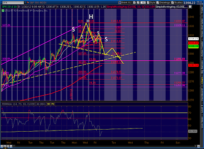 The market bounced at 1300, one of the three levels we were watching, and is currently back testing the neckline of the little H&S; pattern that started everything (see first post below.) The RSI TL is also being backtested, and should provide a clue as to when the back test will fizzle.