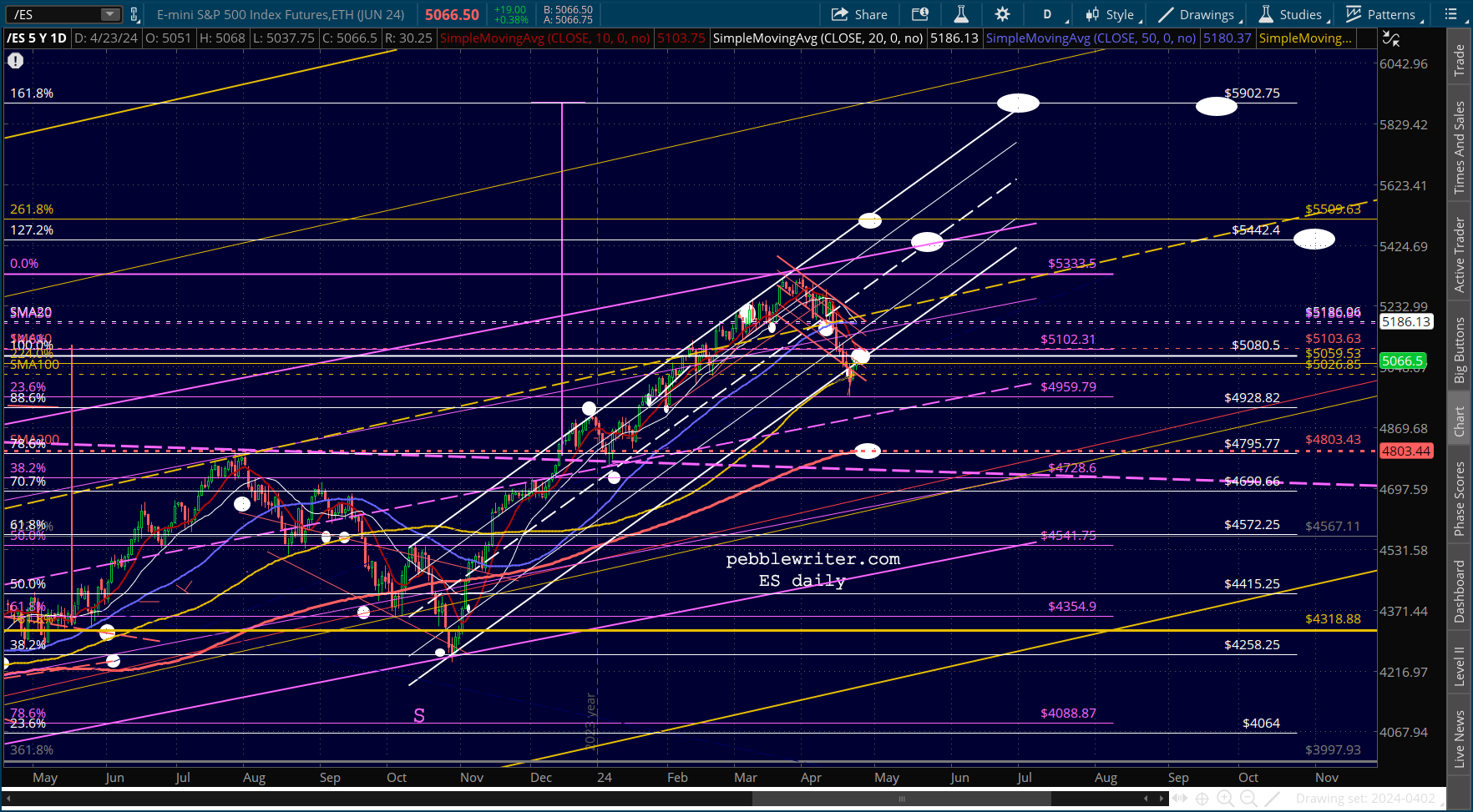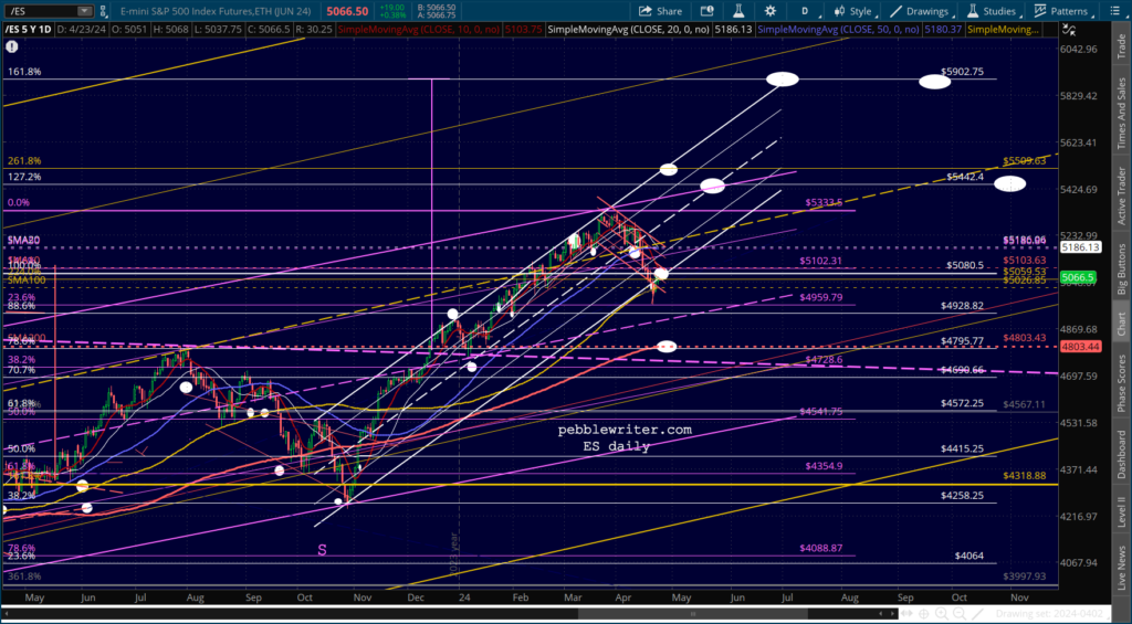 ES is trying hard to re-enter the rising white channel. So far, so good. But, the 15-min chart makes it look like three fails in a row.