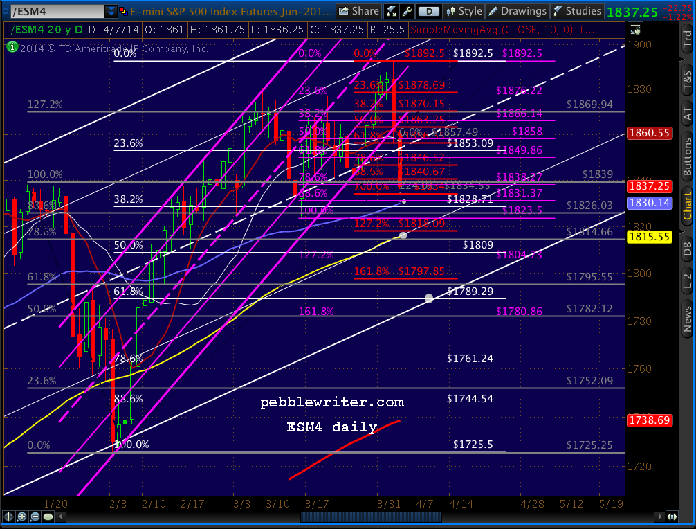 My best guess is the decline will be permitted to continue, with bounces at the key Fibs and SMA’s mentioned, finishing up at 1789 around Apr 11. It will constitute a 5.4% sell-off — not enough to satisfy the bears, but enough to deflect the criticism that the market isn’t being propped up by the Fed (it is.)