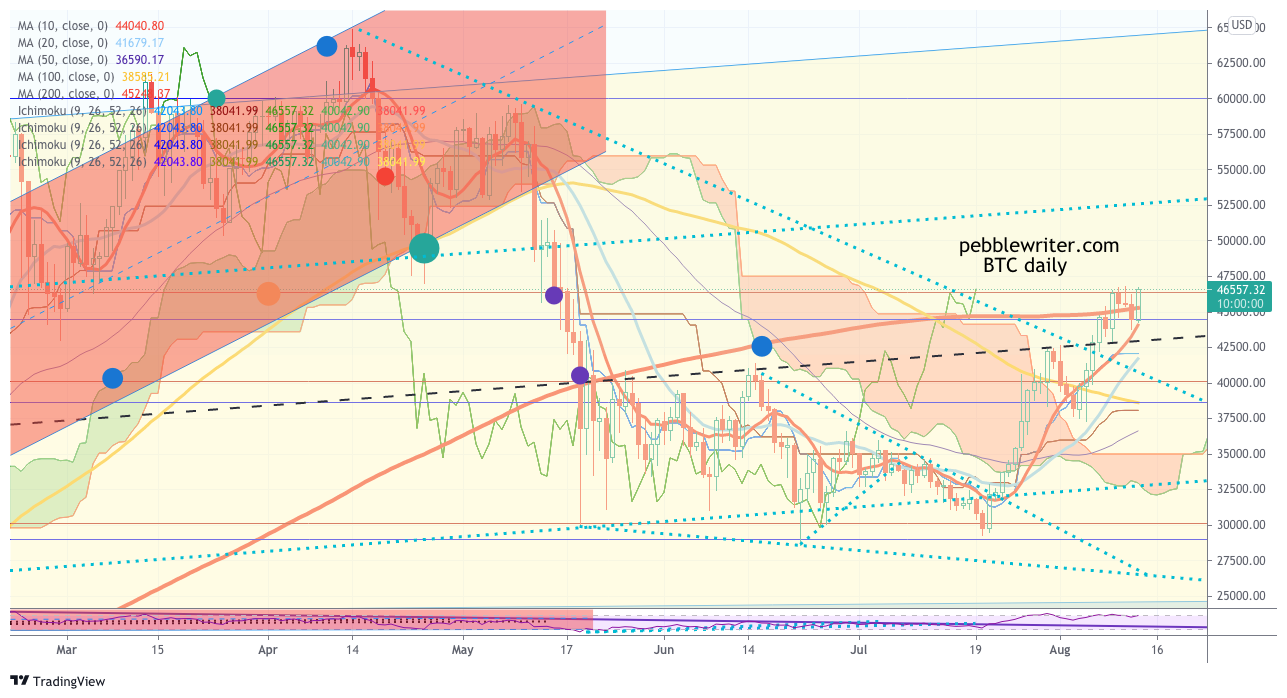 …while gold and silver are still paralyzed. Gold is backtesting its broken purple channel.