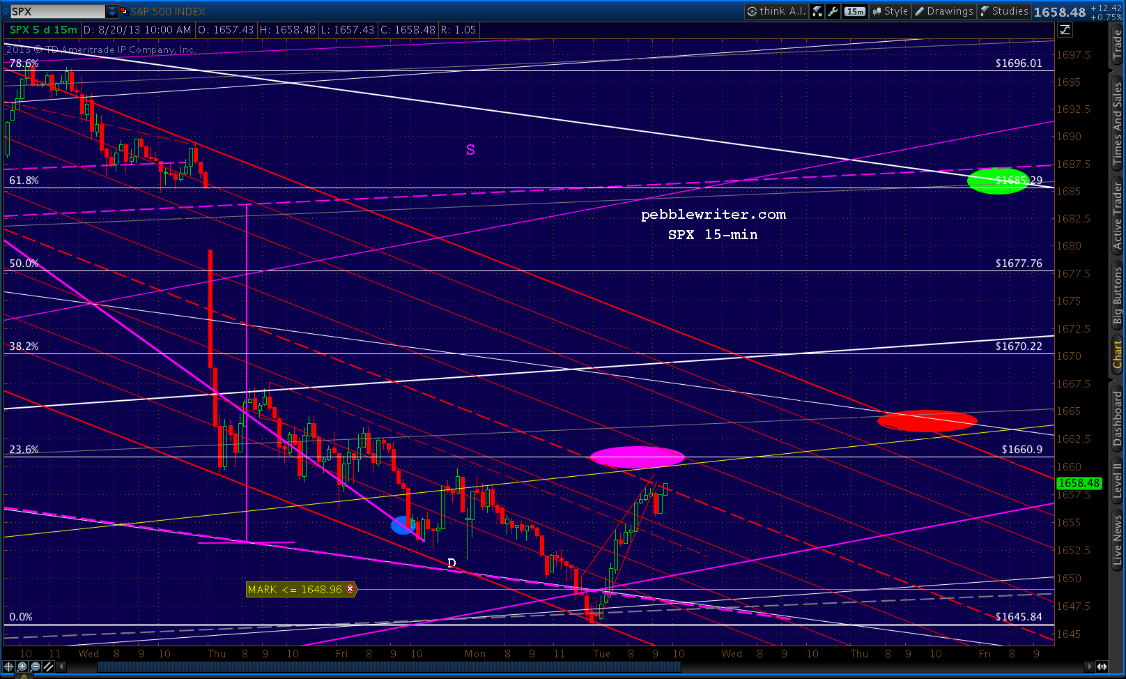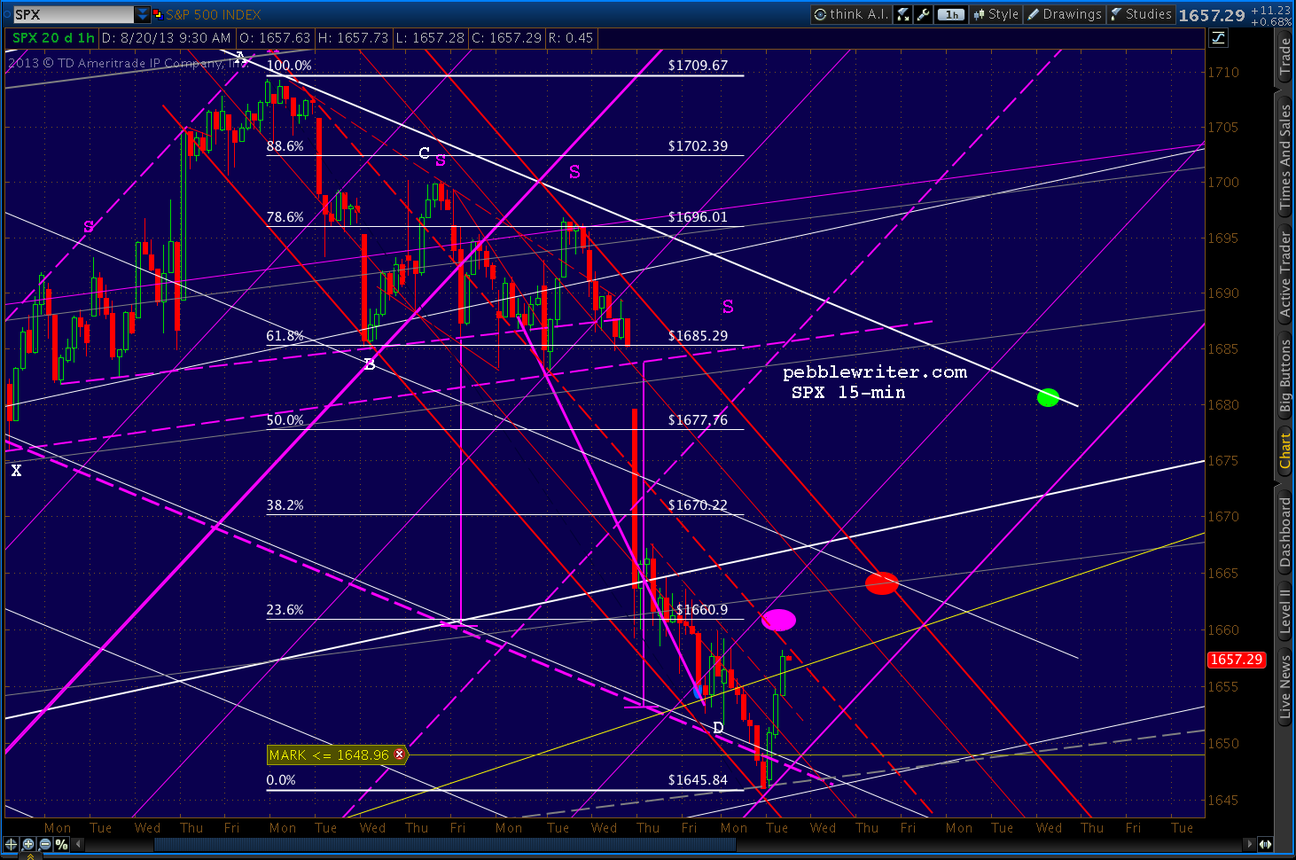 I have a conference call coming up, so might not get to post until after the close. I’ll go long again on any strength through the red midline at about 1657, and would stay long overnight if SPX closes above 1658.70 or so.