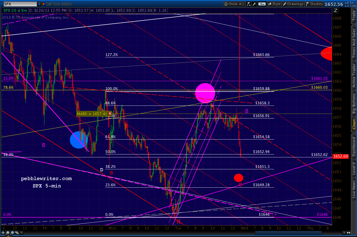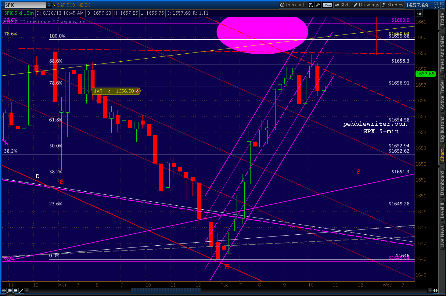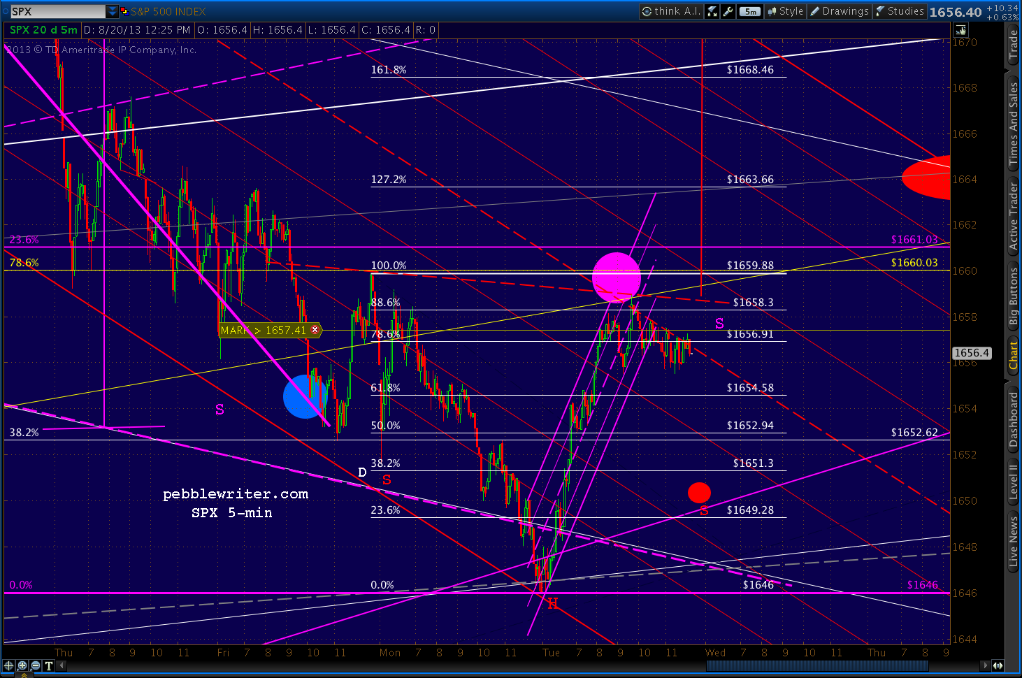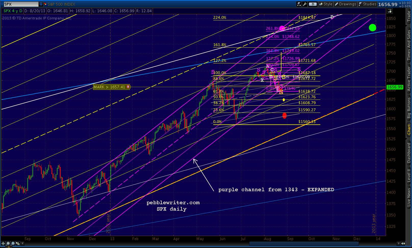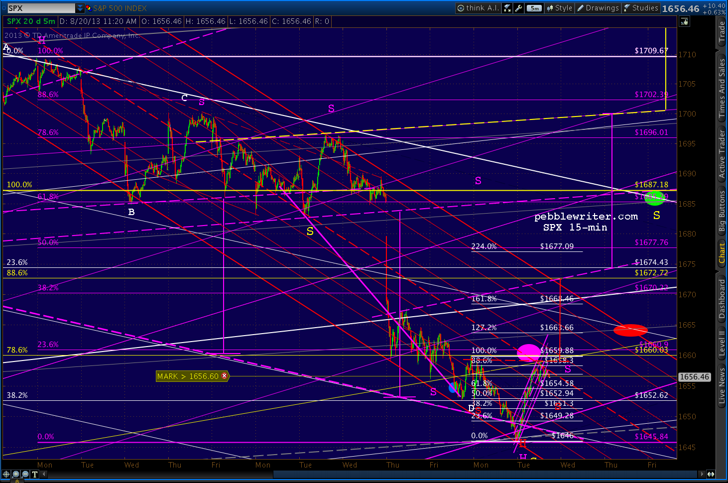 This is likely a fleshing out of the red channel, which has become quite lopsided with the price movement since last Thursday. If SPX can break 1654.79, the next resistance is the white .786 at 1660.86.