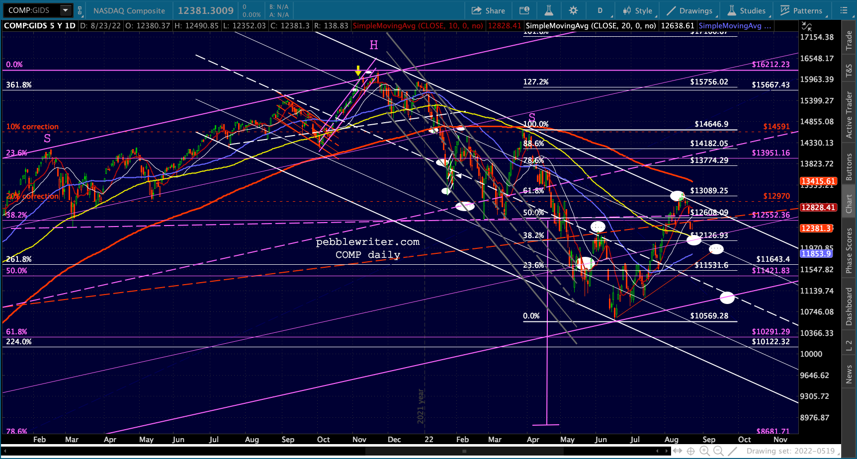 Given that ES, SPX and COMP have all retreated from their combination .618 Fibs and ES and SPX have have retreated from their SMA200s, it would seem the bearish scenario should hold.