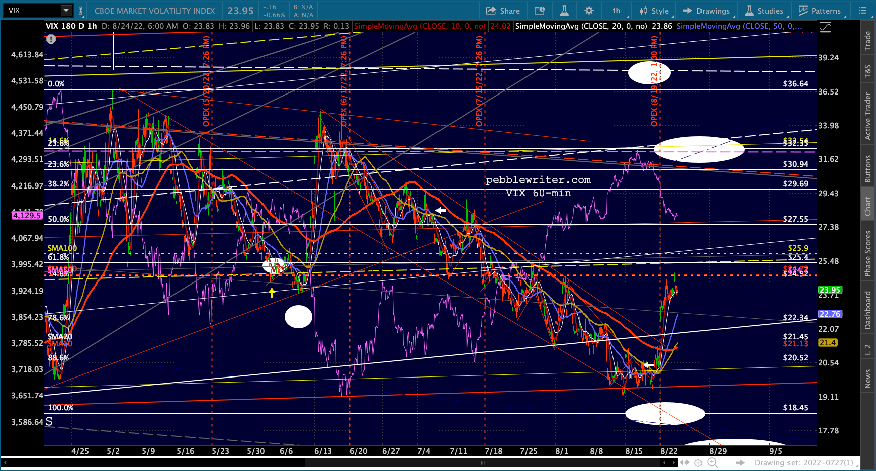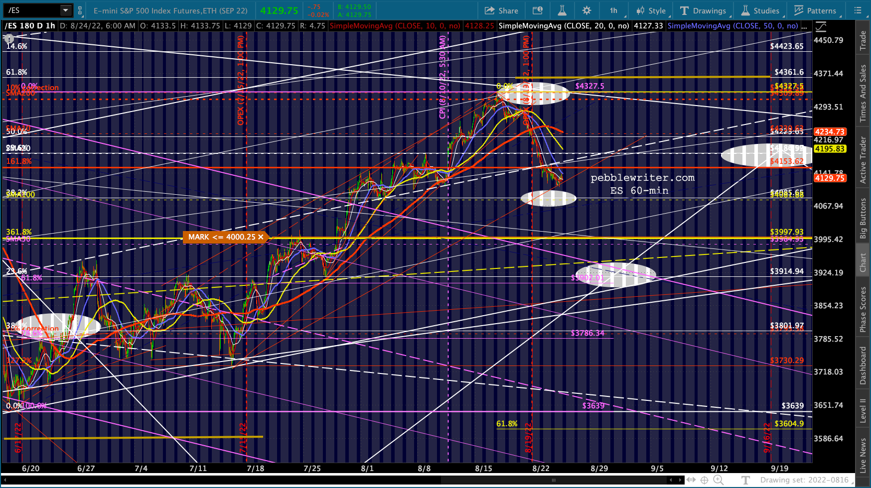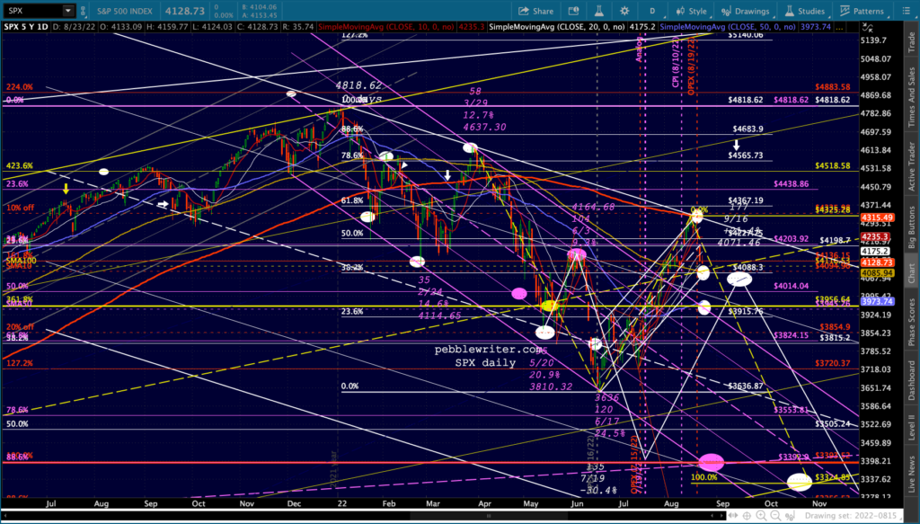 There are two competing narratives: a retracement from the white .618 to, say, the white .382 at 4085; or, a retracement to the .618 at 3902 on the purple grid.