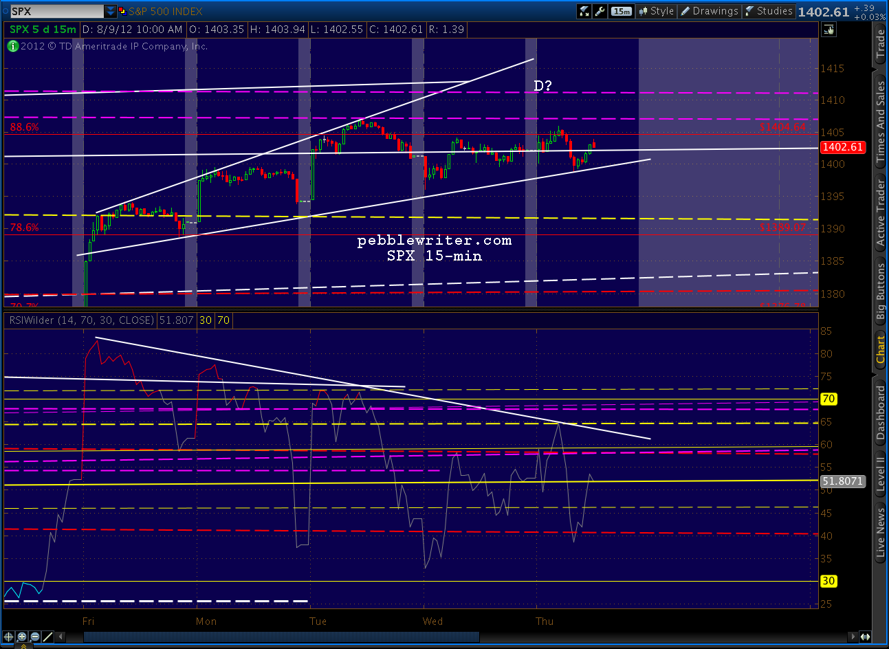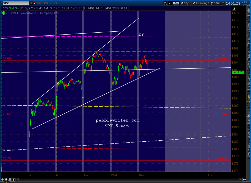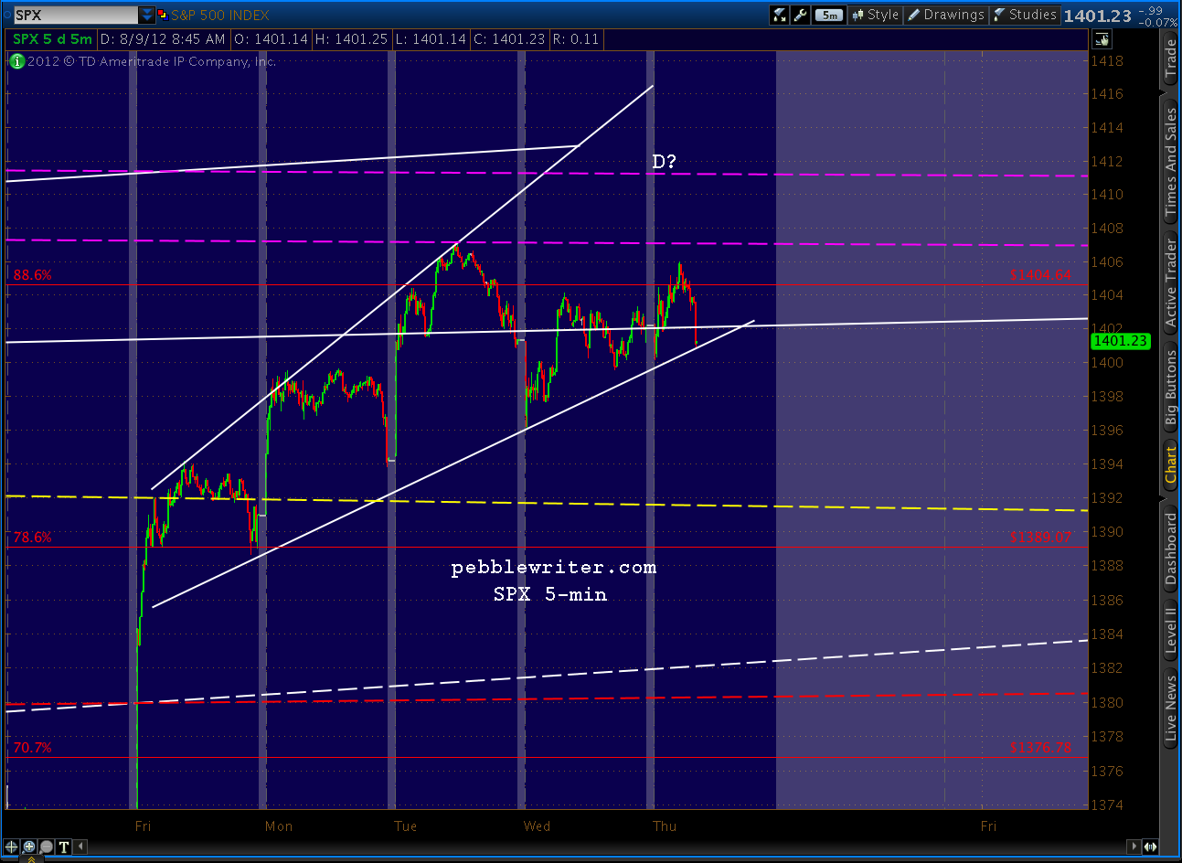 Meanwhile, SPX continues to respect the lower bound of the megaphone pattern we’ve been following the past few days. But, 24 hours of hugging 1402 is getting a little tiresome.