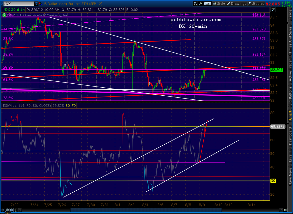The market’s still constipated. In DX, the 60-min RSI tells the story. The channel resistance is obvious. A break of the red TL should get things moving.