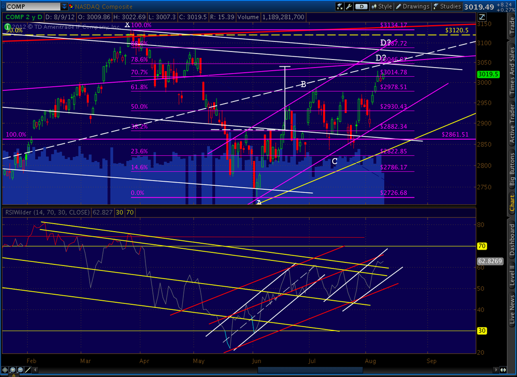 COMP looking like it wants to try for the next higher RSI TL (white or red, take your pick), which would likely correlate with the .786 Fib level. Like RUT and NYA, it’s just a hair beneath the level needed to complete a Gartley Pattern.