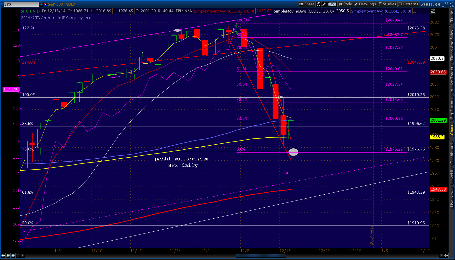 For starters, my leading scenario is that this morning’s low will not be broken until 2015. We’re now 154 points south of my 2138 target. So, I’m not sure we’ll make it all the way there by year end — only 10 trading days away.
