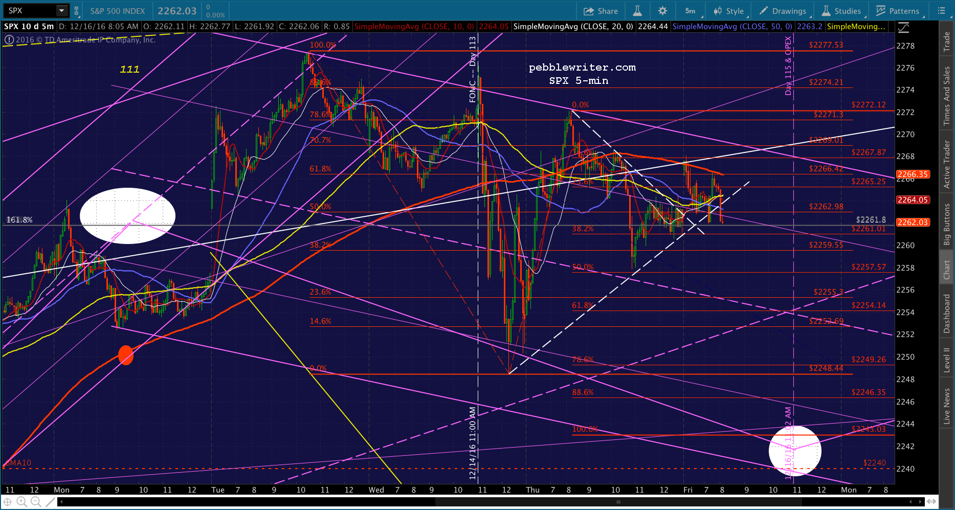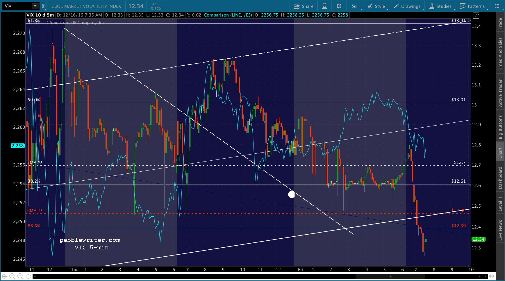 SPX has closed this morning’s gap, and VIX is already reacting. If they’re going to hold the line, this is probably it. Note the presence, also, of the SMA5 10 and 20 and the purple channel .236 line. I’d revert to long here at 2263.29 with very tight stops, only because they could derail or, at least, delay the downside by dropping VIX through the white channel bottom at 12.45ish. I don’t think they will, but we can always reshort if VIX bounces near there. I think we’ll be doing so shortly.