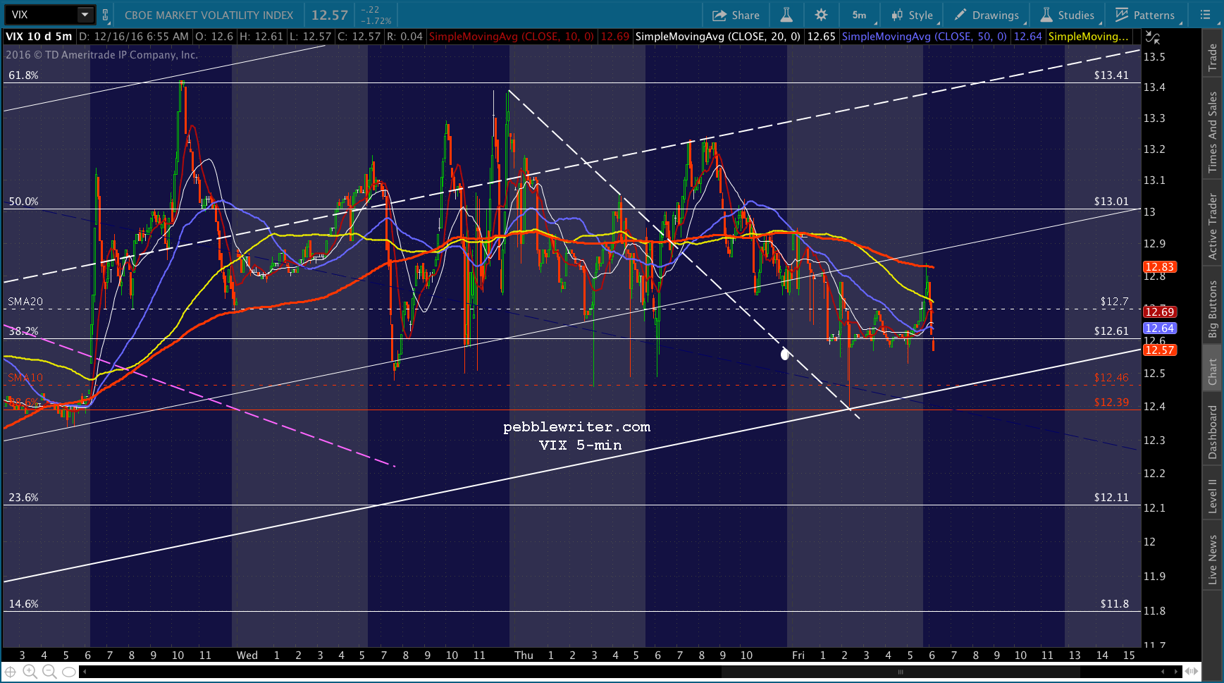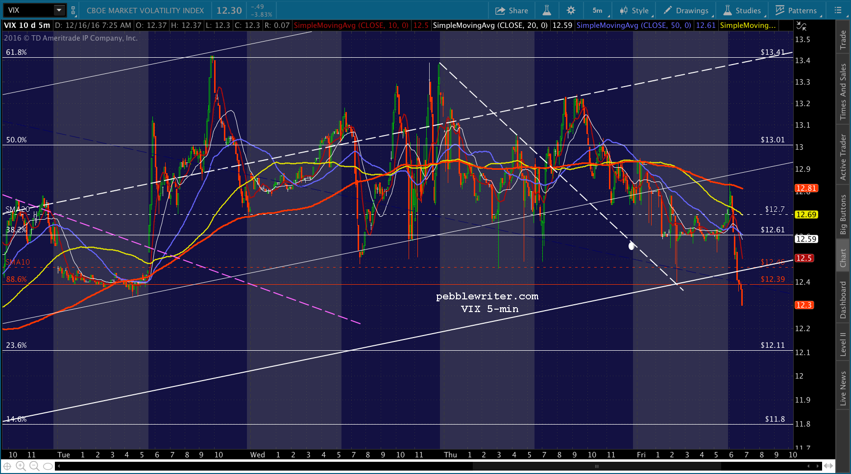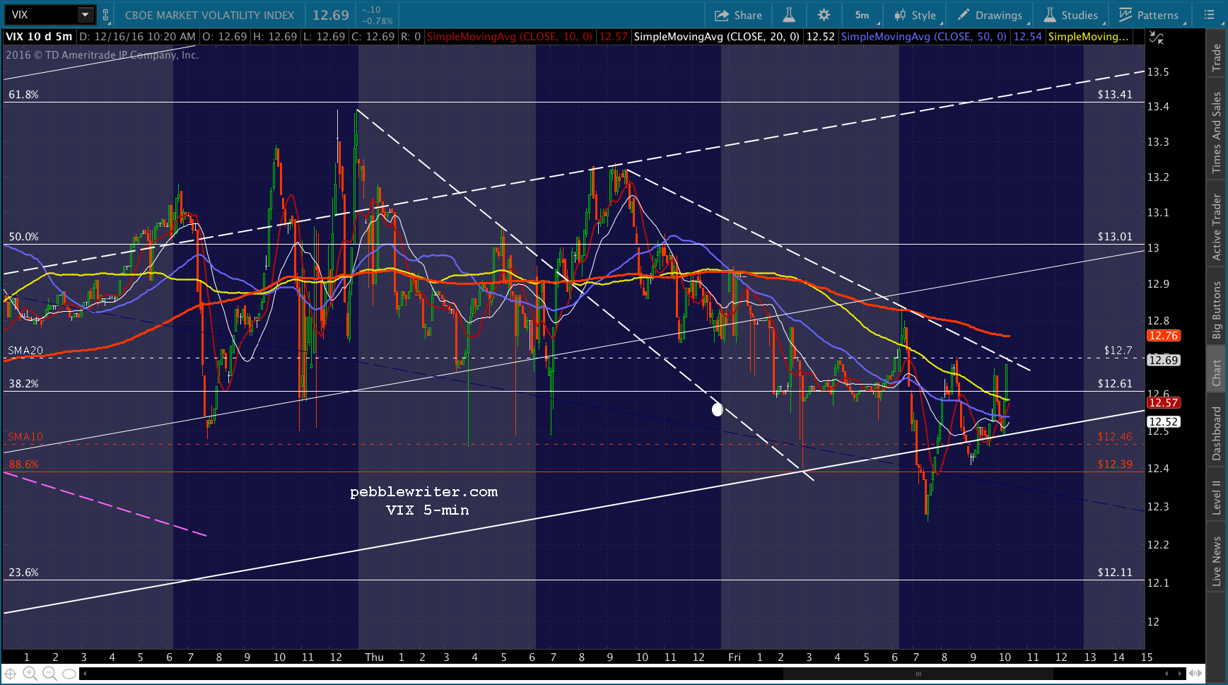 VIX has been smacked down again, overnight. Keep an eye on the SMA 10 and 20 at 12.46 and 12.7, as well as the SMA5 200 at 12.83. How VIX moves in relation to those should determine today’s price action for SPX.