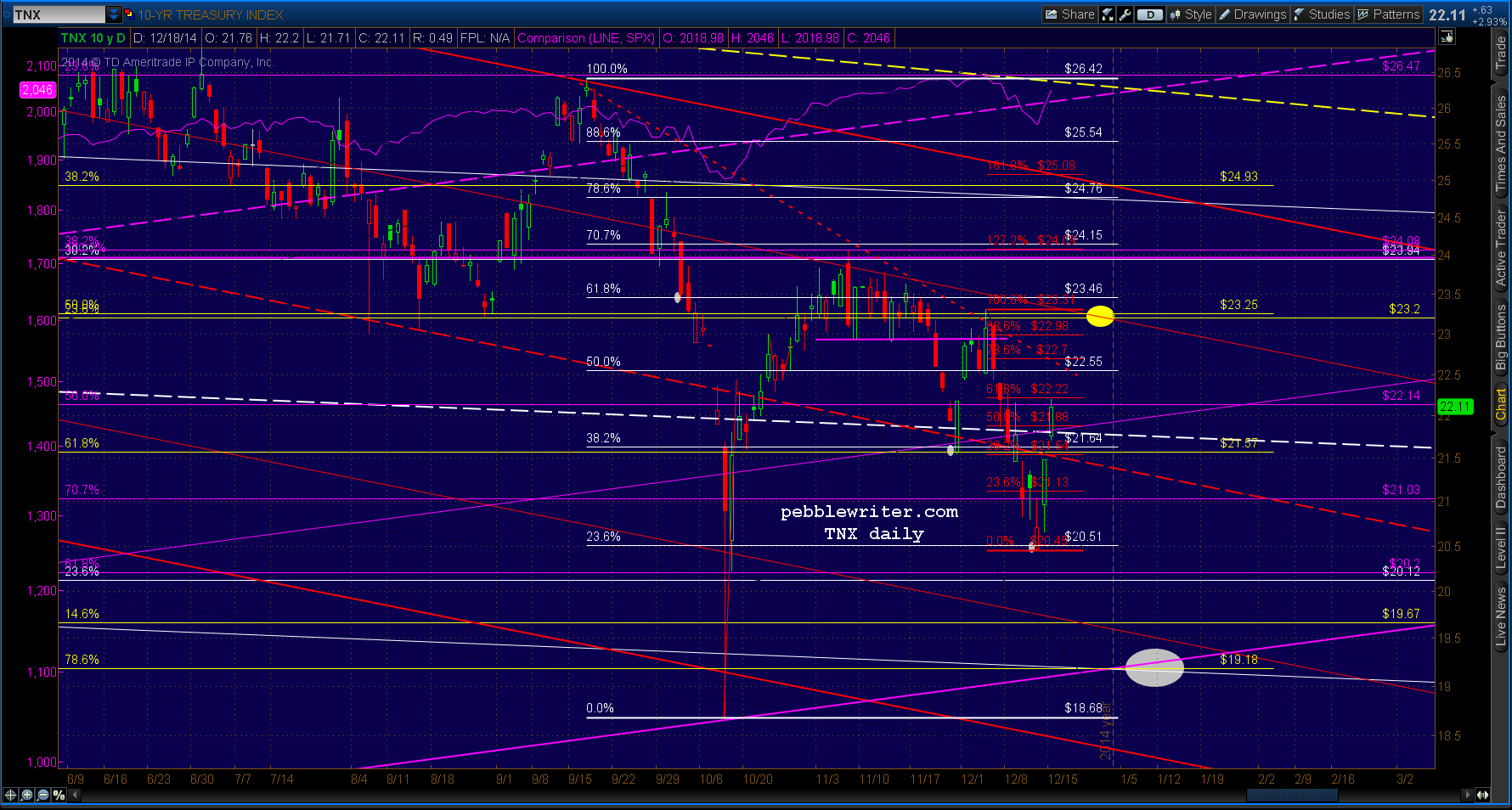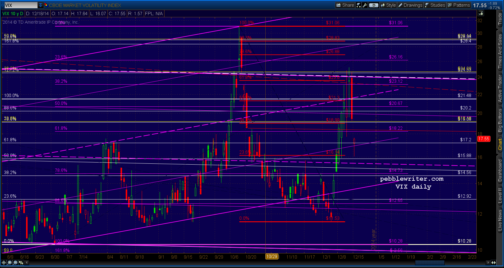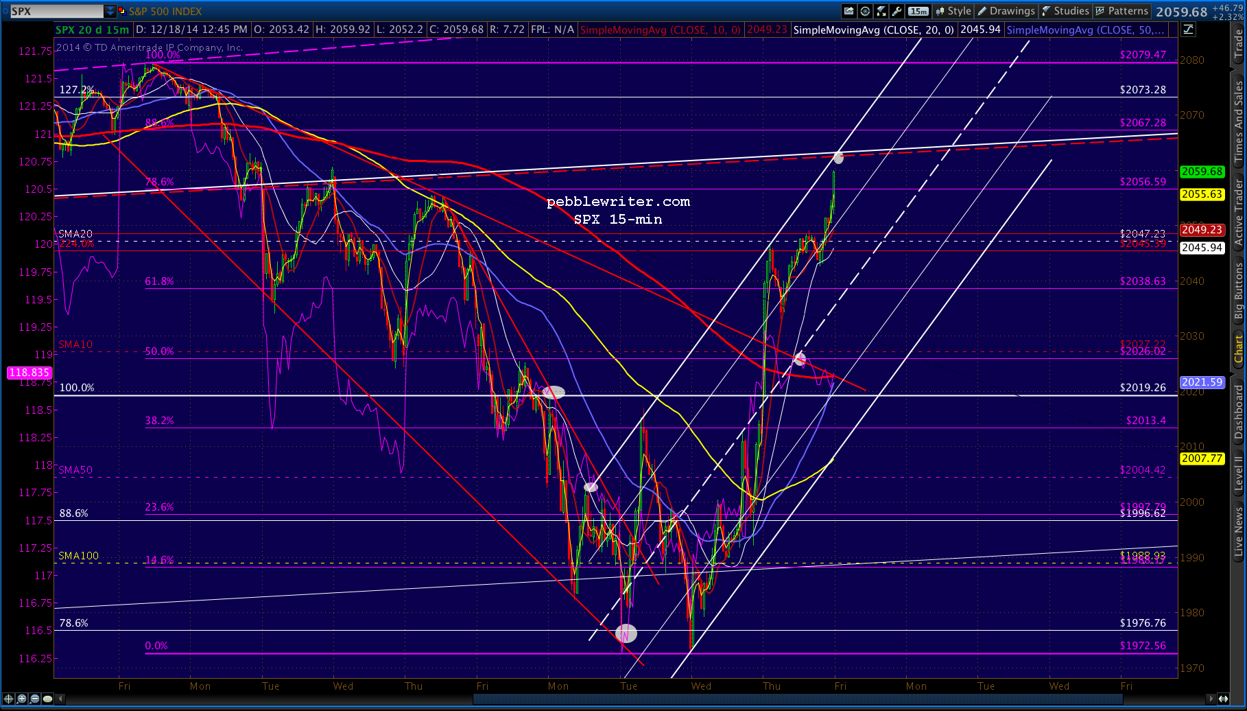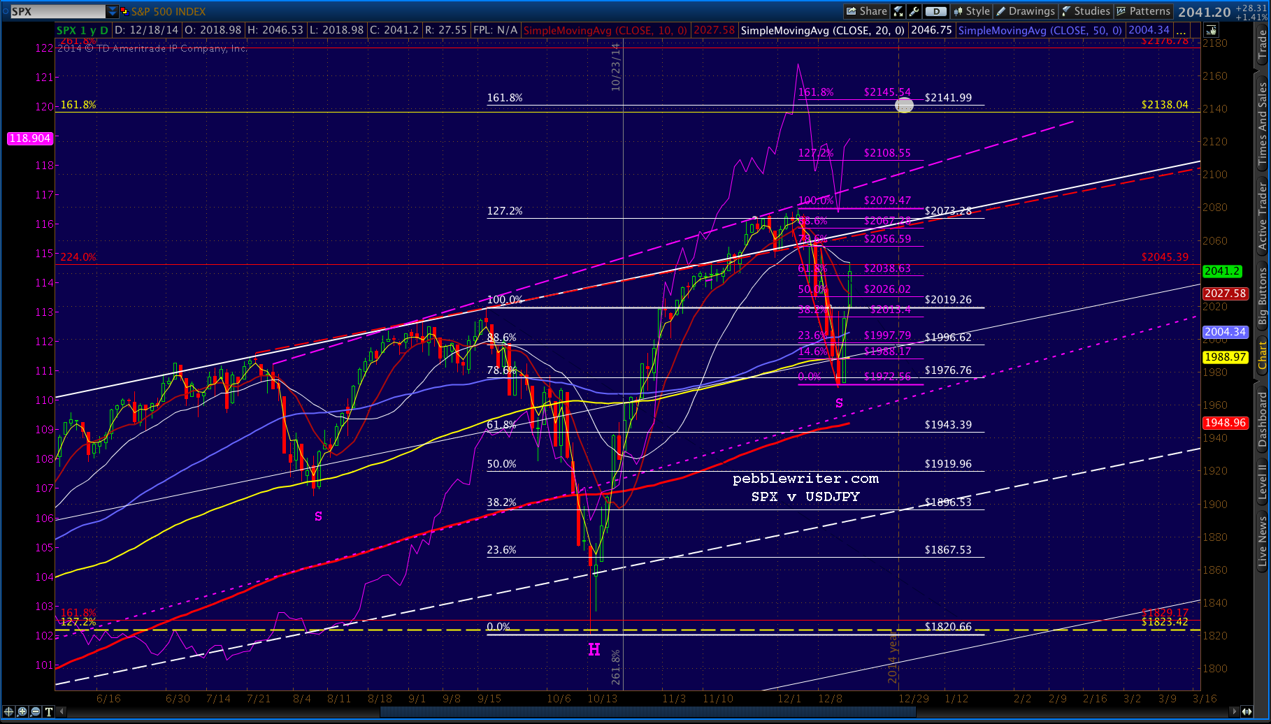As for the next two weeks, our 2138-2145 forecast is still intact. I believe it will either happen in the last week of the year with a push through all that Fib resistance based on central bank intervention (USDJPY ramp, VIX smash, etc.) or in early January, after the 2014 numbers are in the bank.