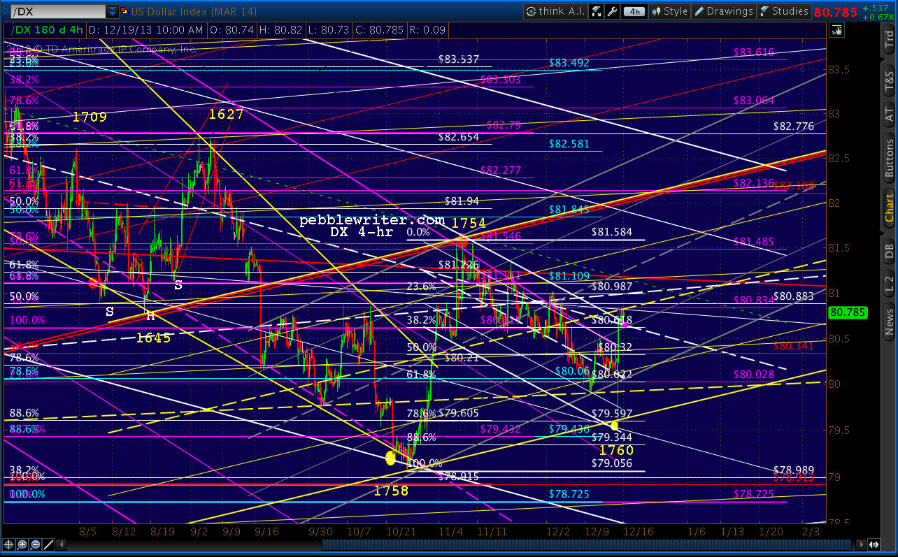 The dollar looks like it’s about to break out if it can get past the white midline and the yellow midline intersection. Note the SPX values in yellow on the chart: 1758, 1754 and now 1760 at the dollar’s last 3 turning points!