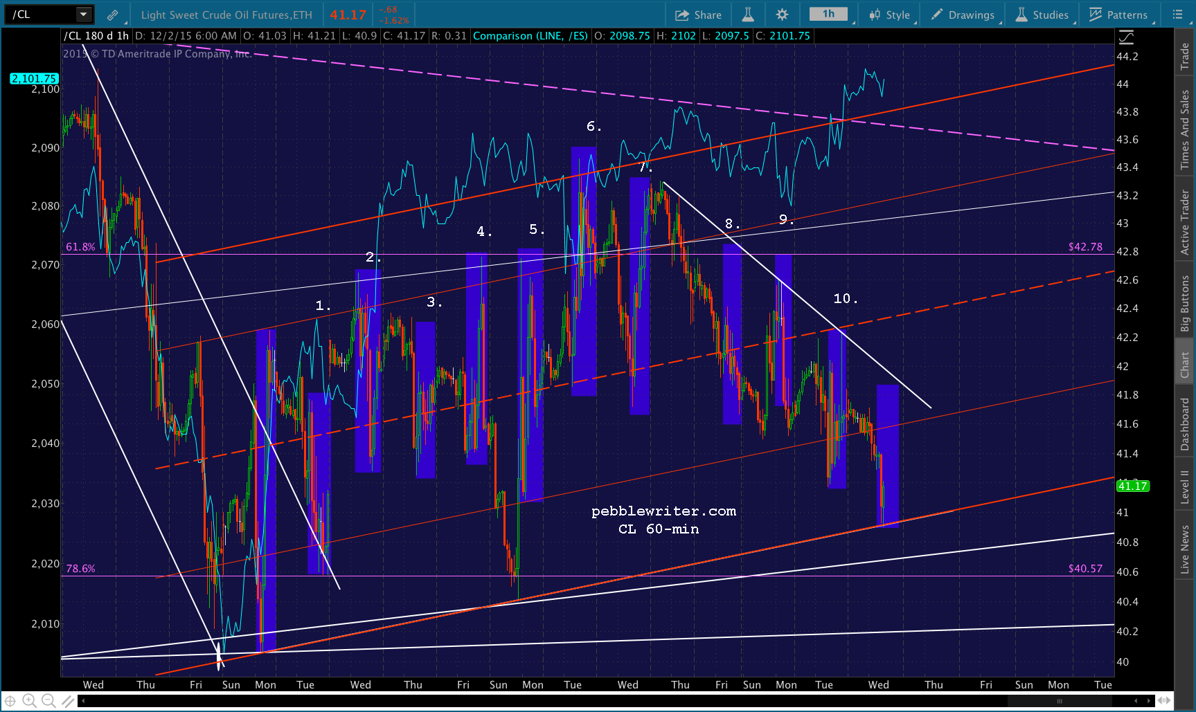 CL is back down to the TL connecting its recent lows. Will it make it back to the purple channel bottom in time for today’s close?