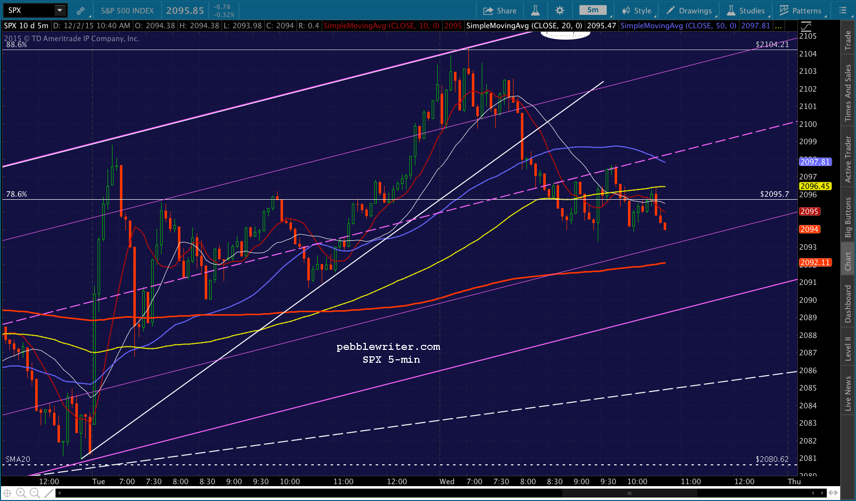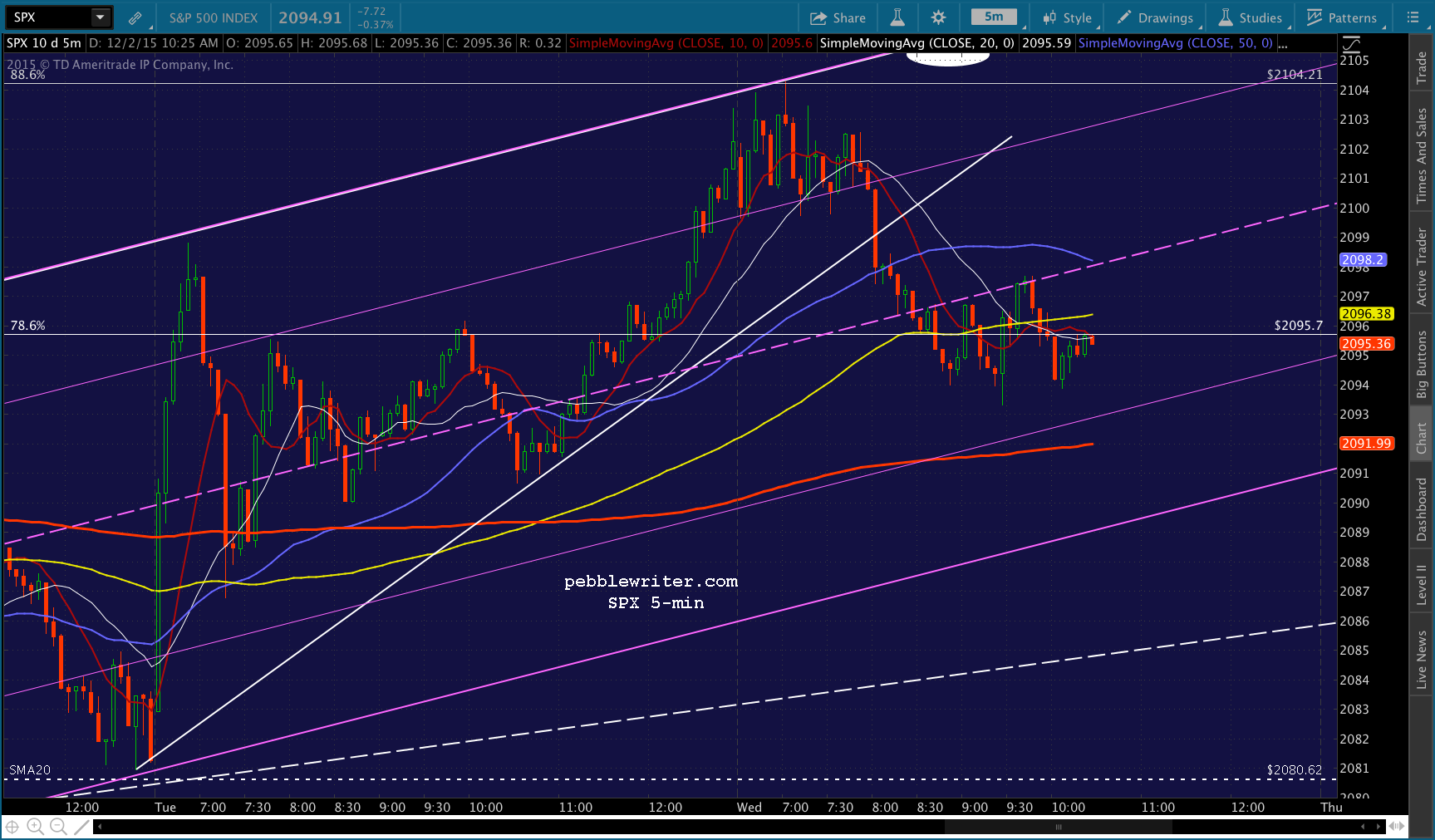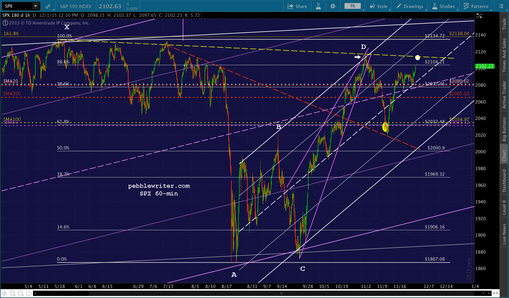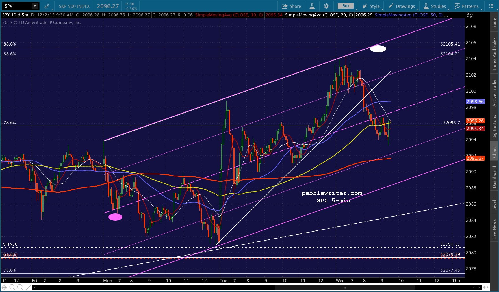 SPX has reached the .886 from the 2134-1867 decline — as well as a potential limiting TL from yesterday. At any point, it could turn and drop to the .786 at 2095.7. I hate to leave money on the table, but I’m not sure the payoff would be worth it at this point — especially since it could just keep riding the 5-min SMA10 (thin, red line) up to the more relevant .886 at 2105.41.