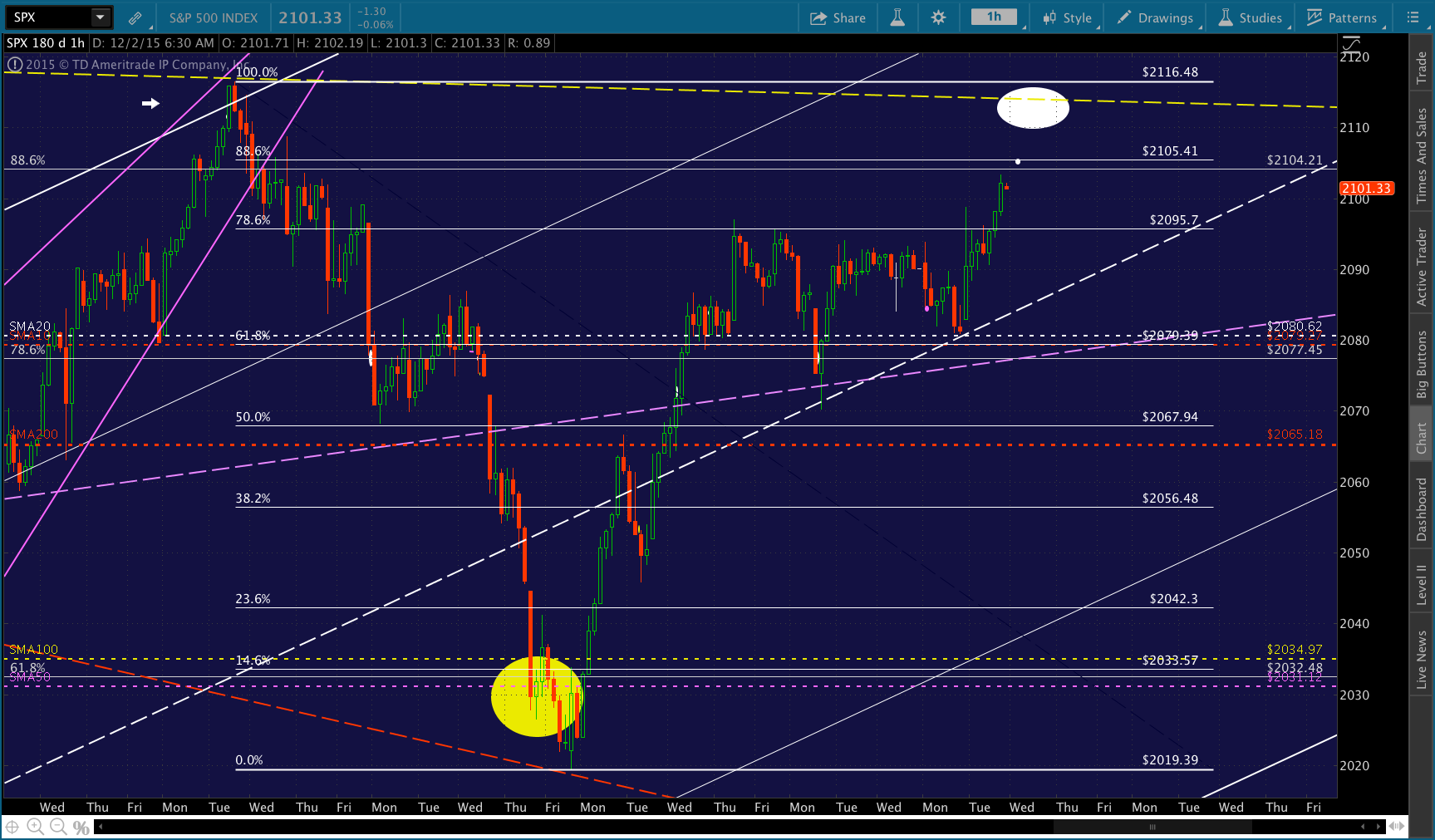 ES dipped below its white TL for a split second, and SPX almost tagged the SMA200. It’s back above the 2095.7 Fib, and will stay there if CL rebounds at 40.20 or so.